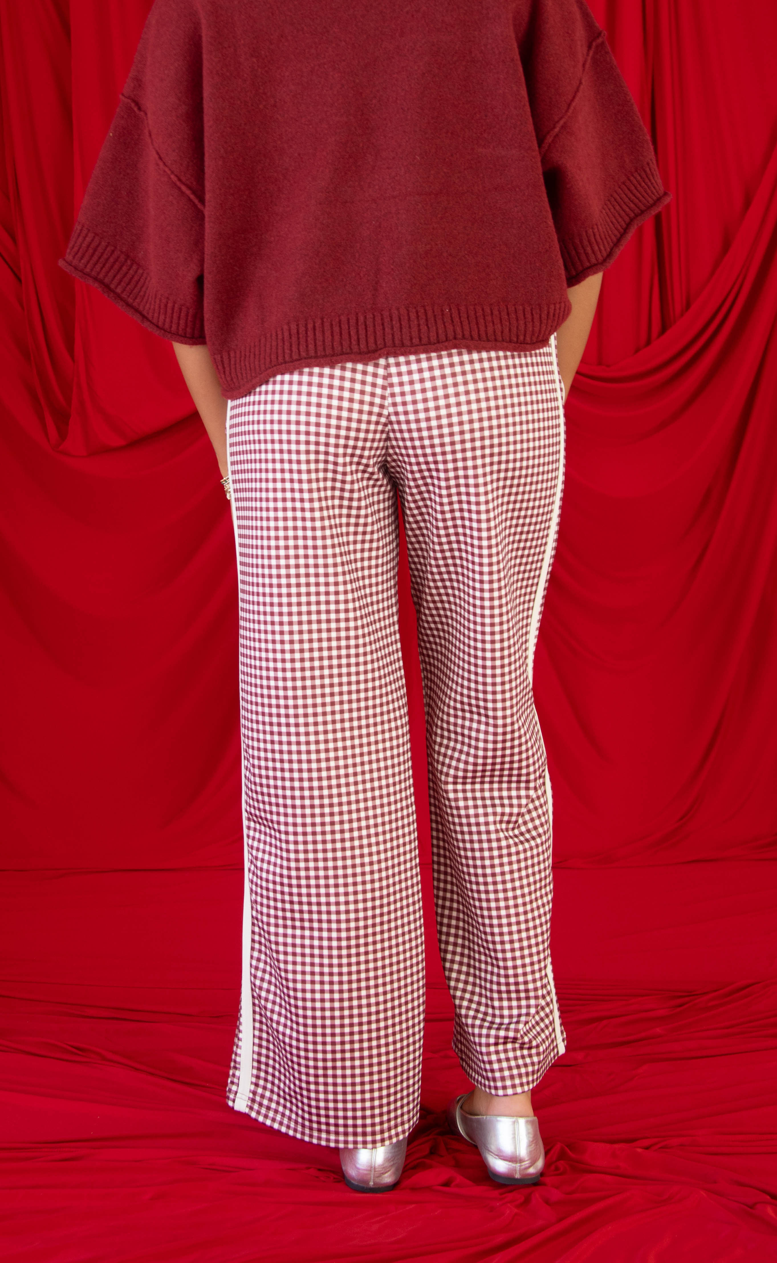 These burgundy gingham track pants bring a playful twist to an everyday favorite. Designed with a pull-on elastic waist, pockets, and a relaxed wide leg fit, they’re finished with a crisp white stripe down the side for a sporty touch. Comfortable, eye-catching, and easy to style, they’re perfect for lounging, casual outings, and Valentine’s season gifting.