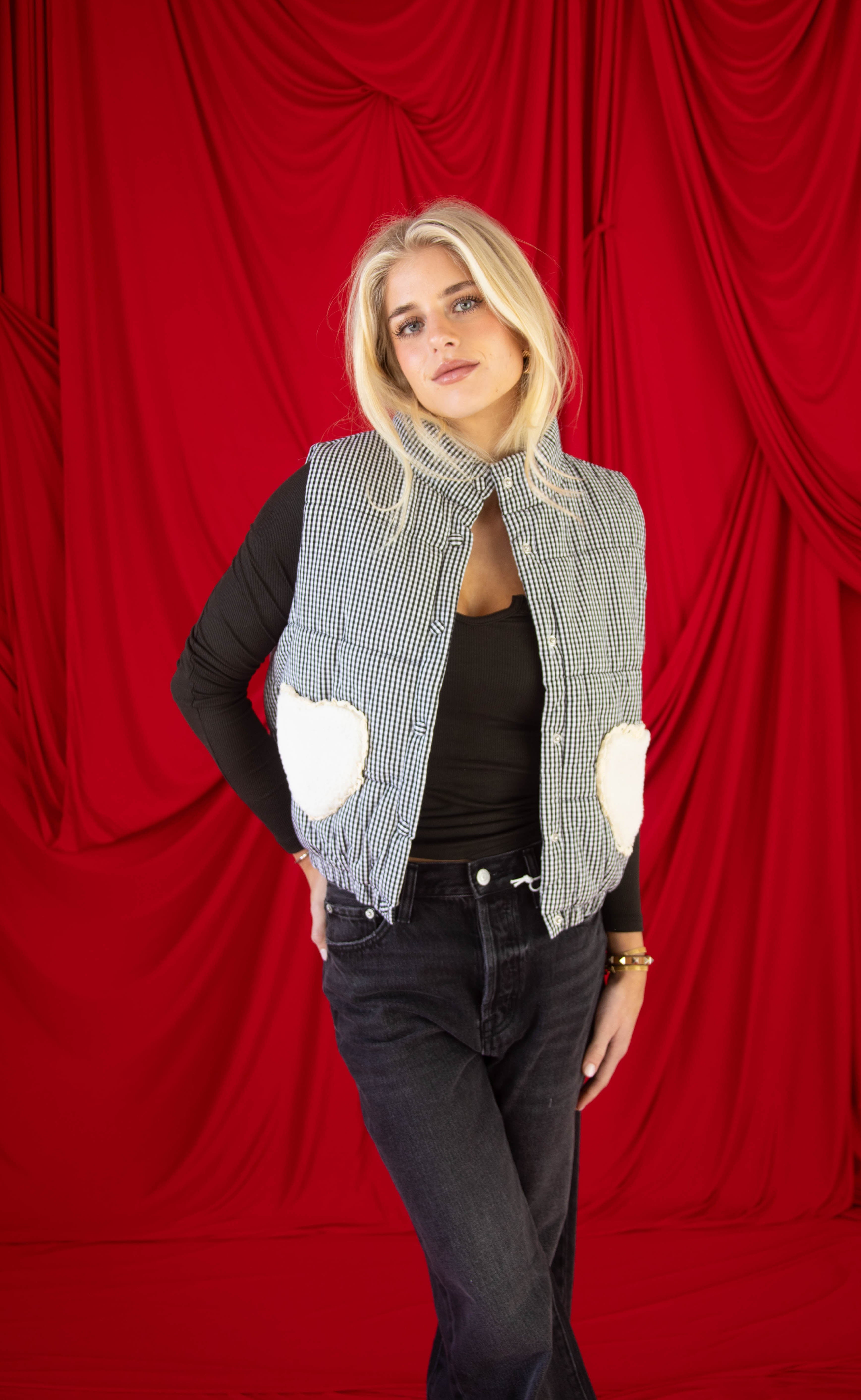 Add playful charm to your cold weather layers with this black and white gingham puffer vest. Featuring a snap-front closure and sherpa heart details outlined in delicate lace, it’s cozy, cute, and perfect for layering over sweaters, long sleeves, or even casual dresses for an extra touch of fall whimsy.