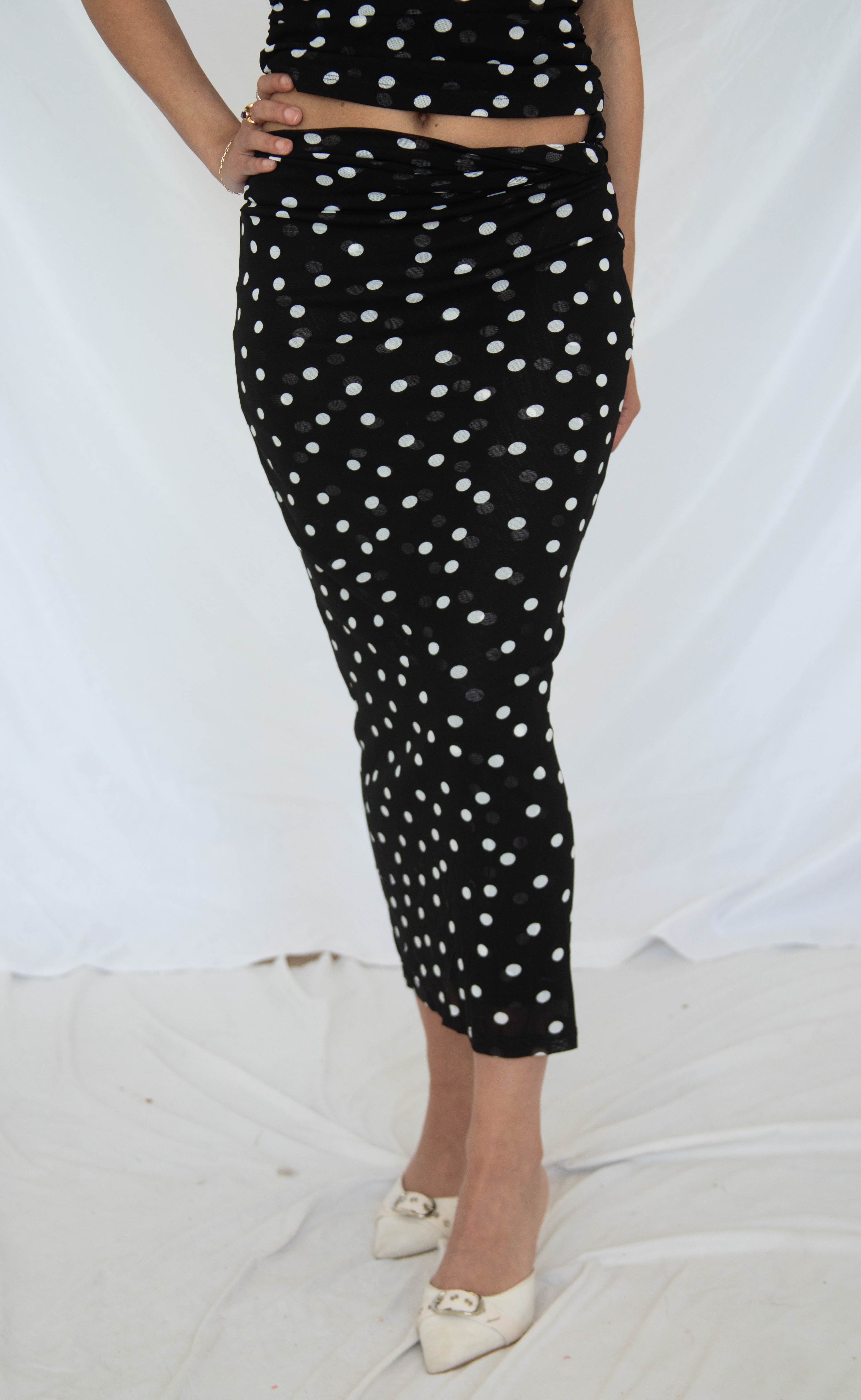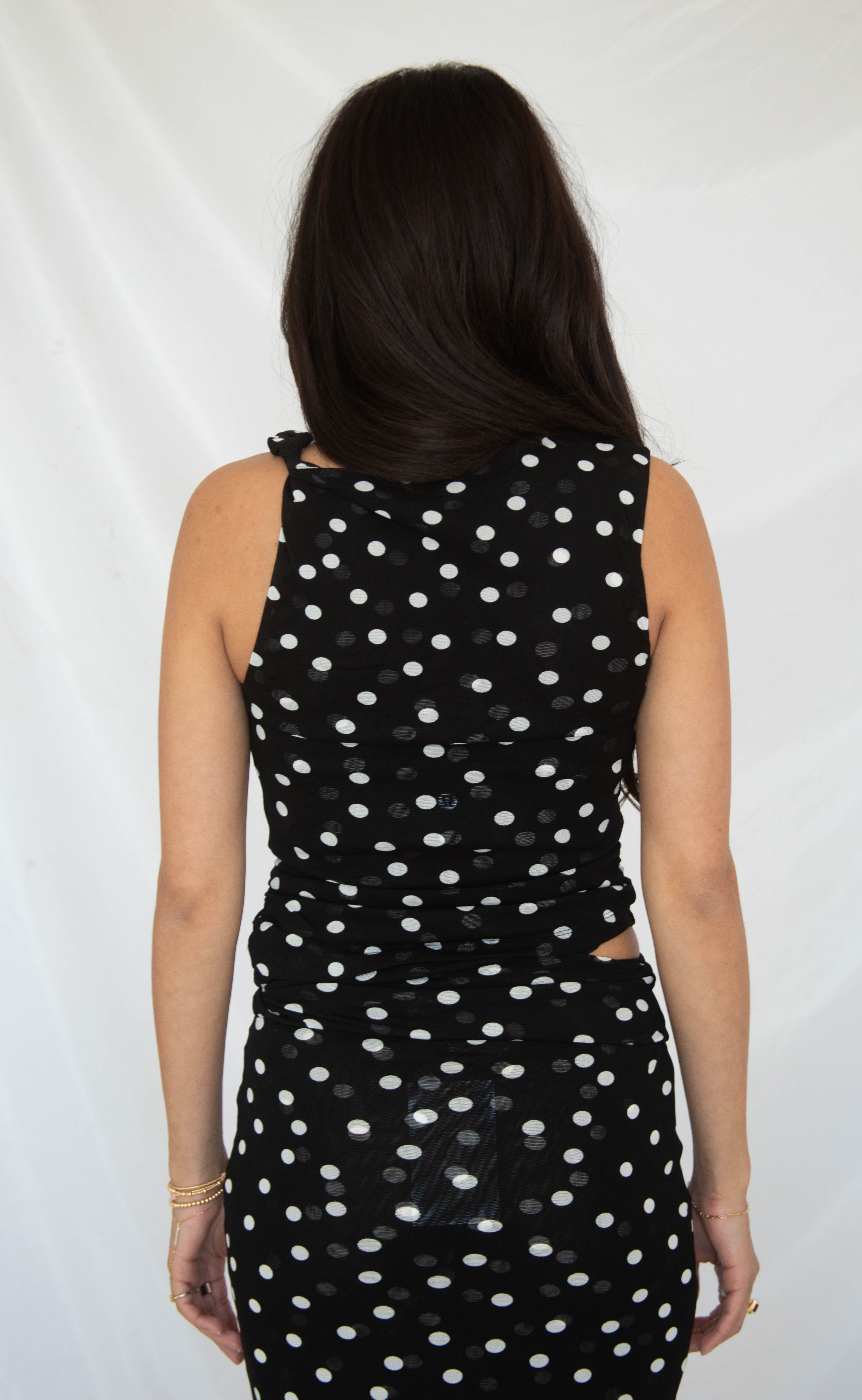 This black-and-white polka dot set is a playful yet sophisticated choice for holiday events. The sleeveless tank features ruched sides for a flattering fit, while the midi skirt’s side knot adds a touch of movement and charm. Together, they create a coordinated, effortlessly stylish look that’s ready for any festive occasion.