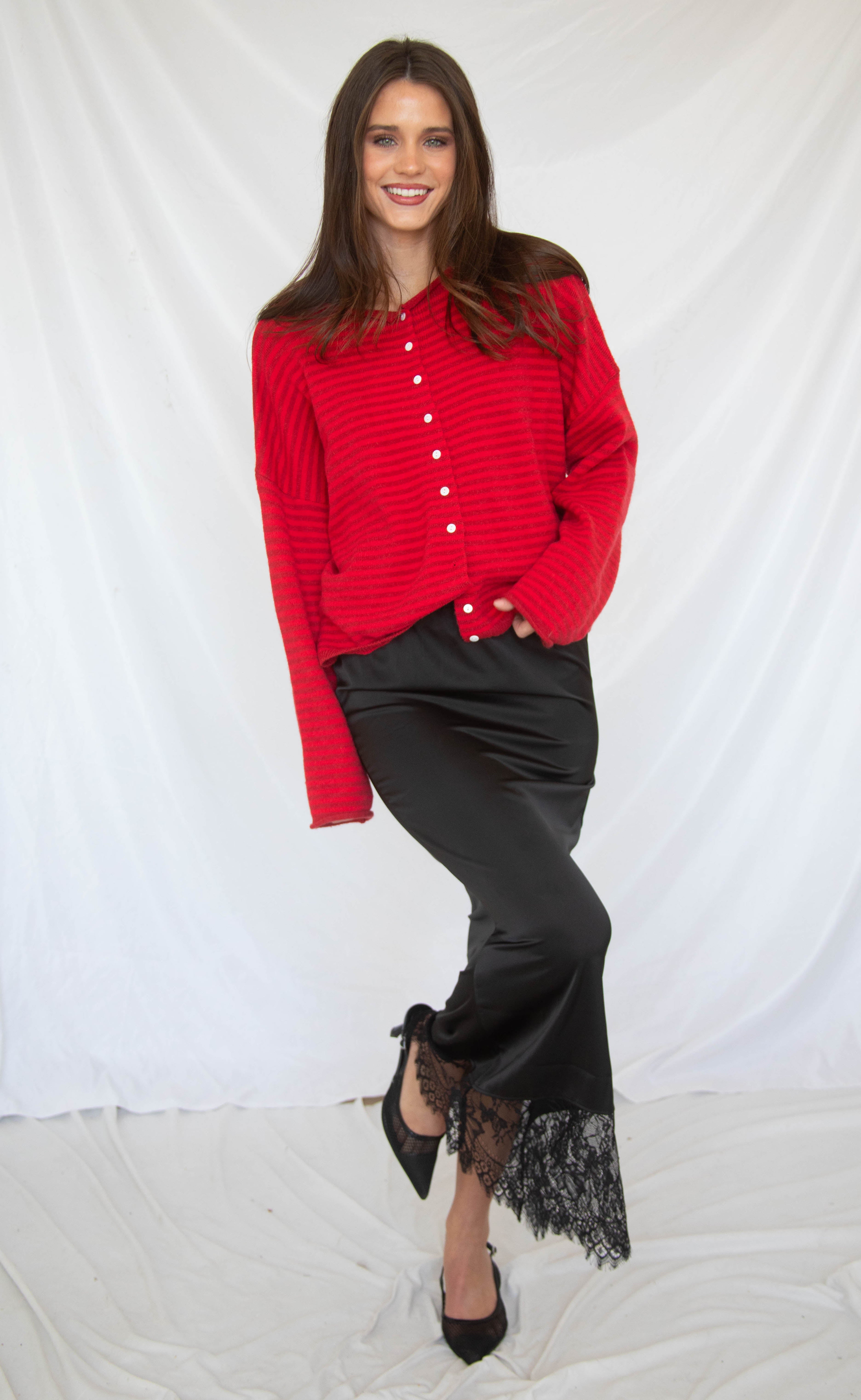 This black satin midi skirt brings a romantic edge to the Love Struck collection. Designed with delicate lace trim and a smooth, silky finish, it features a comfortable pull-on elastic waist for easy wear. Elegant, effortless, and made to feel special.
