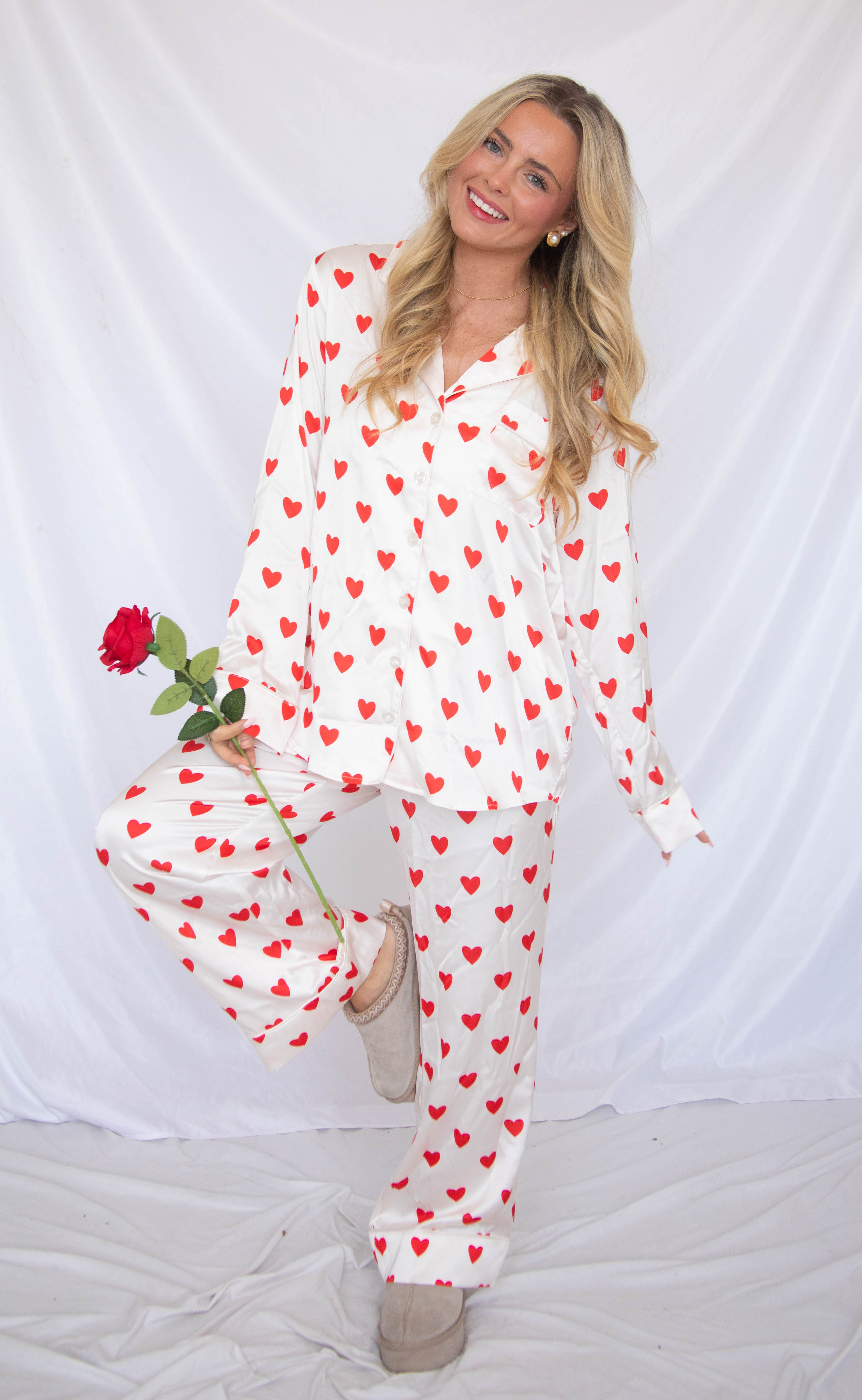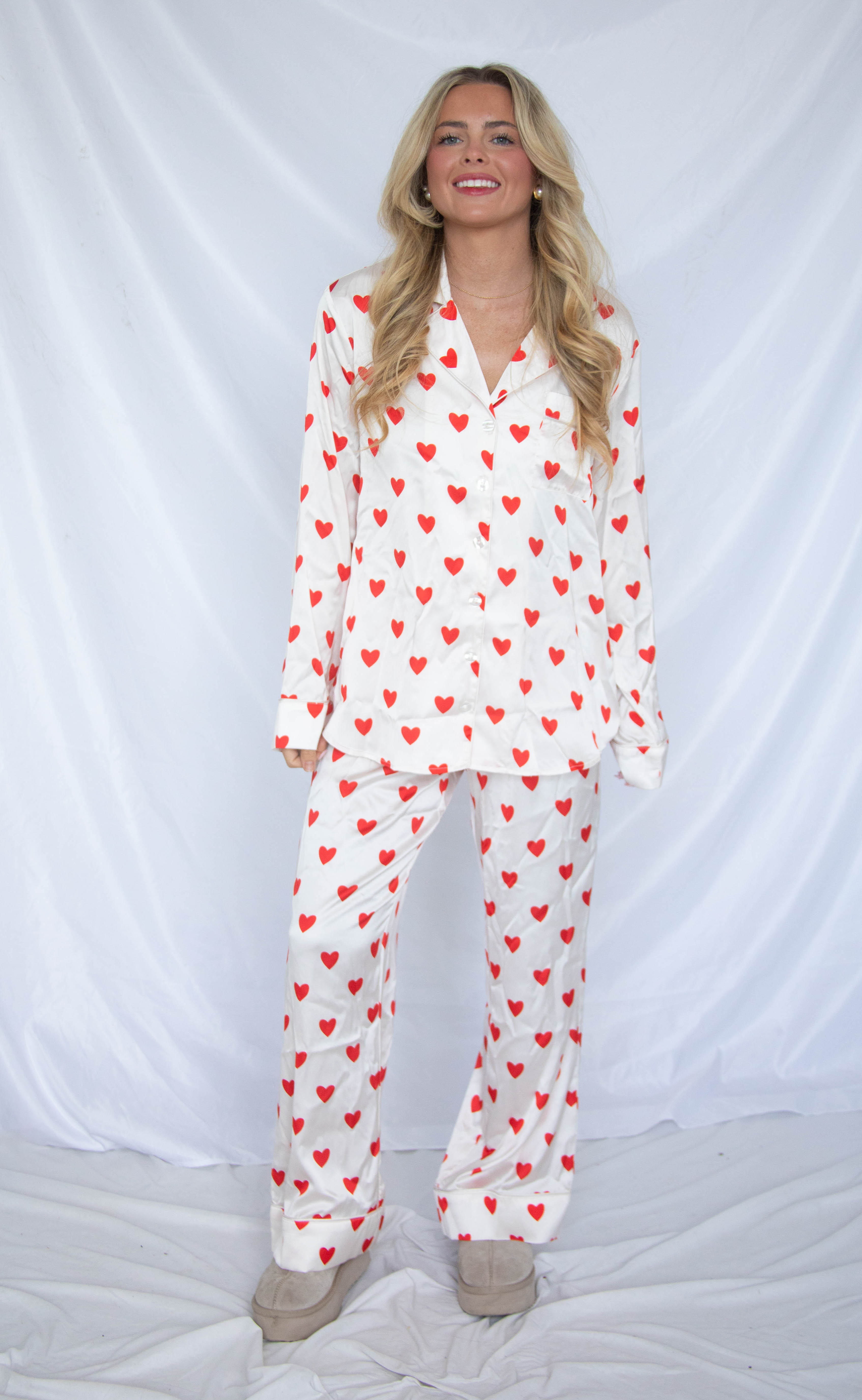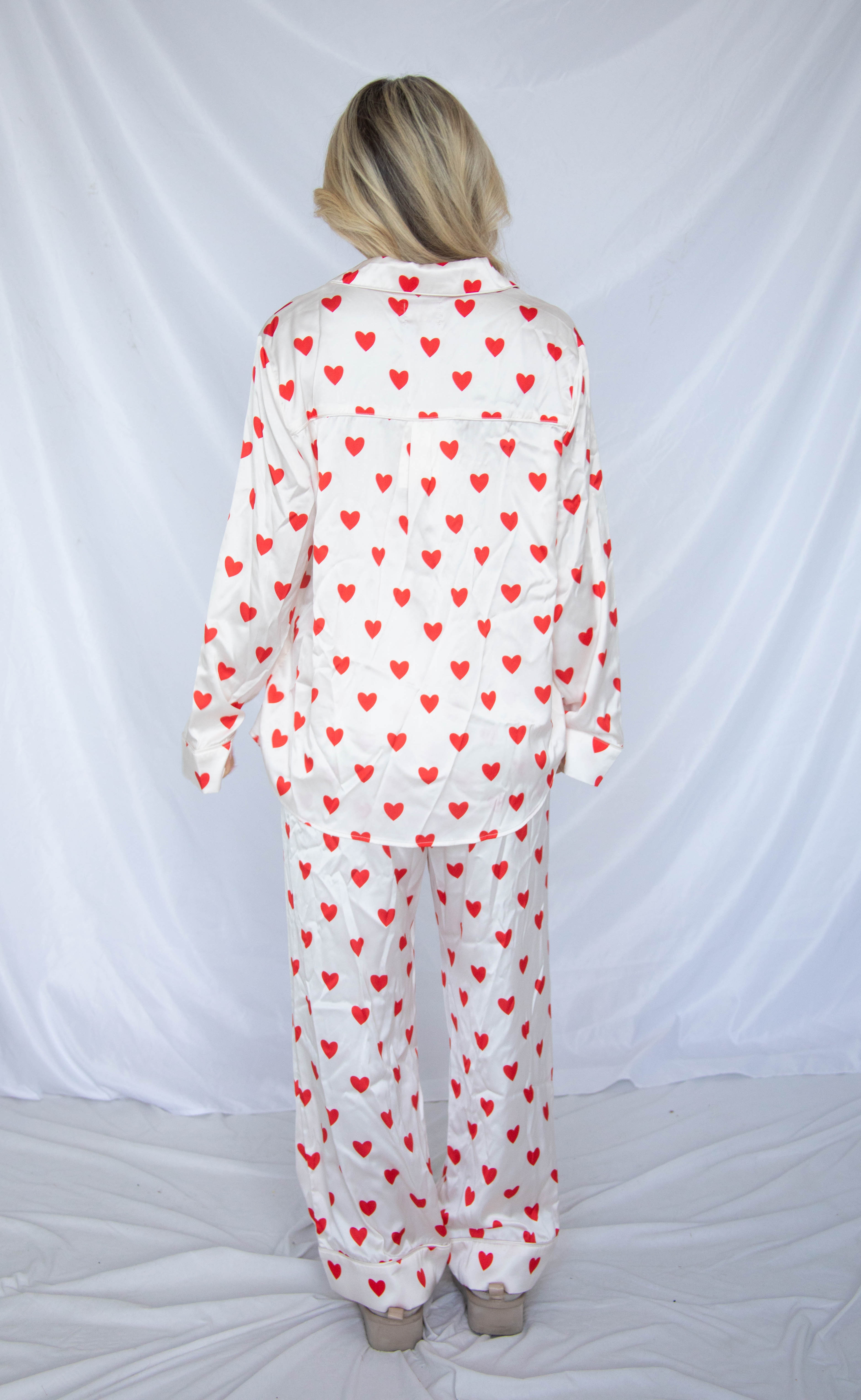 Sleep tight in these super silky button down pajamas! Sold as a set, these heart printed pjs have a drawstring and elastic waist.