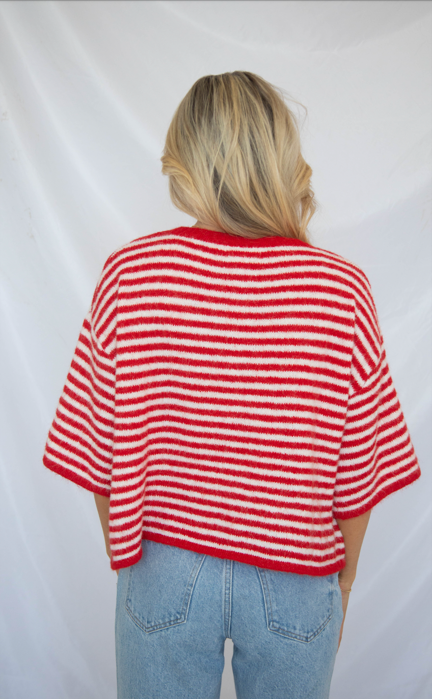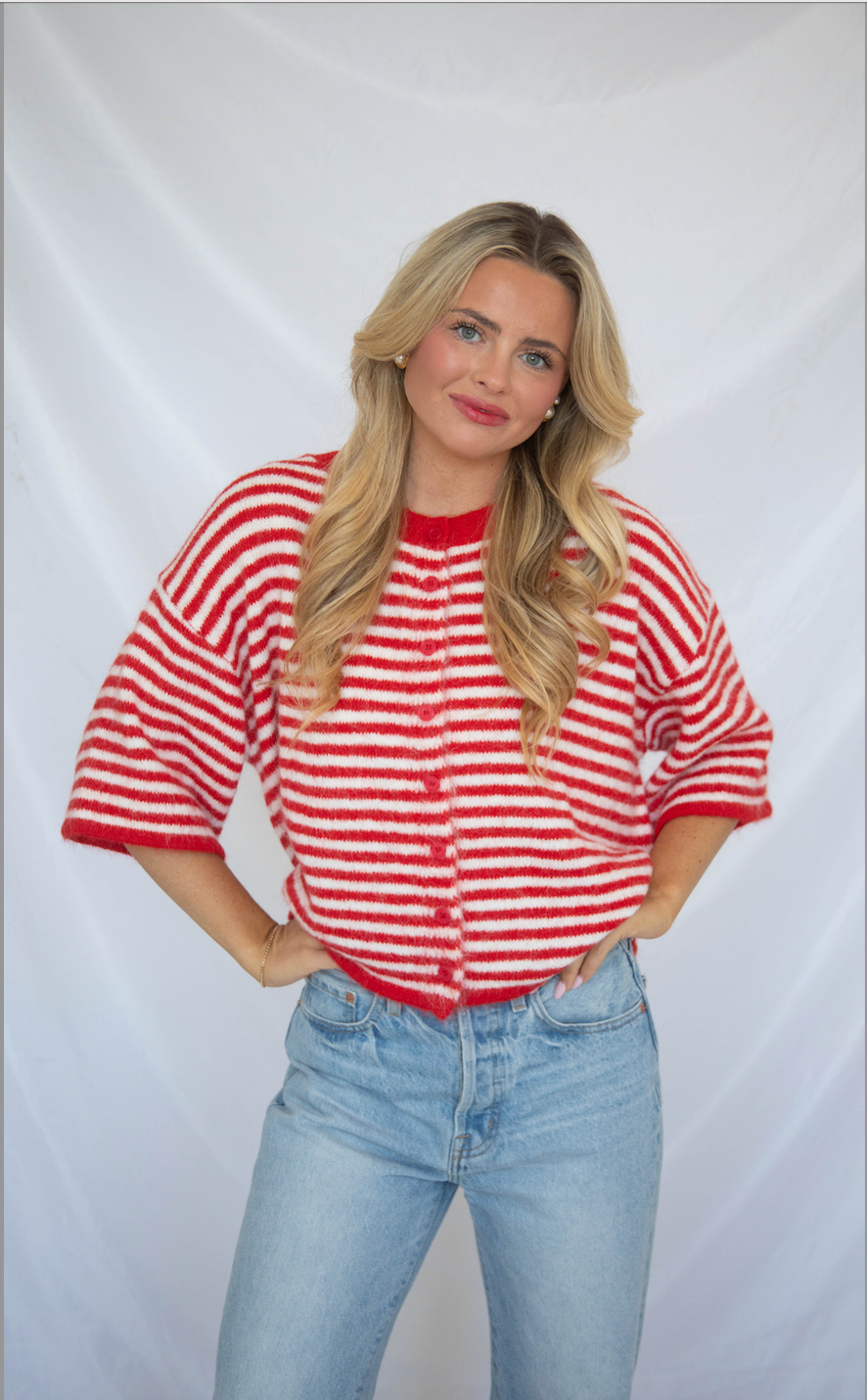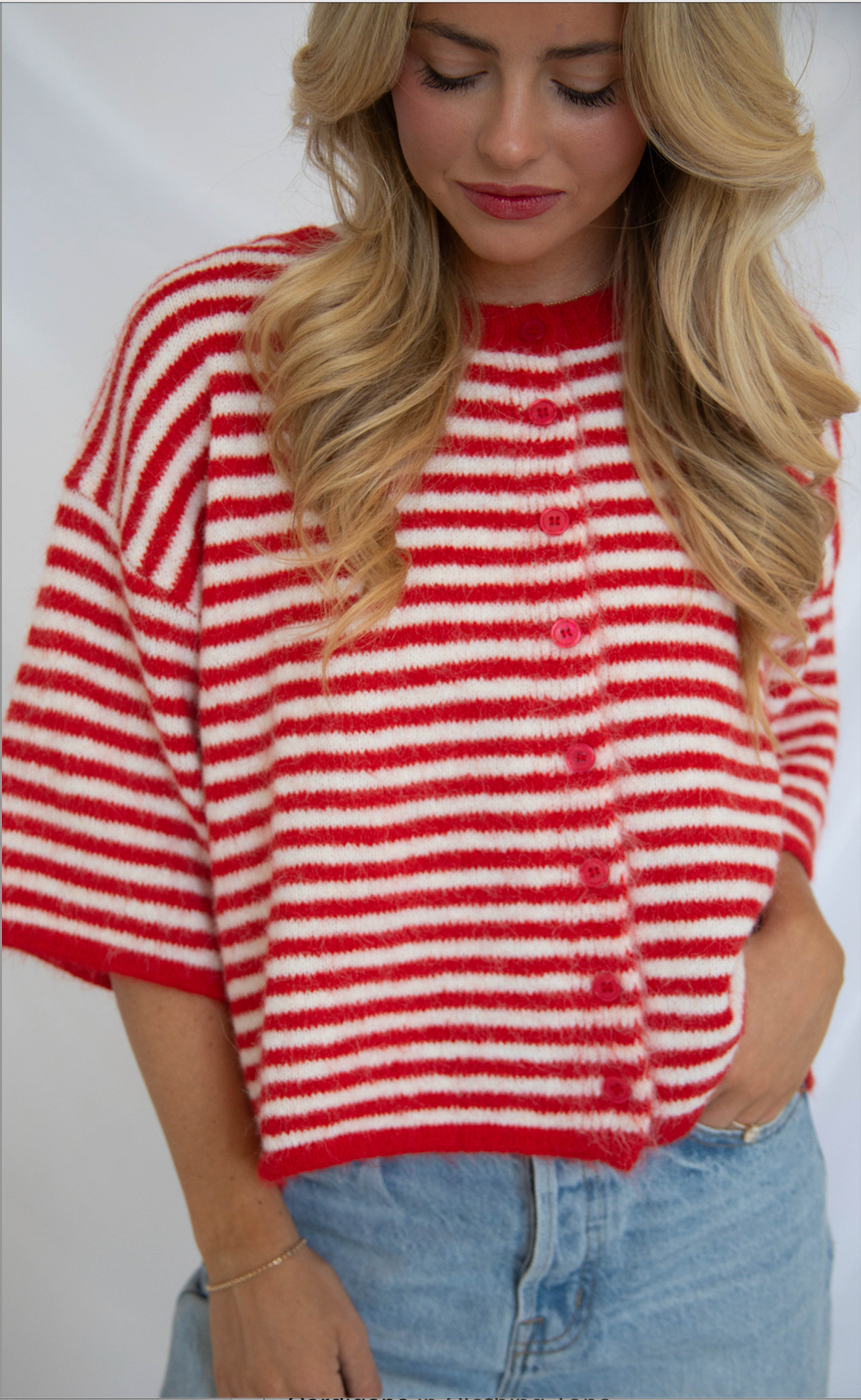 This boxy crewneck cardigan features short sleeves and a button-up front in cheerful red and white stripes. It's perfect for layering over long sleeves or wearing solo for a playful, look that feels effortlessly fun.