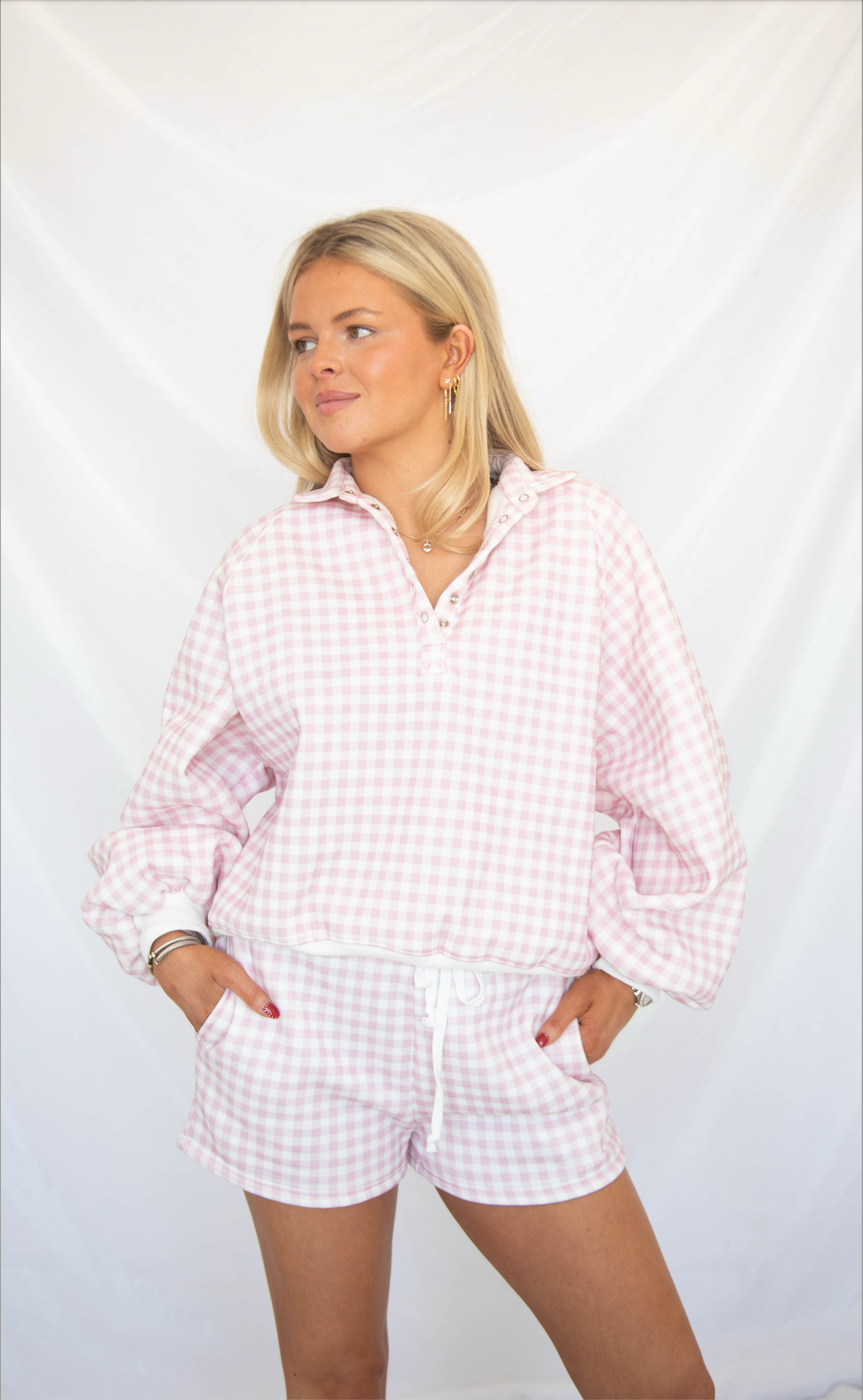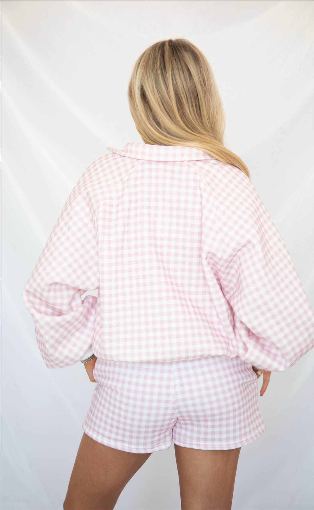 This pink and white gingham quarter-snap pullover blends playful pattern with an easy, relaxed silhouette. Designed with a structured collar, white ribbed hem, and a boxy fit, it’s comfortable, polished, and effortlessly cute.