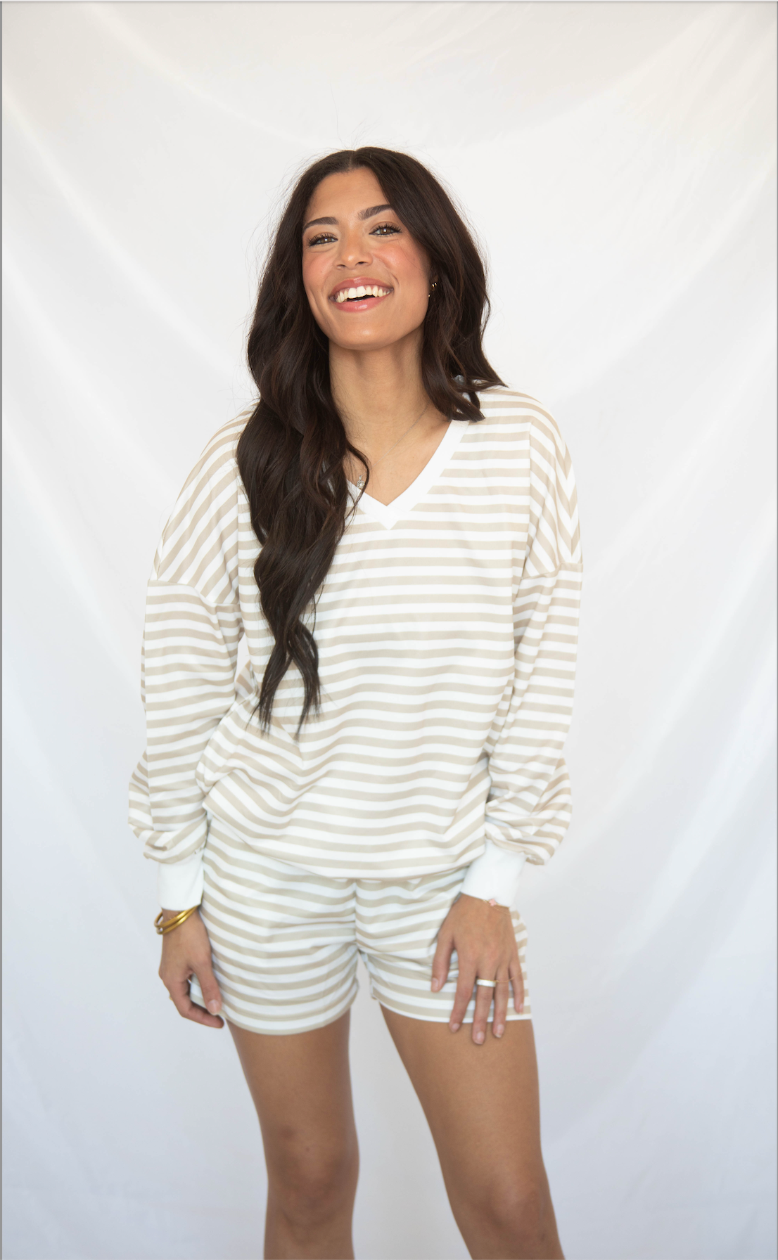 Meet your ultimate laid-back outfit. This beige striped two-piece set features an oversized V-neck long sleeve top and elastic waist shorts, blending comfort with casual style. Lightweight and versatile, it’s perfect for lounging at home, casual outings, or layering for cooler days.
