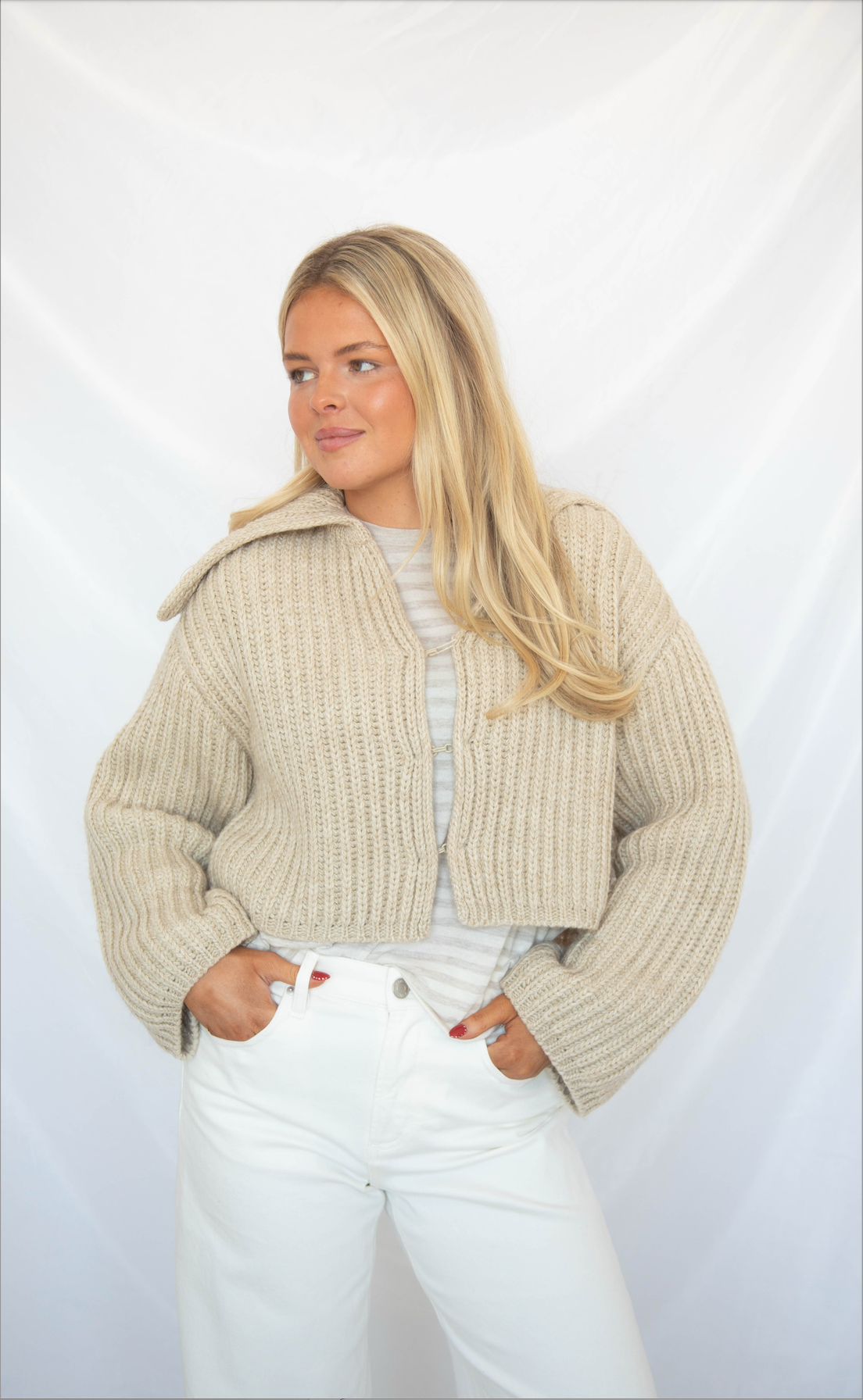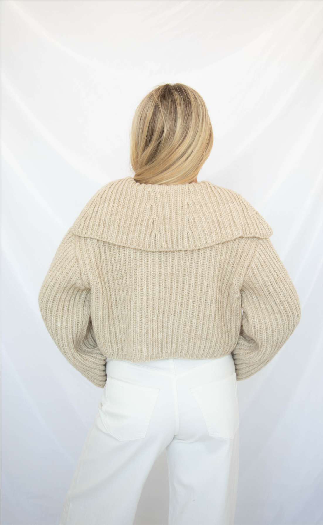 This beige chunky knit sweater features long sleeves, an oversized collar, a cropped fit, and a hook-and-eye front closure - perfect for layering over high-waisted jeans or skirts for an effortlessly stylish fall look.