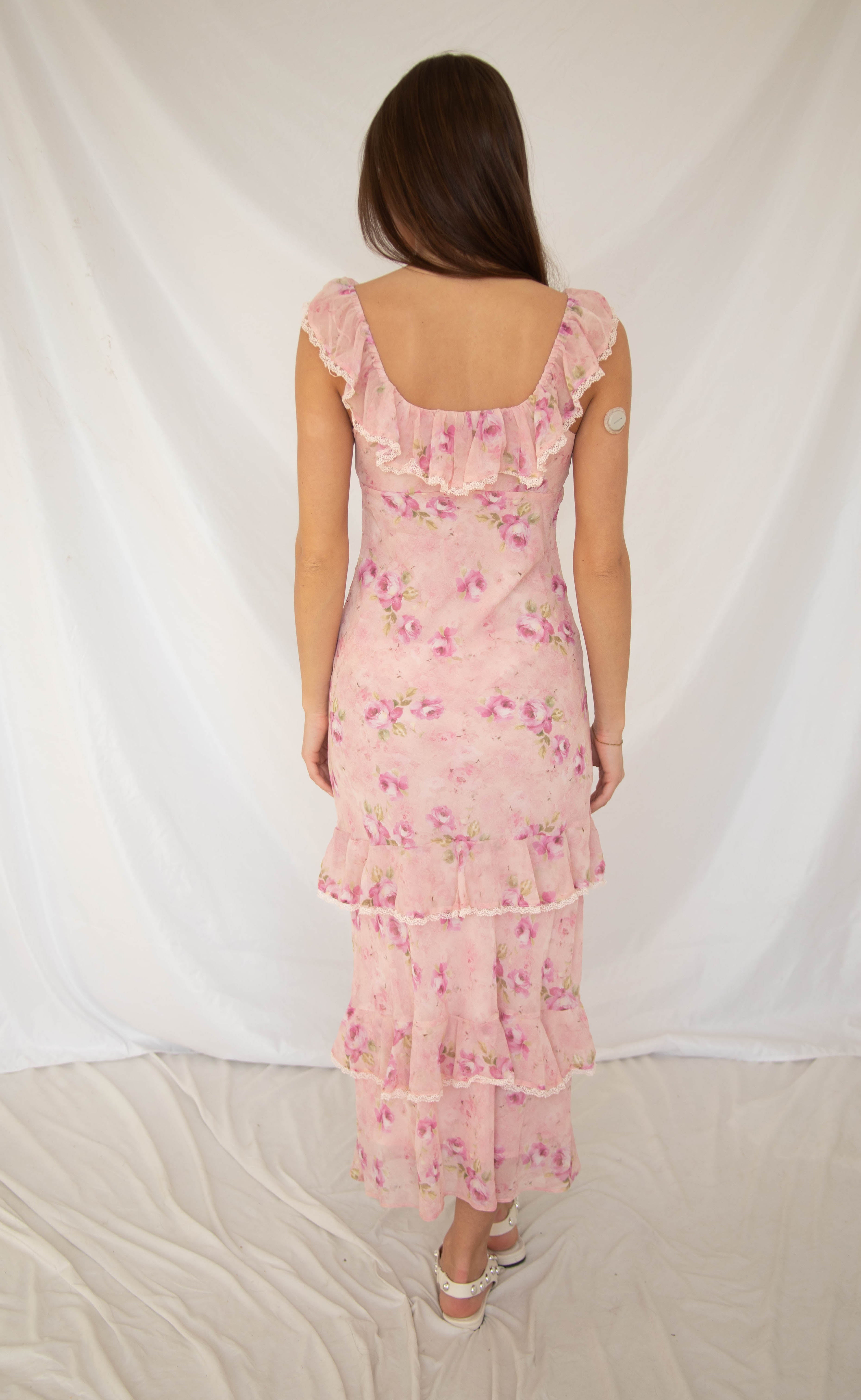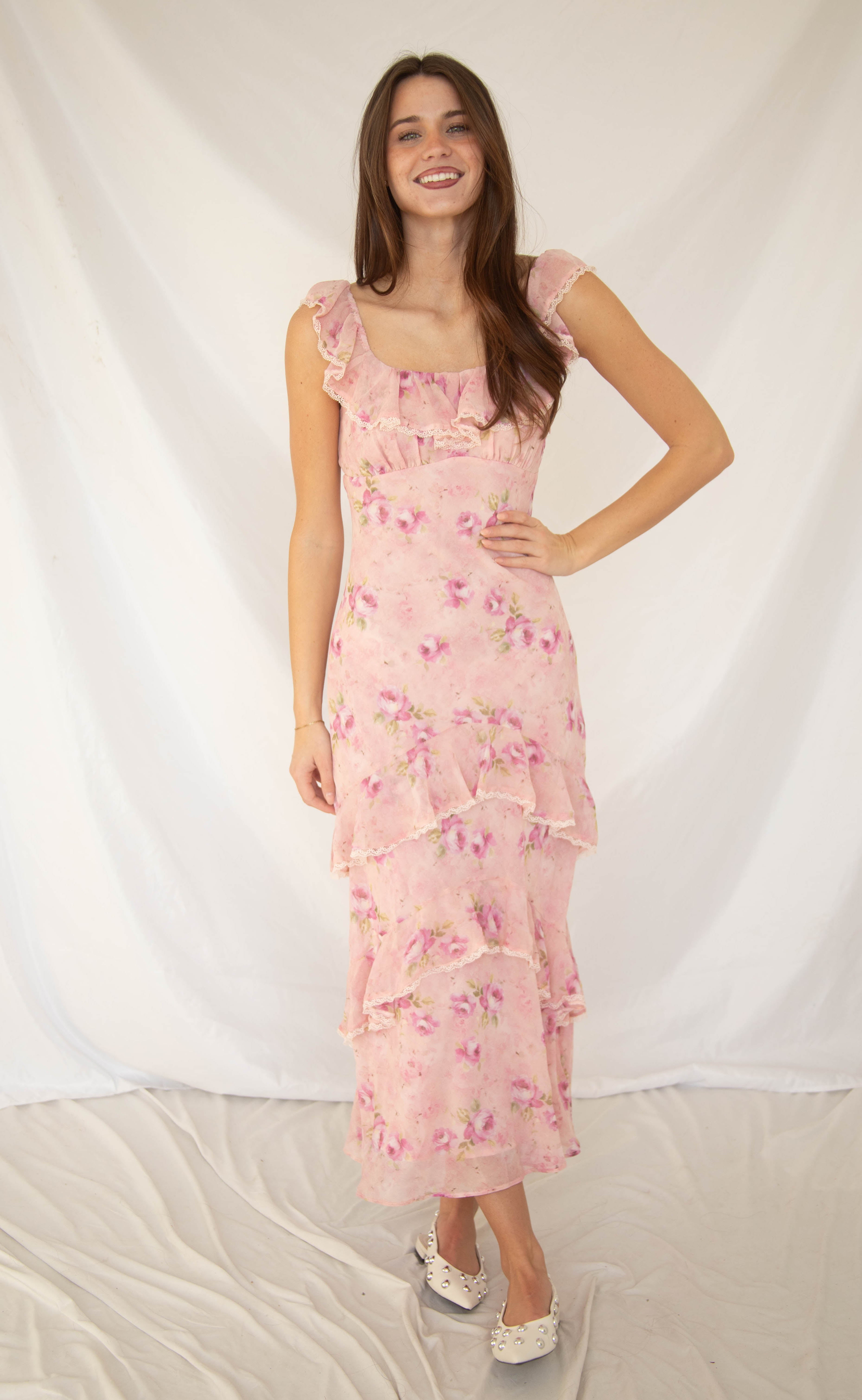 Float through spring in this pink maxi dress, featuring delicate lace-trimmed ruffles and a figure-flattering fitted silhouette. Light and feminine, it’s perfect for date nights or weekend garden strolls. Subtle details make this one a standout in a crowd.