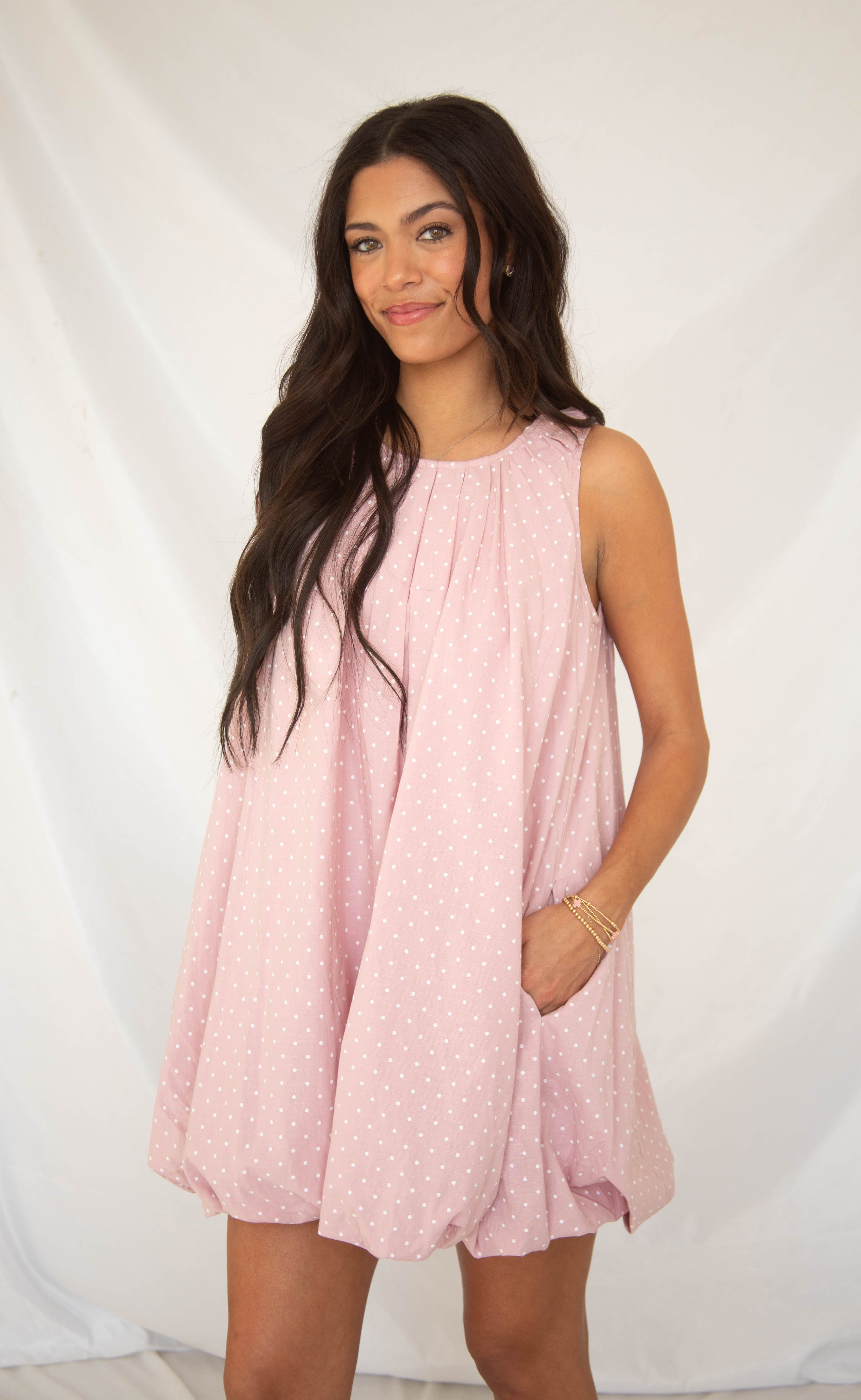 Playful pink polka dots get a flirty update with ruched shoulders and a bubble hem. The scoop neckline and breezy mini length make this dress effortless, fun, and ready for any sunny day outing.