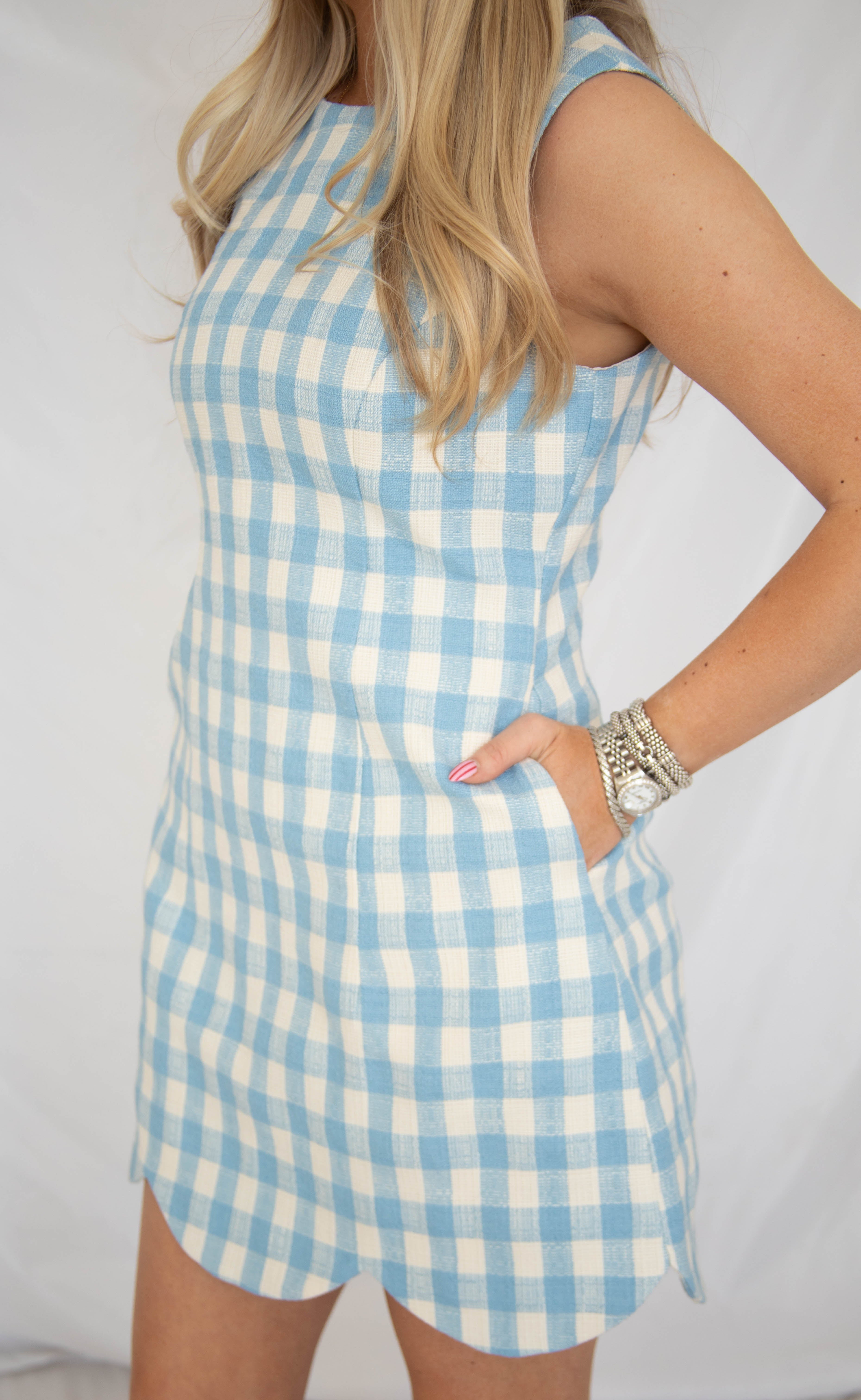 Timeless blue-and-white gingham gets a polished update in this sleeveless mini dress. A high neckline, fitted bodice, and scalloped hem create a classic, effortlessly chic look that’s perfect for brunches or sunny weekend strolls.