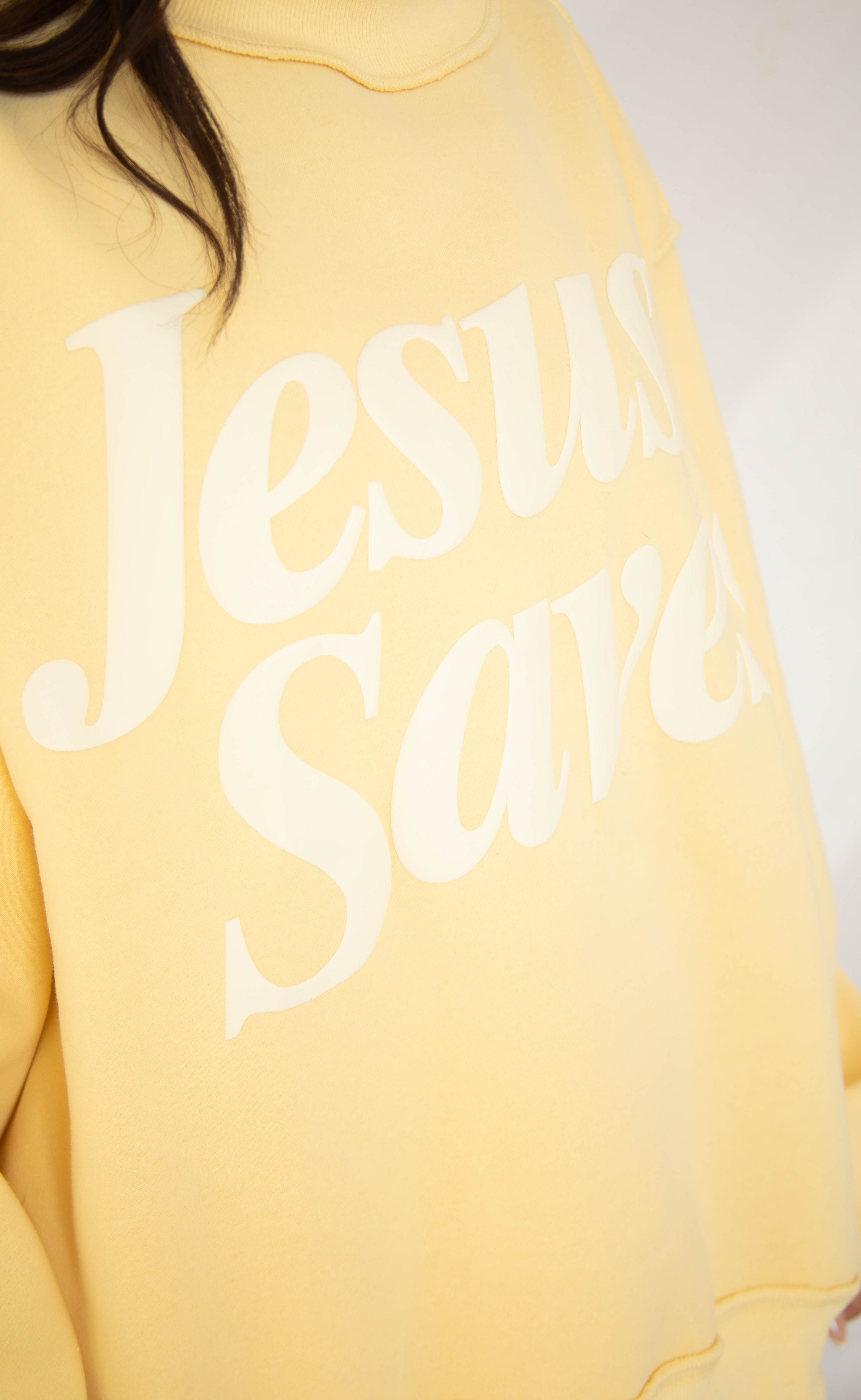 A fan favorite mock neck now in butter yellow with "Jesus Saves" in puff ink! It's an adorable spring staple.