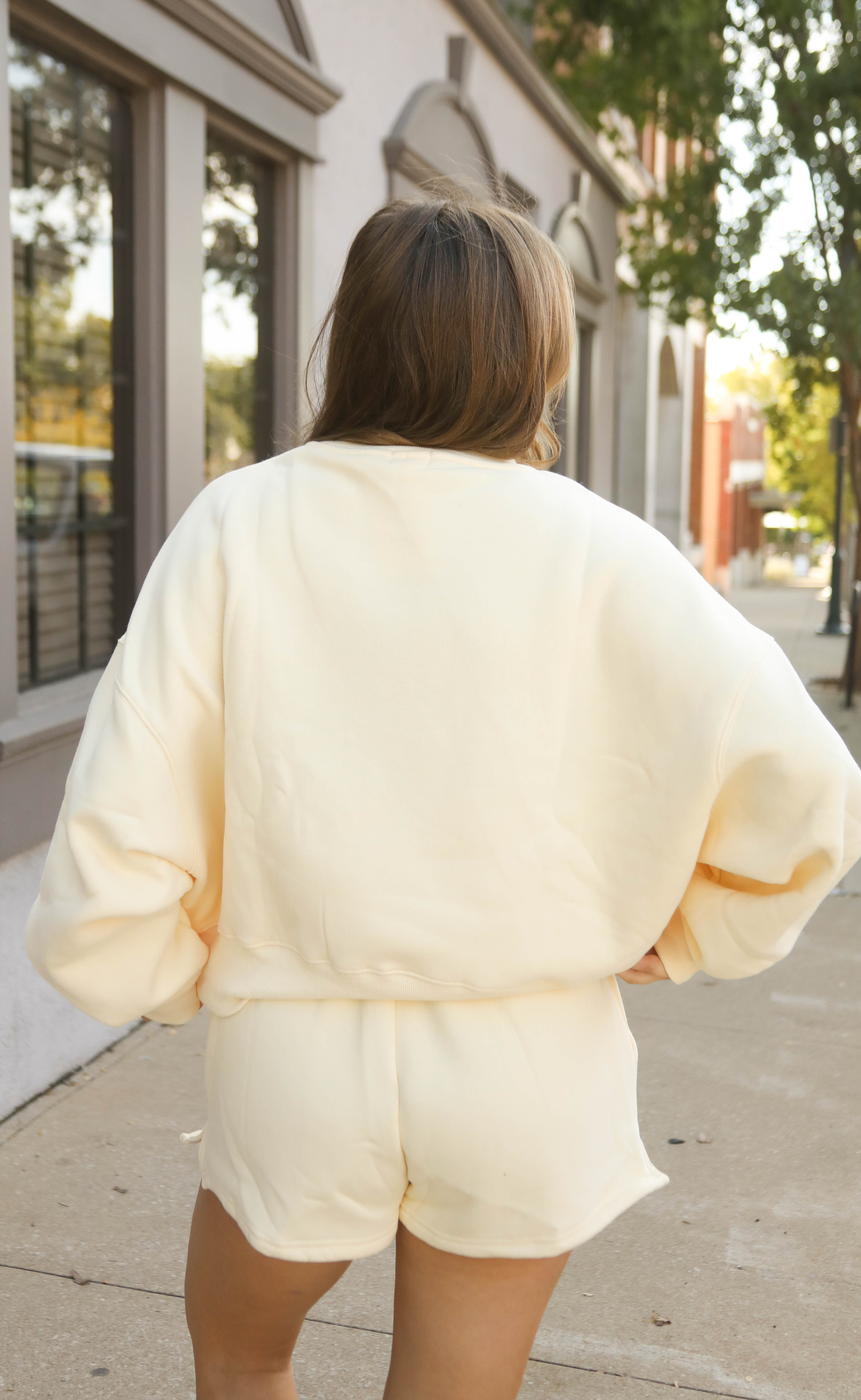 The Crash Into Me Set in buttery yellow brings effortless comfort with pull-on elastic waist shorts and a boxy, slightly cropped long sleeve crewneck sweatshirt. Cozy and cute, this set is perfect for relaxed days or casual outings.