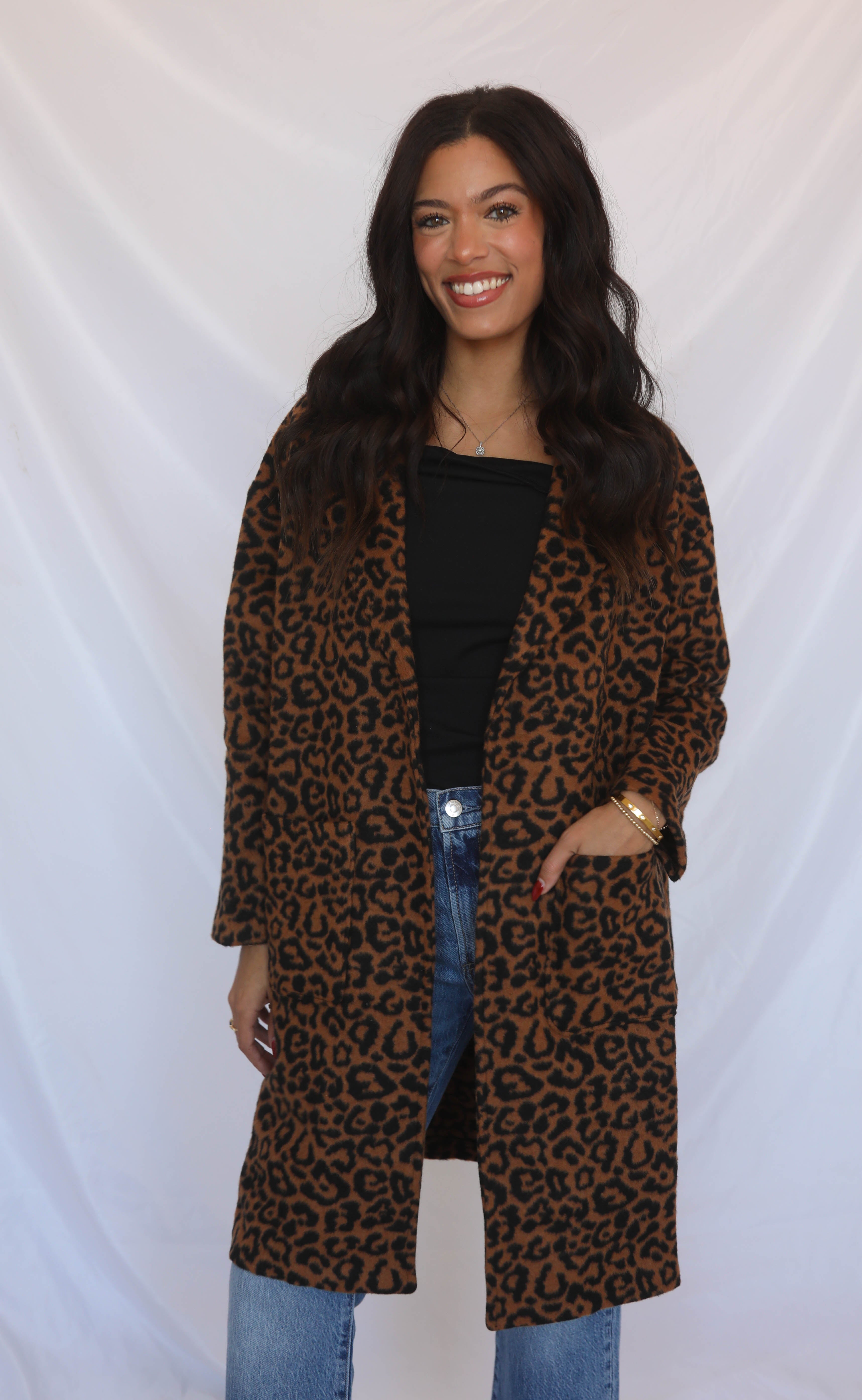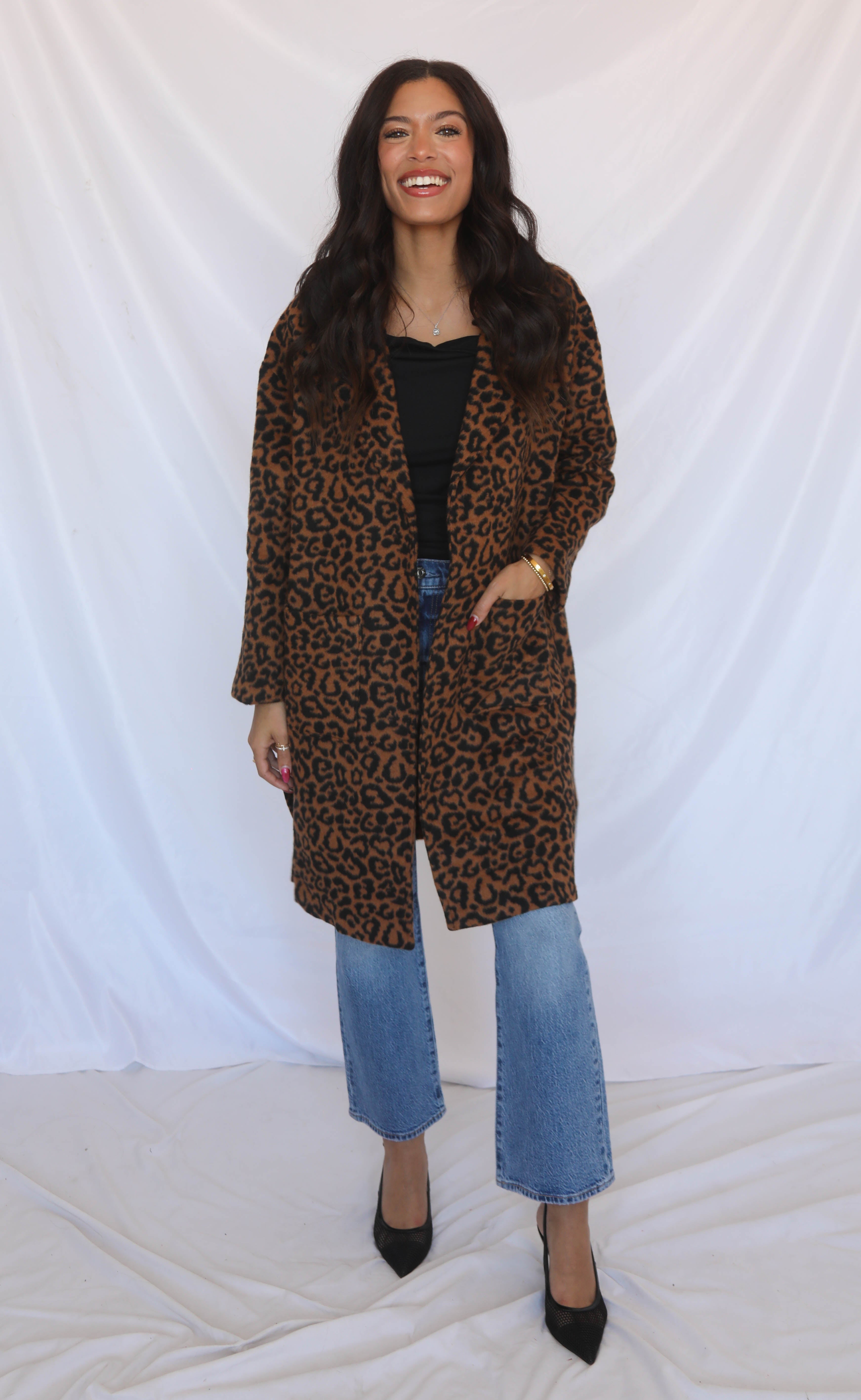 Make a bold entrance with this chic leopard print jacket. Designed in a flattering mid-length silhouette, it features an open front, structured lapels, and that effortlessly luxe, throw-on-and-go vibe. Warm, statement making, and perfect for fall layering!