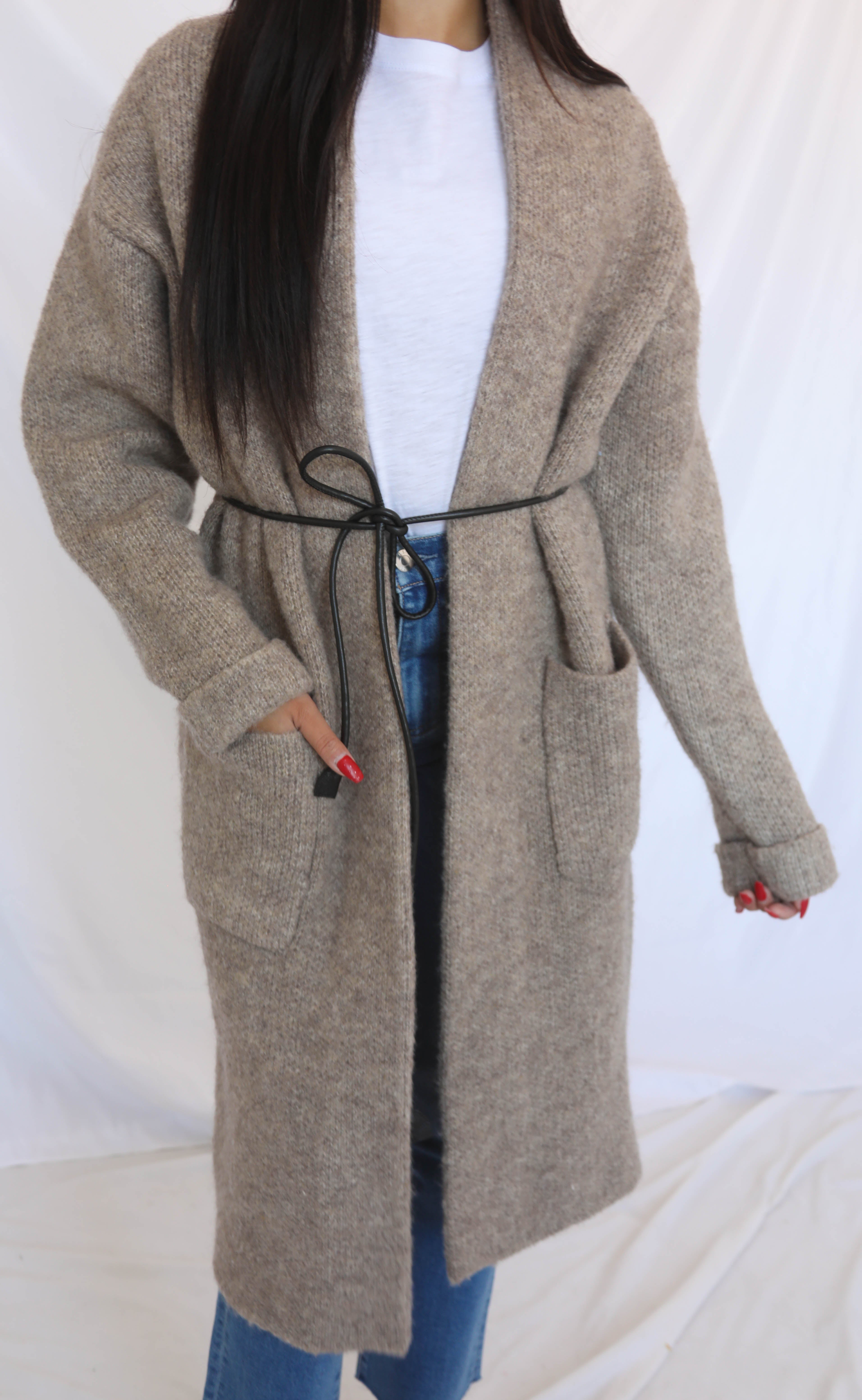 Talk about style and comfort! The Noor Sweater from ASTR is a taupe colored midi length open front cardigan with a removable tie belt closure. Wear casually over your athleisure or sweat set or dress it up over denim and a bodysuit.