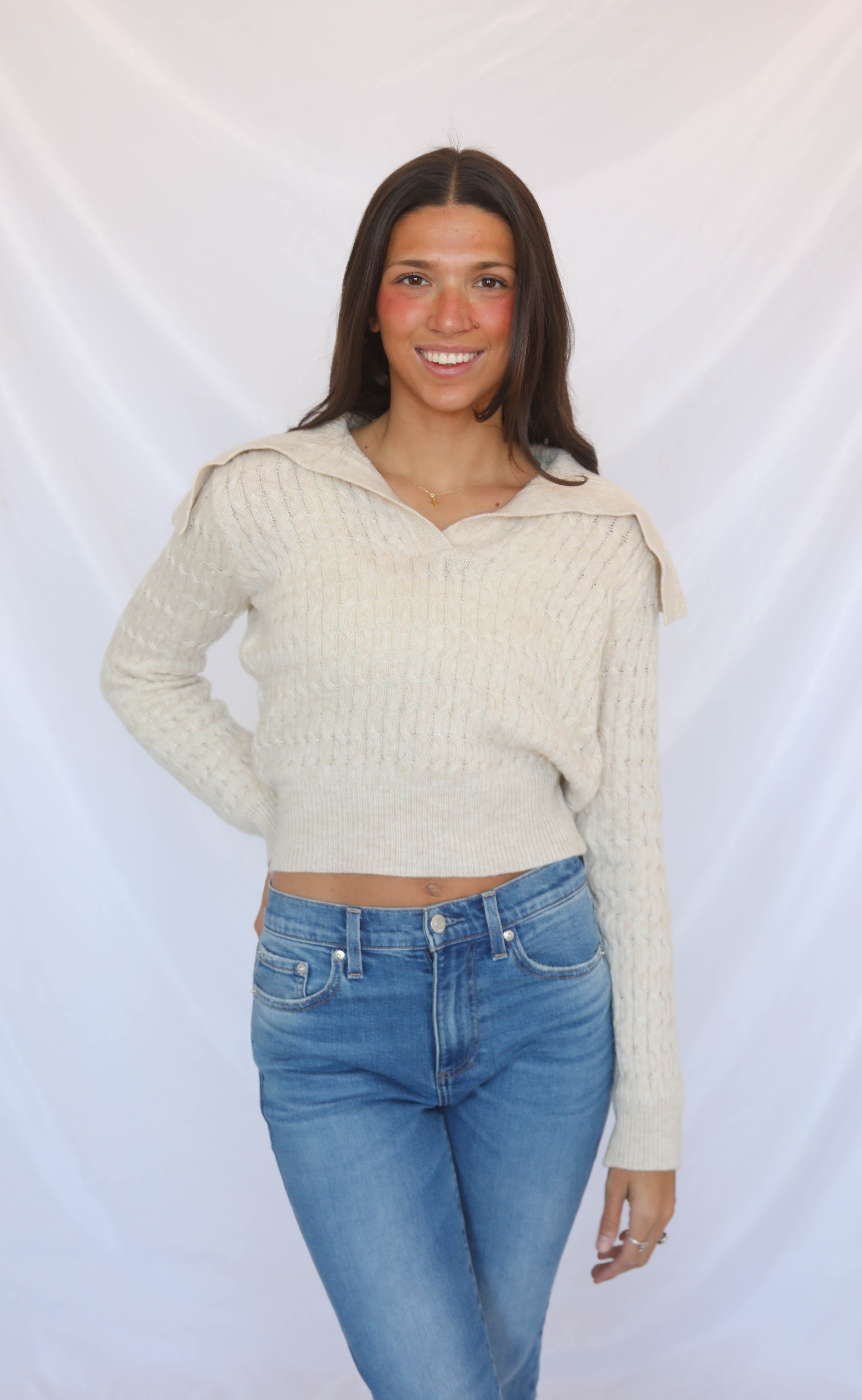 The Xanthe Sweater from ASTR is a beautiful cable knit wool blend sweater with an oversized collar and slightly cropped hem. Style it with denim or dress it up with a black leather mini skirt.