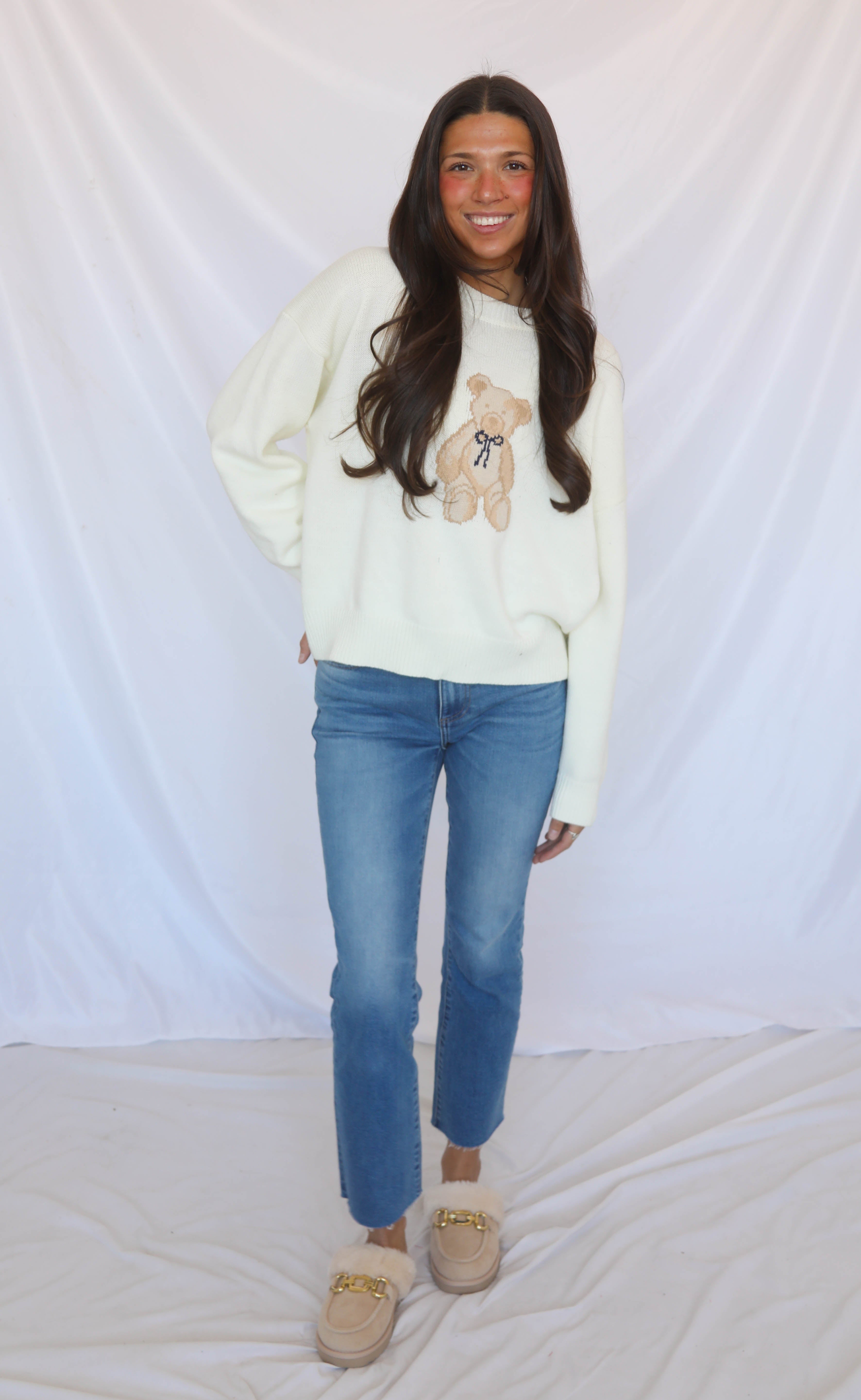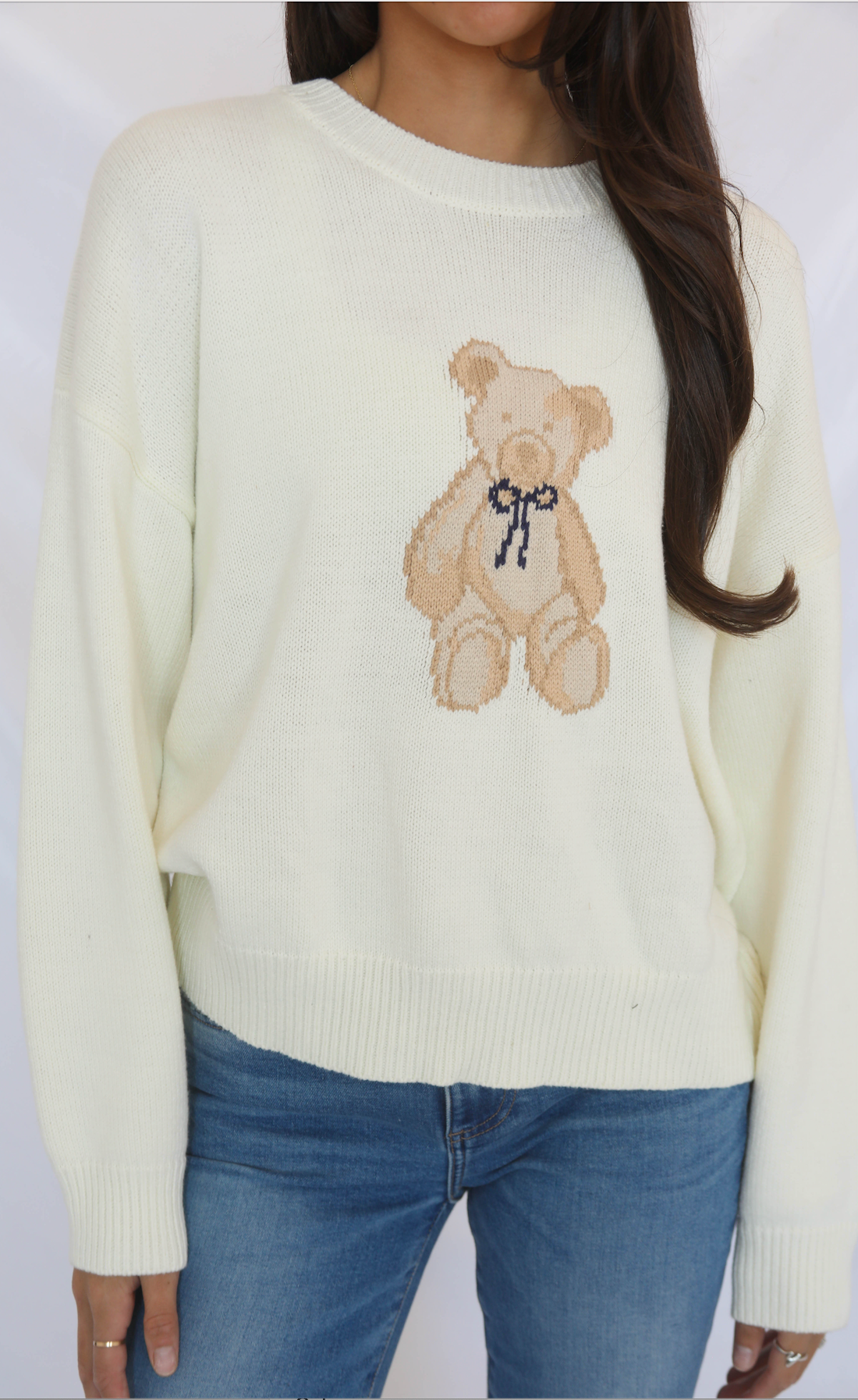 Cuddle up in this adorable sweater. The Cuddle Season Sweater is an off white crewneck long sleeve sweater with drop shoulders and the most classic, adorable teddy bear complete with a trendy navy blue bow tie.