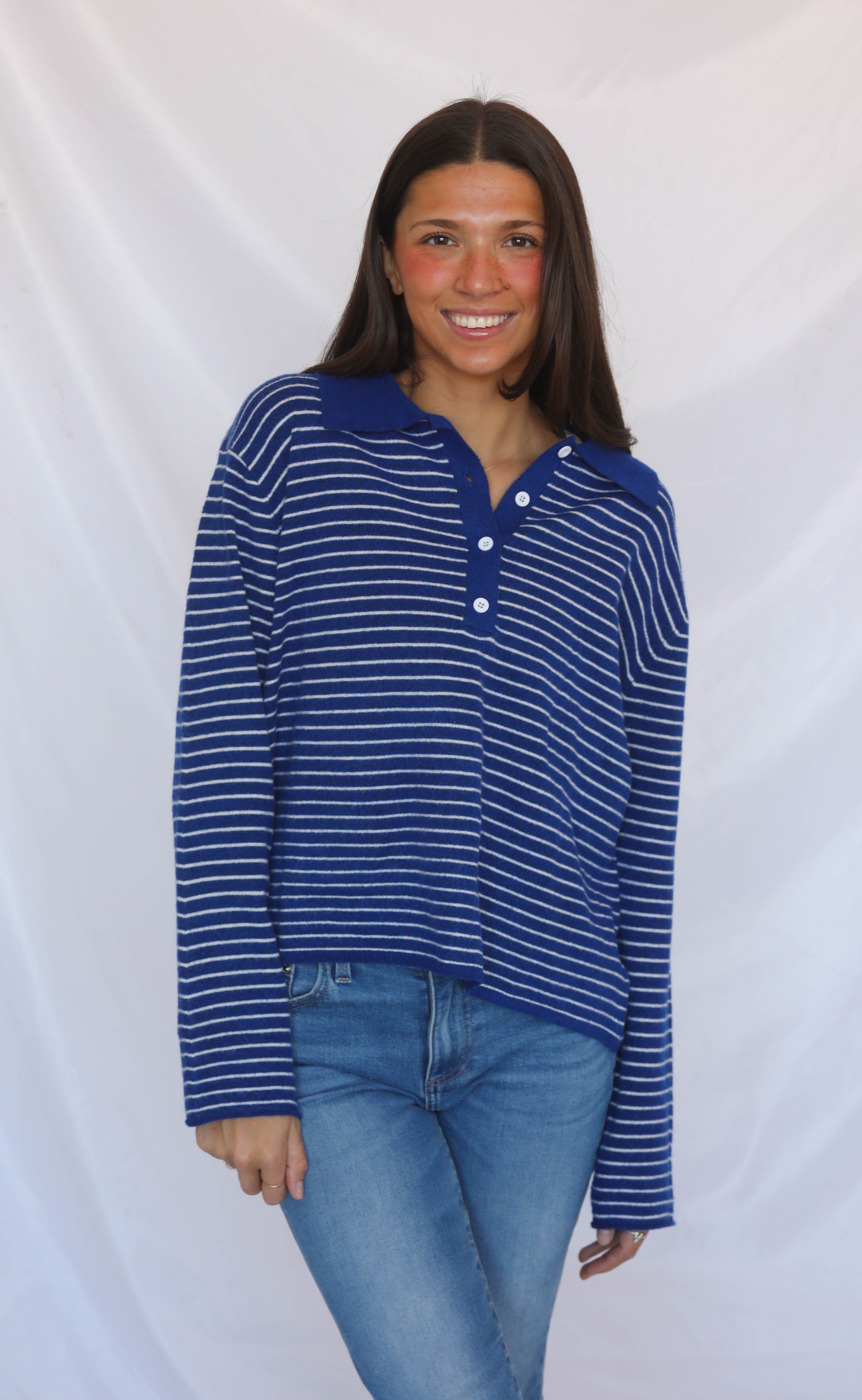 Bright, classic, and effortlessly easy to wear. This royal blue and white striped henley features a boxy fit, long sleeves, a soft collar, and button details for a polished touch. Perfect for layering, pairing with denim, or adding a fresh pop of color to your fall wardrobe.