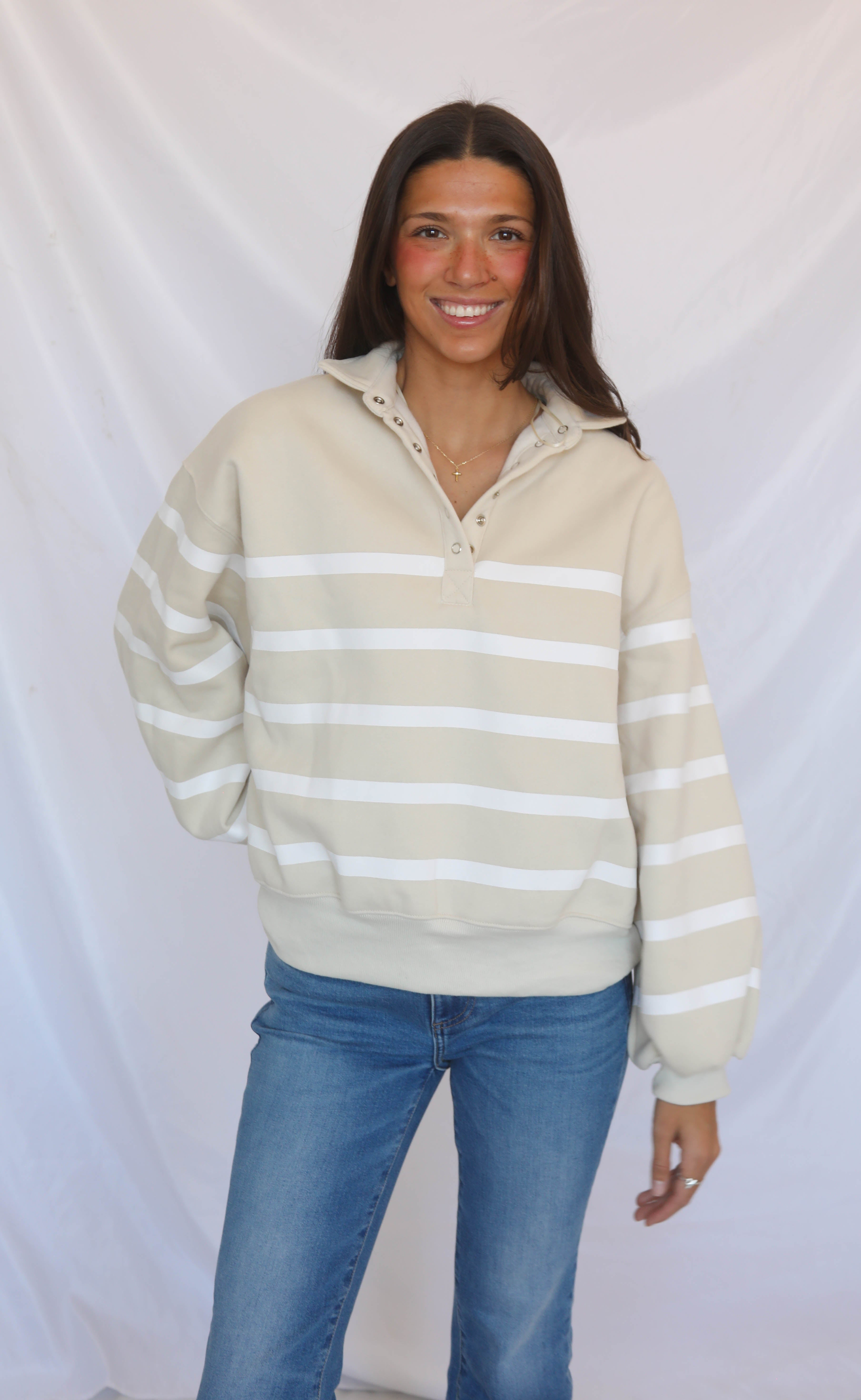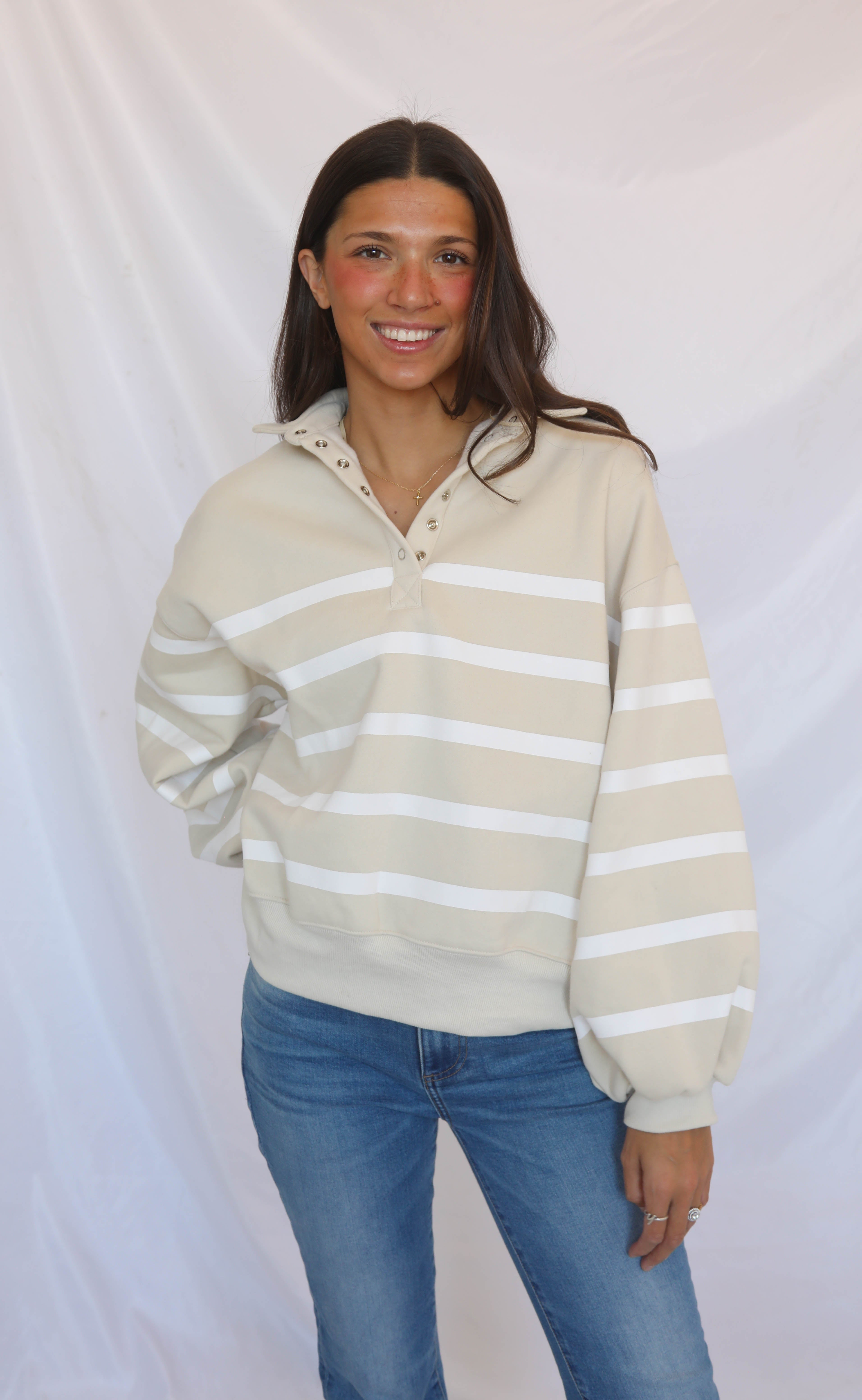 The Keep On Stripe Pullover features soft taupe fabric accented with bold white stripes, a classic collar, and snap details for a trendy edge. Its elastic hem creates a flattering fit, making this pullover a stylish and on-trend addition to your casual wardrobe.