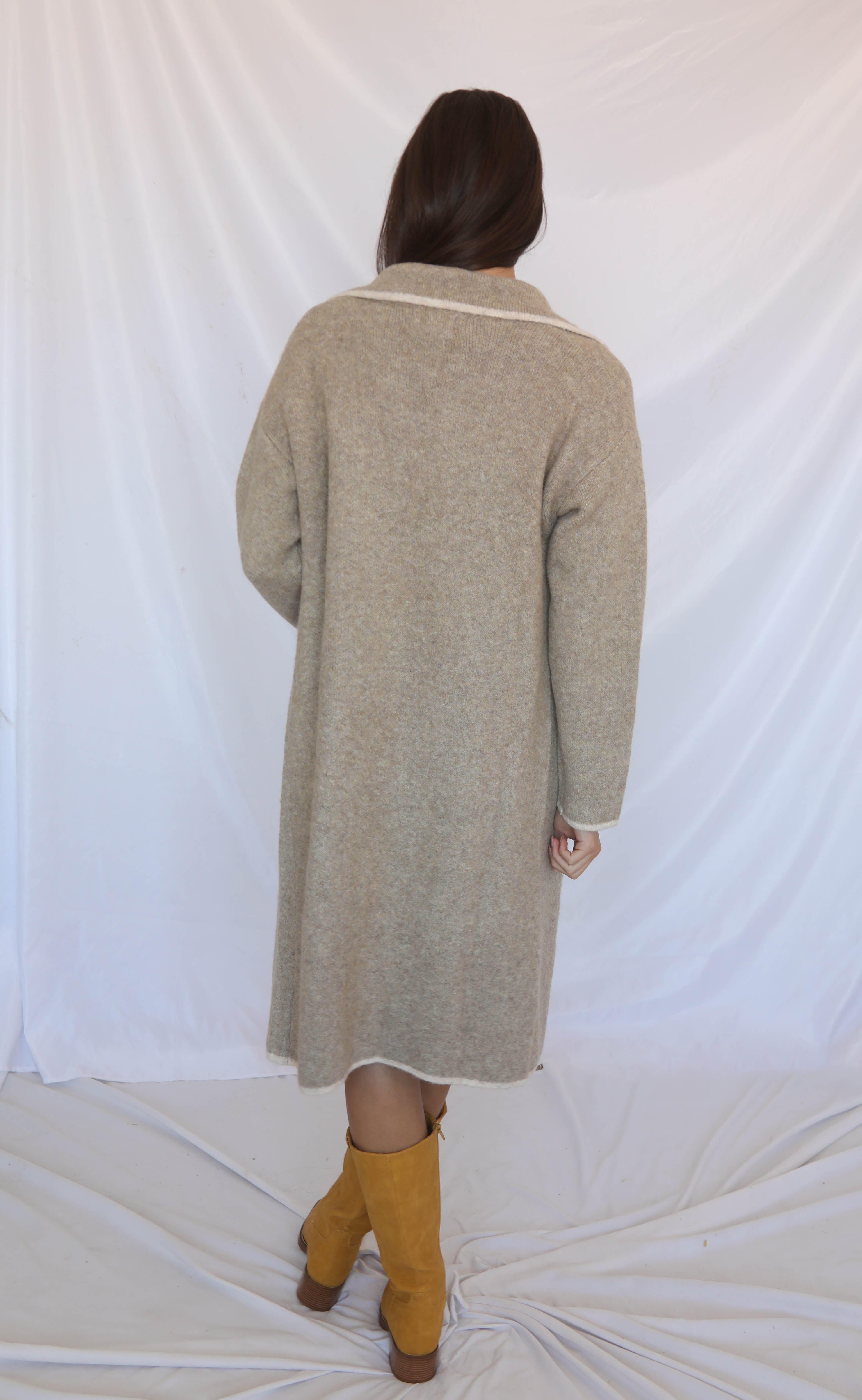 Wrap yourself in effortless luxury. This soft brown midi cardigan features an open front and elegant beige trim along the collar for a polished touch. Midweight and cozy, it’s perfect for layering over dresses, skirts, or your favorite denim for a chic, elevated fall look.