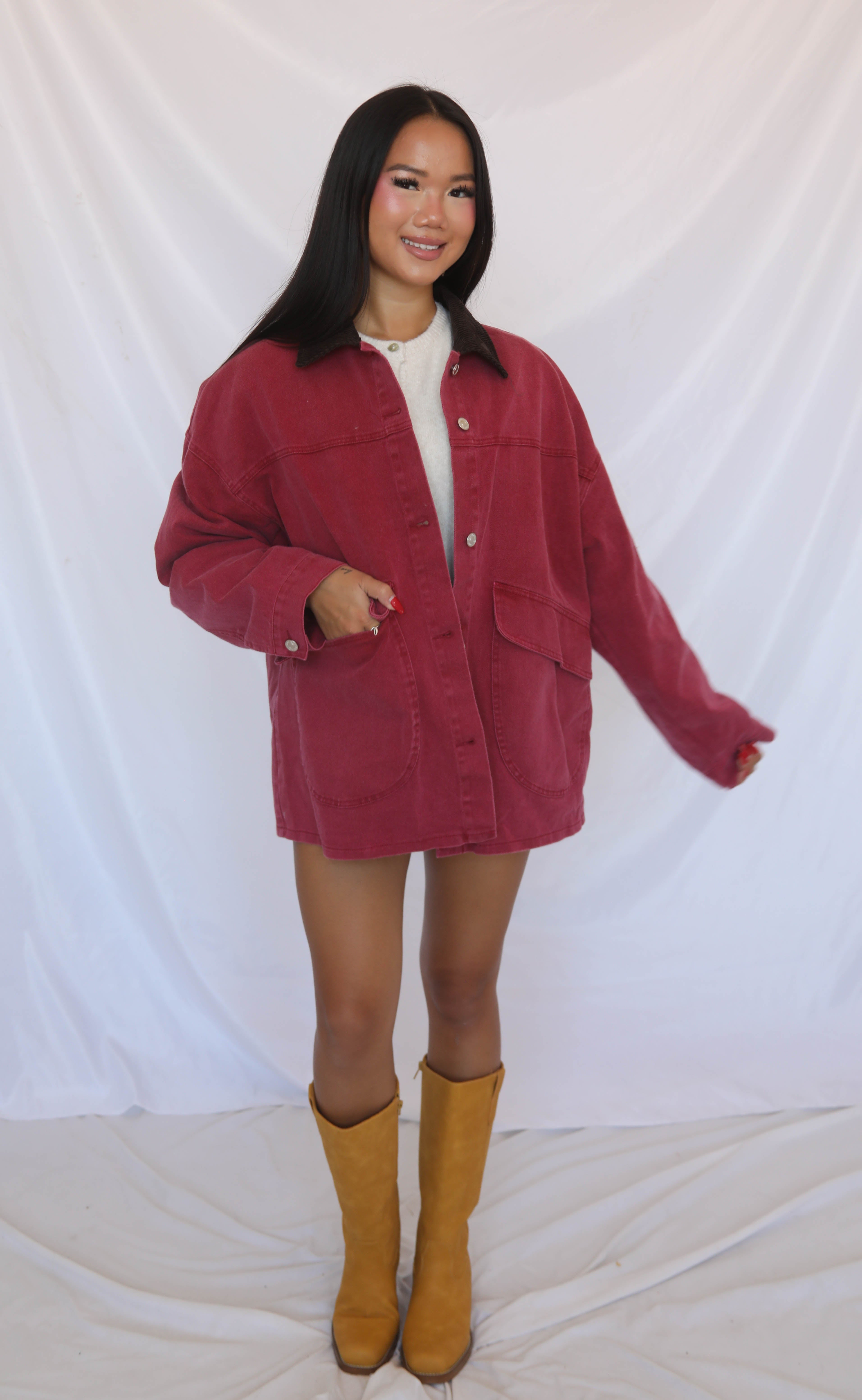 This wine-colored denim barn jacket features a dark brown corduroy collar, silver button details, and an oversized boxy fit for relaxed layering. Perfect for pairing with denim, skirts, or dresses to add a polished, fall-ready touch to any outfit.