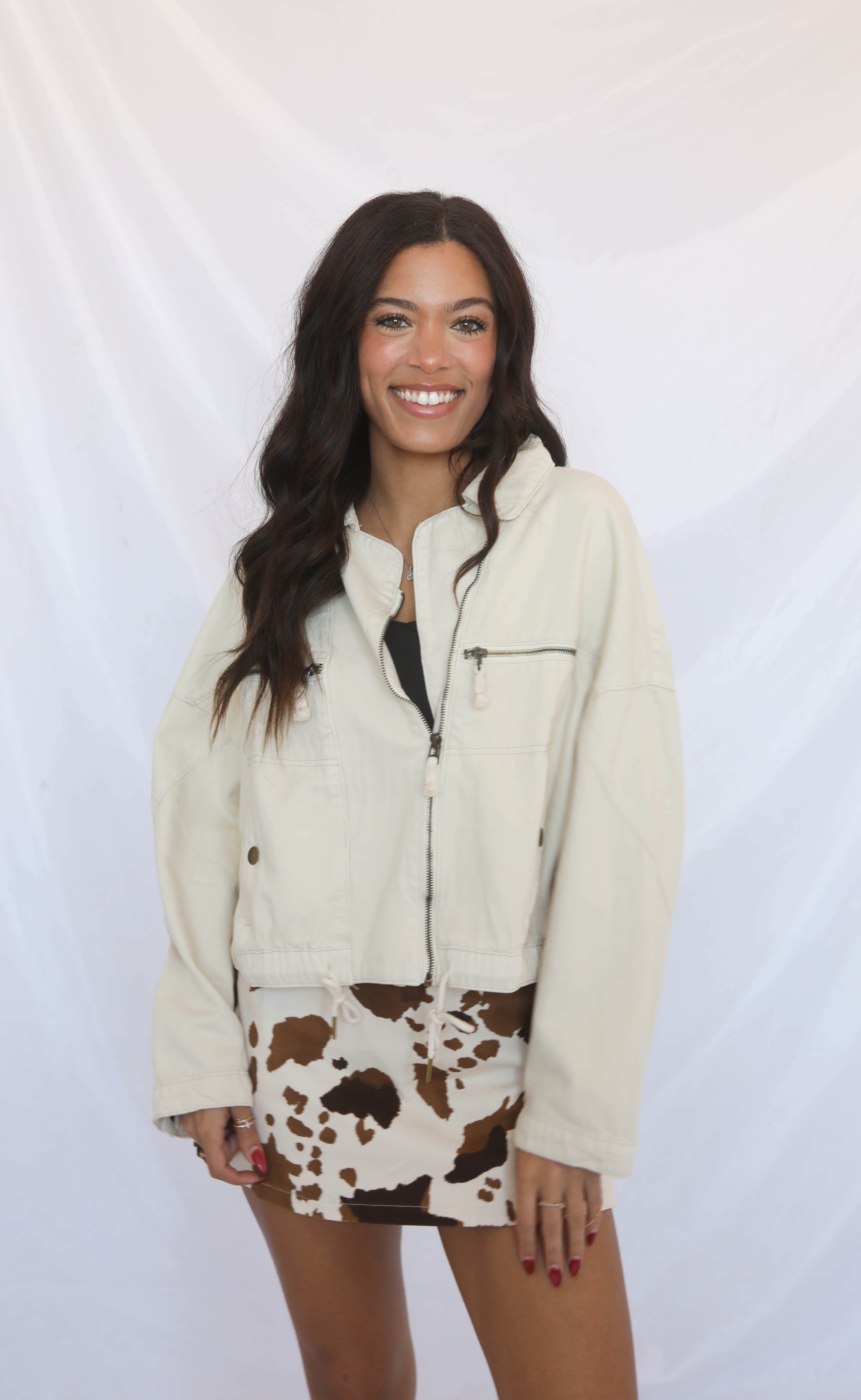 Add a sleek, edgy layer to your fall wardrobe. This ivory moto jacket features metallic silver hardware and a drawstring hem for adjustable fit and style. Effortlessly chic, it’s perfect for layering over dresses, denim, or casual separates for a modern, polished look.