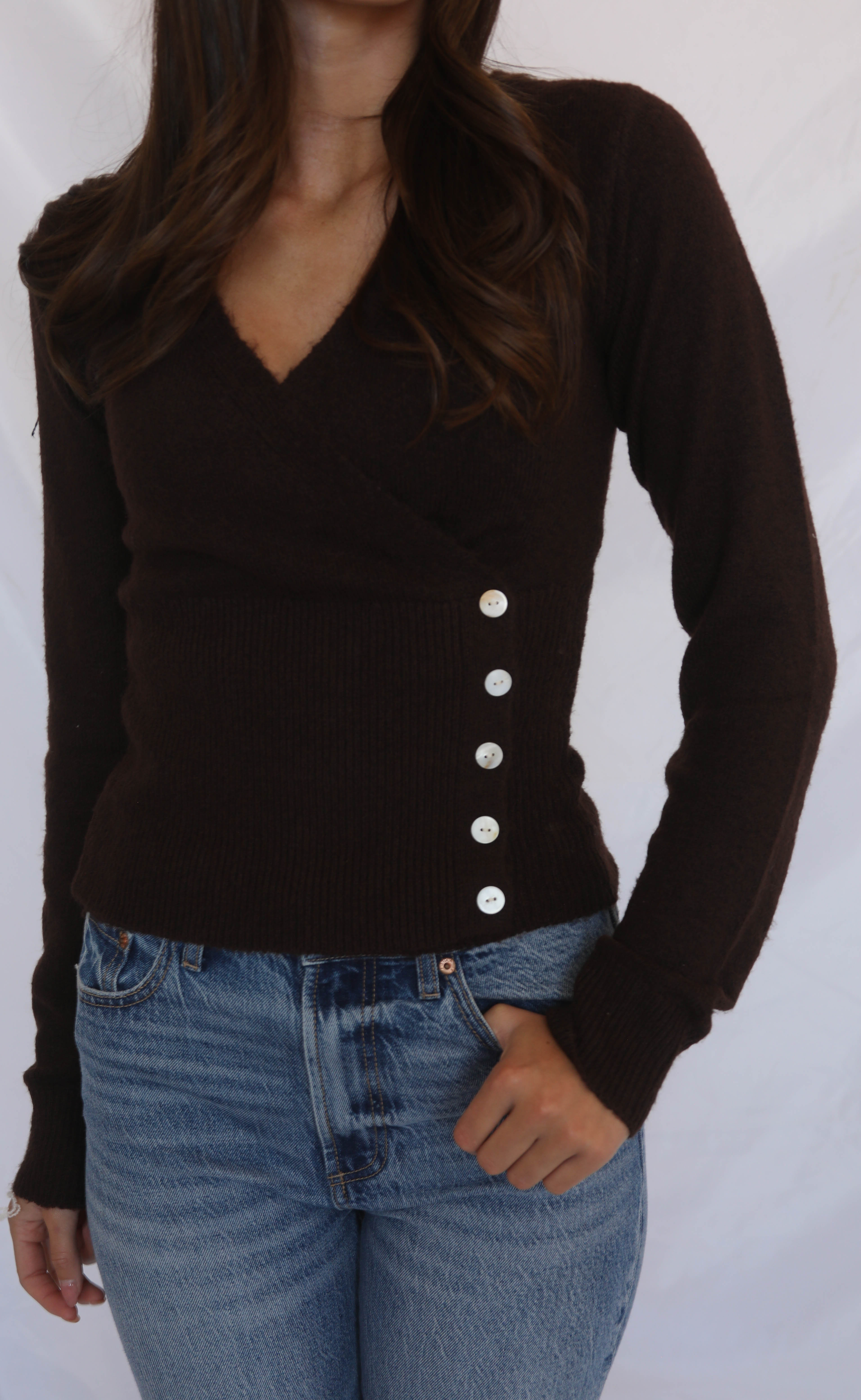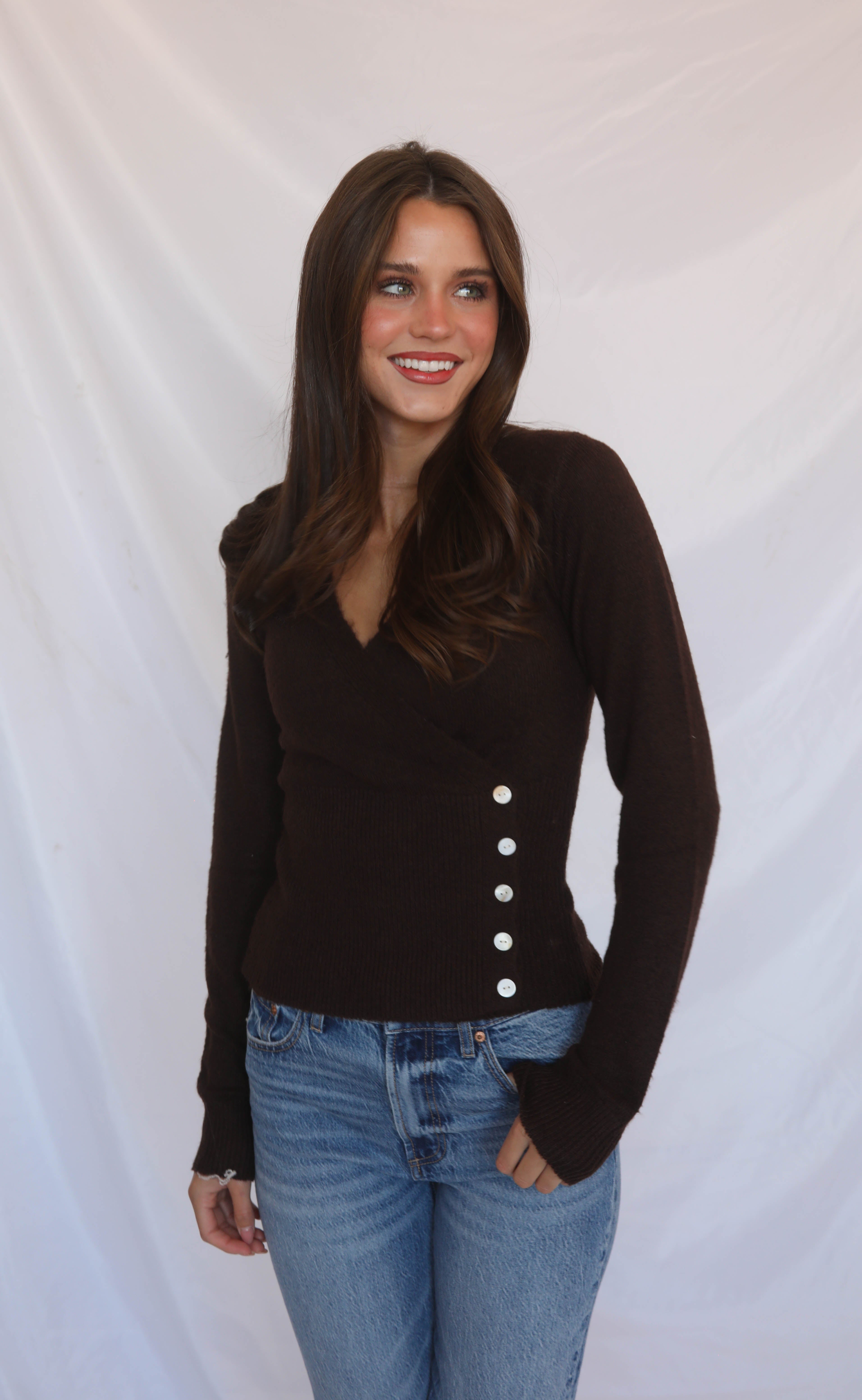 Cozy meets polished in this dark chocolate brown knit sweater. Featuring long sleeves, a crossover front with button closure, and a fitted waist, it offers a flattering silhouette that’s perfect for layering or wearing on its own. Ideal for fall outings, office days, or weekend brunches.