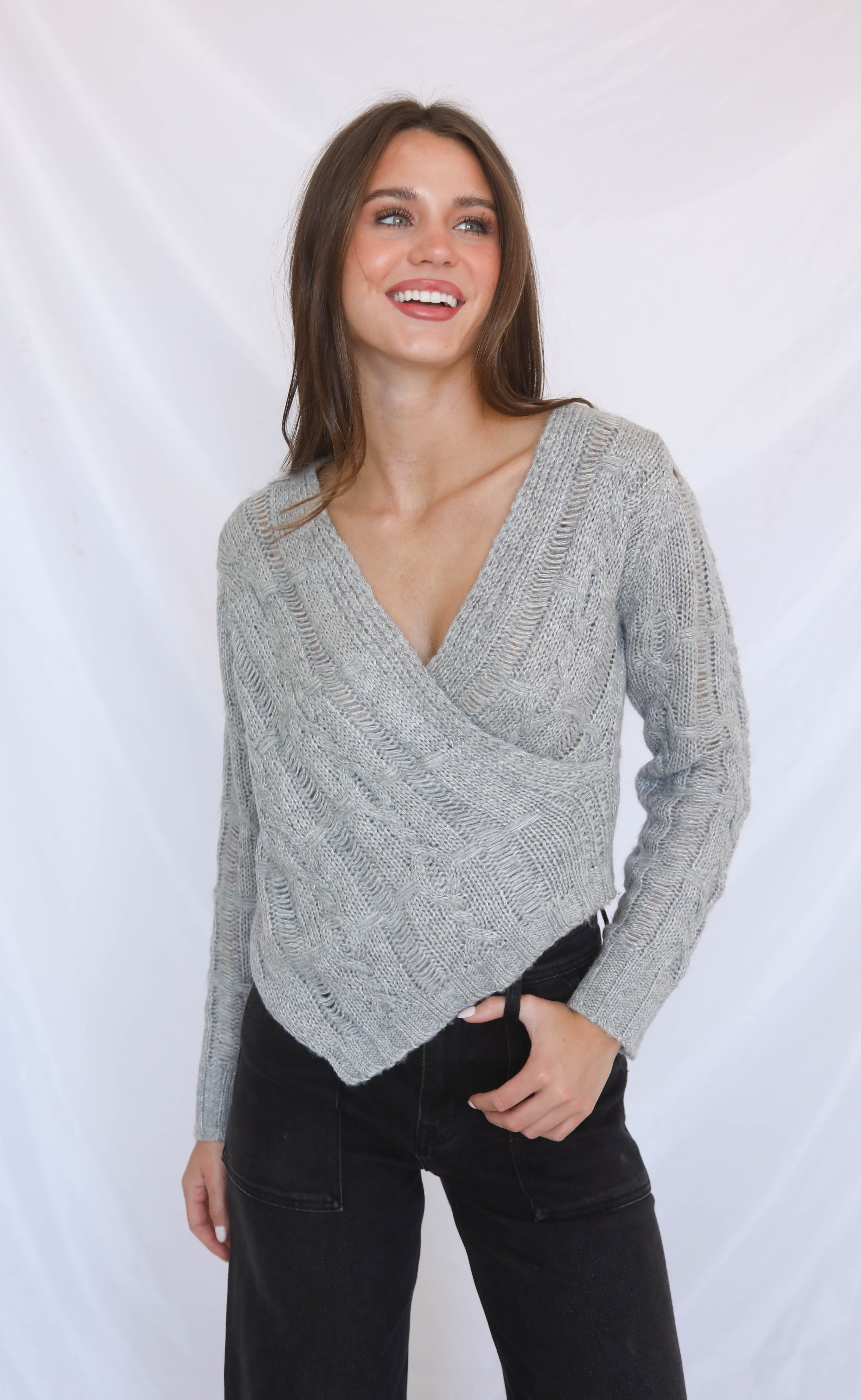 This grey sweater is a loose knit long sleeve sweater with a twist. It's criss cross front is flattering and pairs perfect with high rise denim. We love the light weight cableknit fabrication.