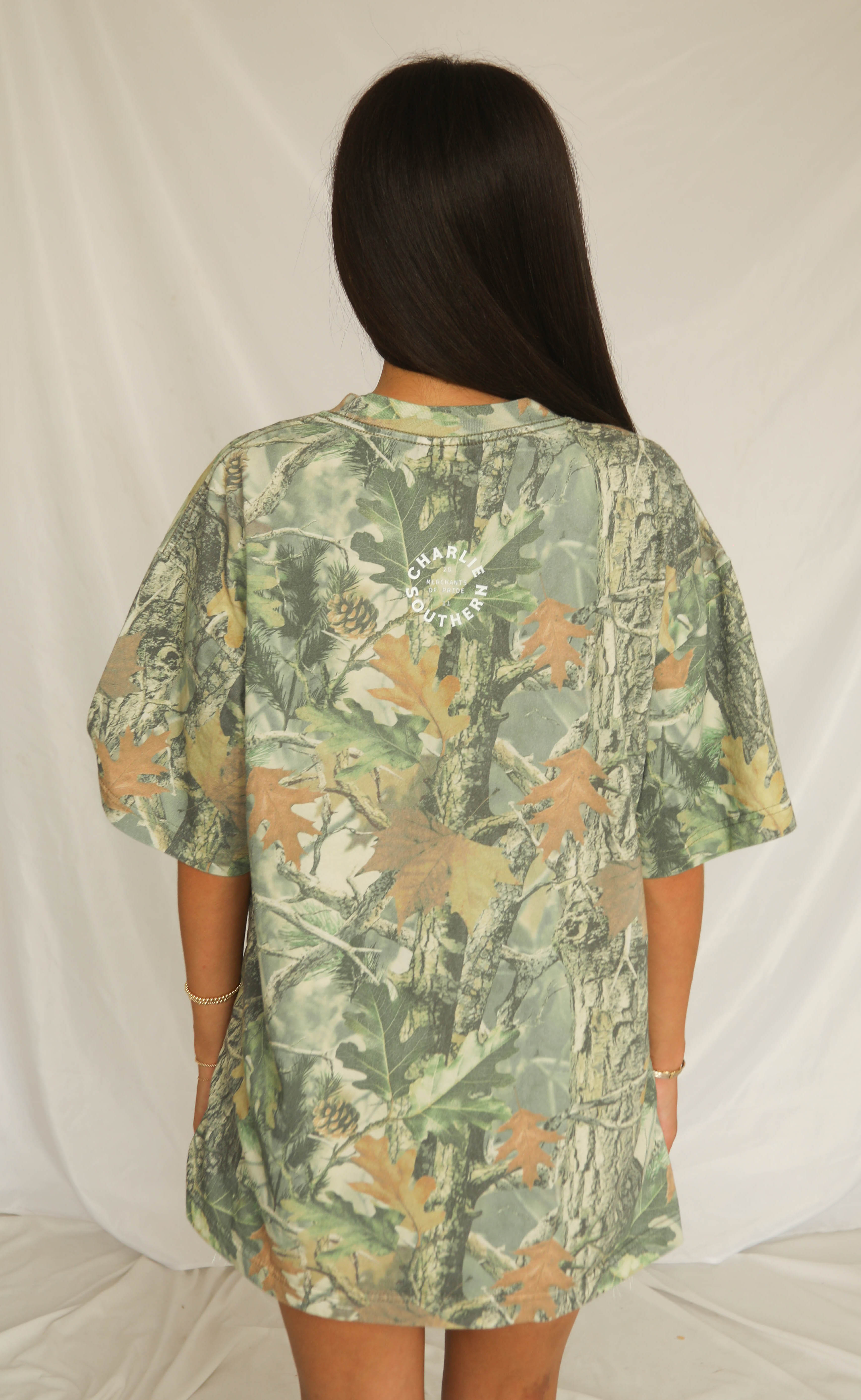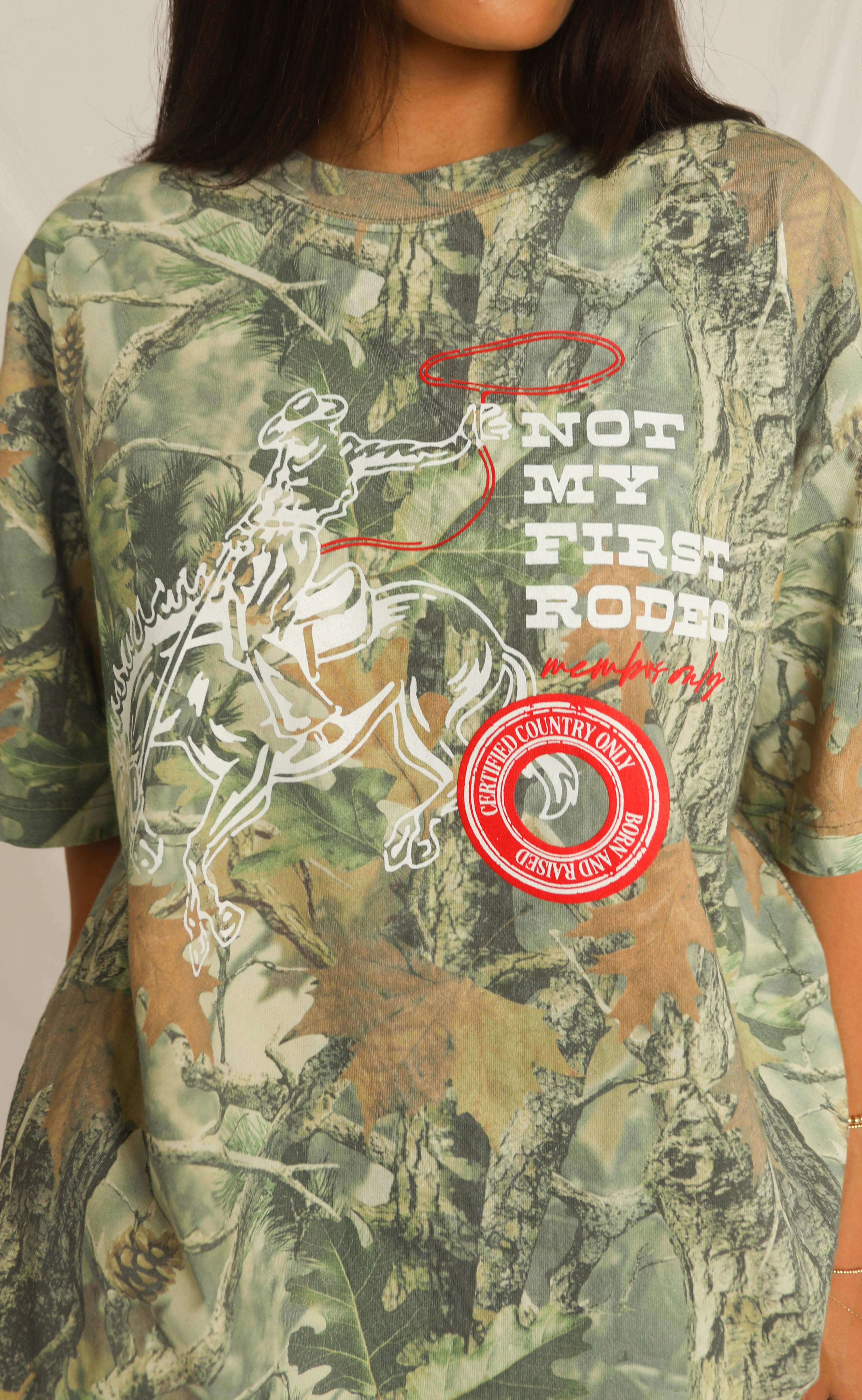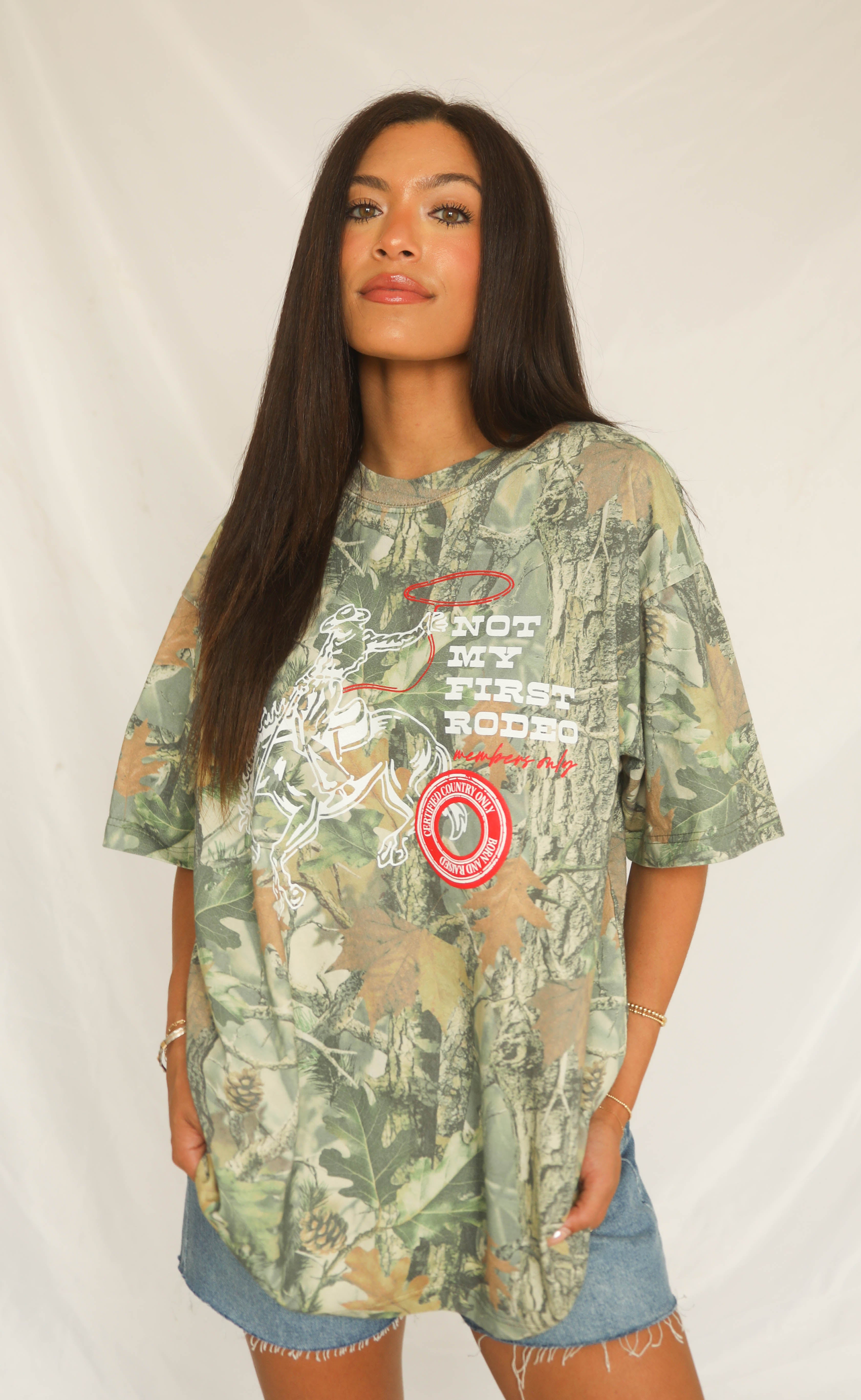 Back by popular demand: our oversized camo tee! This tee features a graphic complete with a roping rodeo cowboy on his bucking bronco and a members only logo.