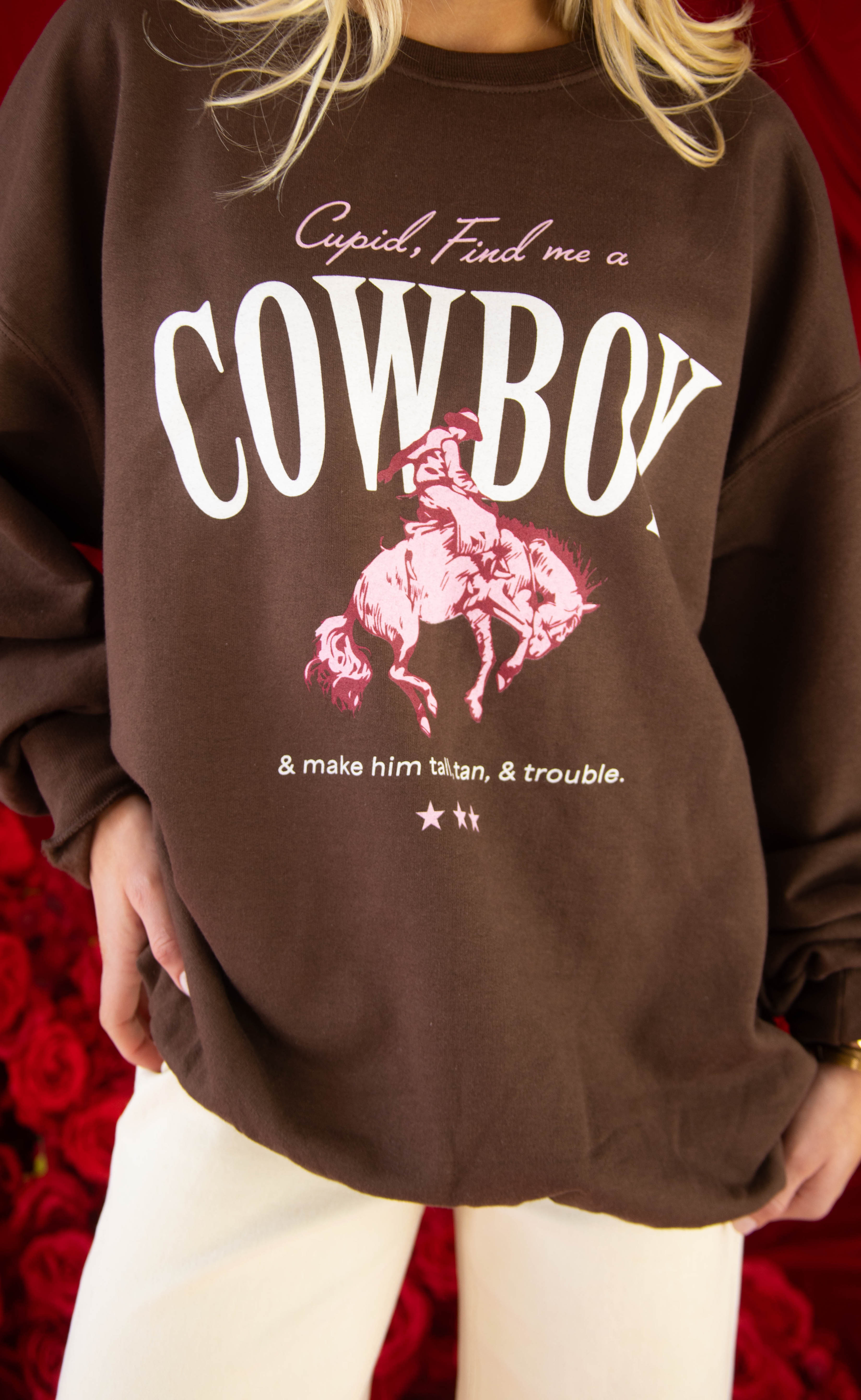 This chocolate brown sweatshirt brings a playful western twist to Valentine’s style. Featuring a pink graphic of a bucking bronco and cowboy with the phrase “cupid find me a cowboy,” it’s bold, cheeky, and cozy all at once. Easy to wear, easy to gift, and guaranteed to be a conversation starter.