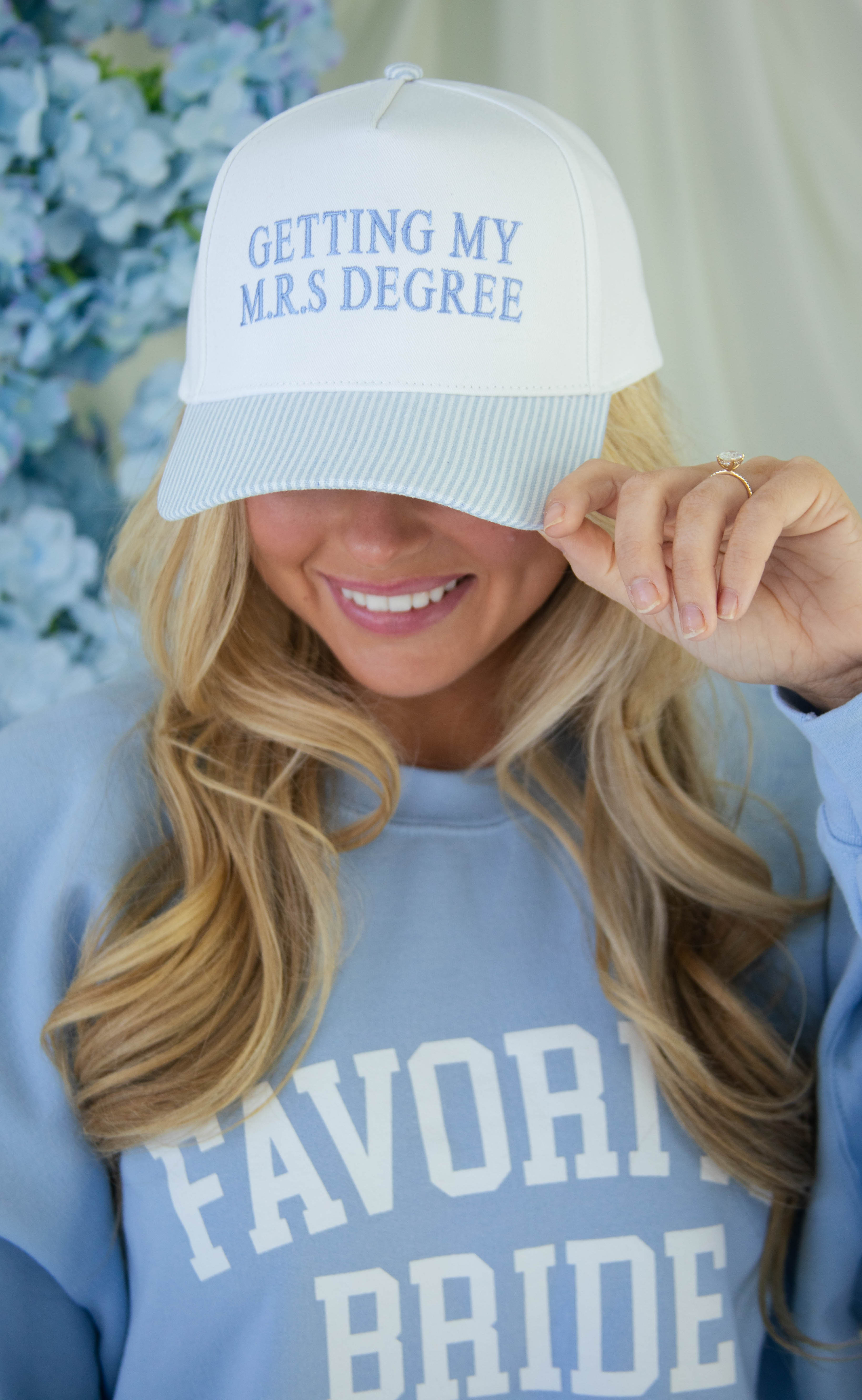 School is officially in session with the cutest accessory for your bridal curriculum. This fresh take on a classic trucker hat features a crisp white crown with "Getting My M.R.S Degree" in a soft blue, perfectly balanced by a trendy blue-and-white striped bill. It’s the ultimate "out and about" piece for your bridal shower errands or a sunny day on your bachelorette trip.