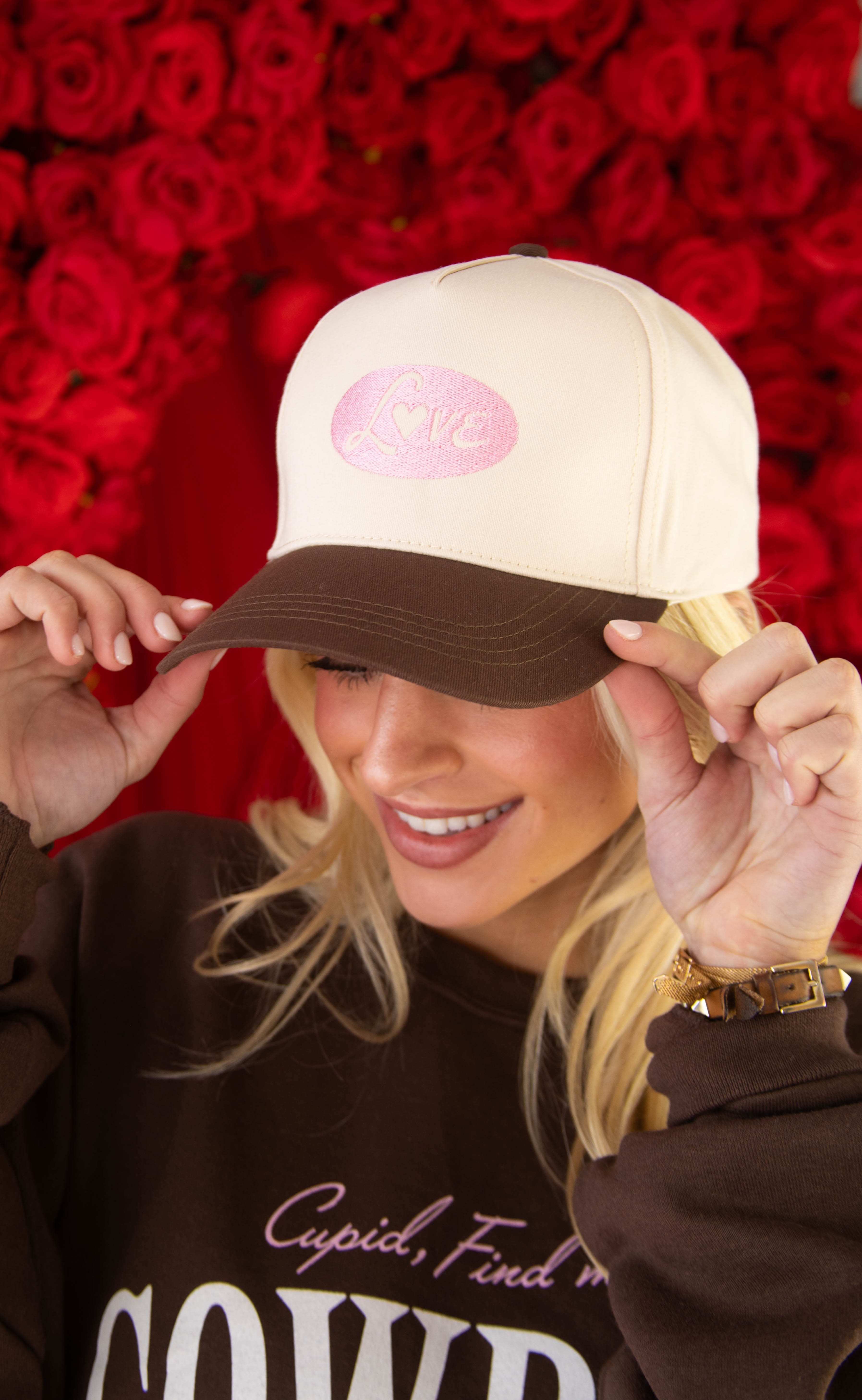 This ivory and brown two-tone trucker hat adds a playful pop to any outfit. Finished with a pink embroidered oval reading LOVE, complete with a heart-shaped “O,” it’s equal parts fun and effortless. Easy to style and perfect for gifting, it’s a cute way to spread the love all season long.