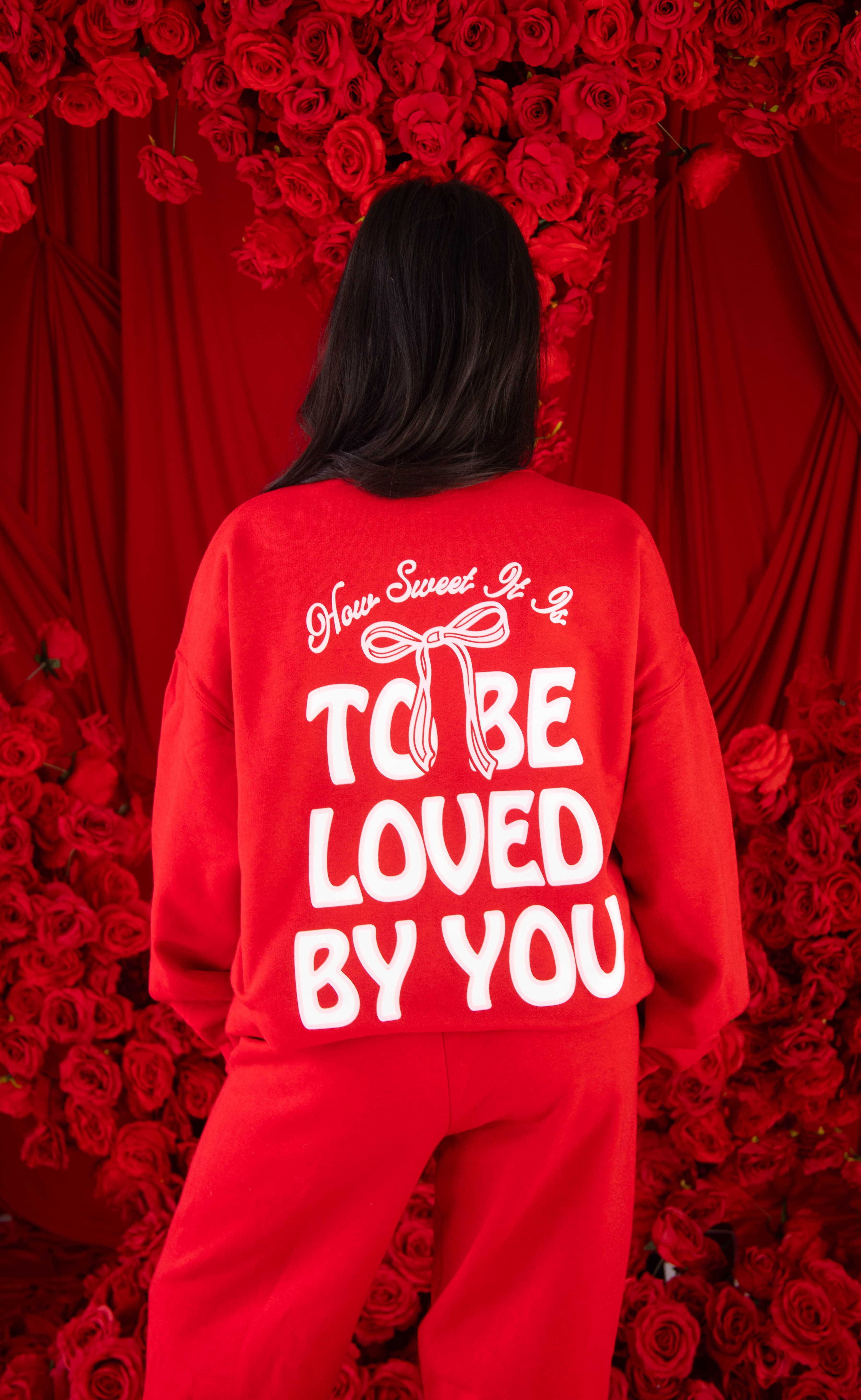 Our best-selling sweatshirt returns in a bold red, just in time for love season. Featuring “so this is love” with a delicate bow on the front and “how sweet it is to be loved by you” across the back, it’s equal parts cozy and sentimental. Soft, comfy, and made for wearing on repeat, it’s a standout piece whether styled solo or as a set.