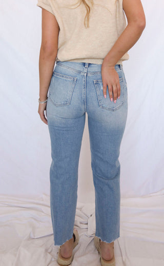 The perfect getaway. A high rise, figure hugging waist that falls to a straight leg silhouette with a cropped, scissor cut hem. Crafted from rigid, non-stretch denim for an expert fit that holds its shape. Dynamic Vintage is a crisp, medium blue denim wash with fading and subtle hints of distressing.