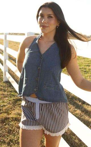 Denim, denim and more denim, please? The Sweet like Candy Denim Top is a button front halter style top with a tie behind the neck and at the back with a primarily open back design. Style with boxer shorts, a mini skirt or go for a denim on denim look with your best boots.