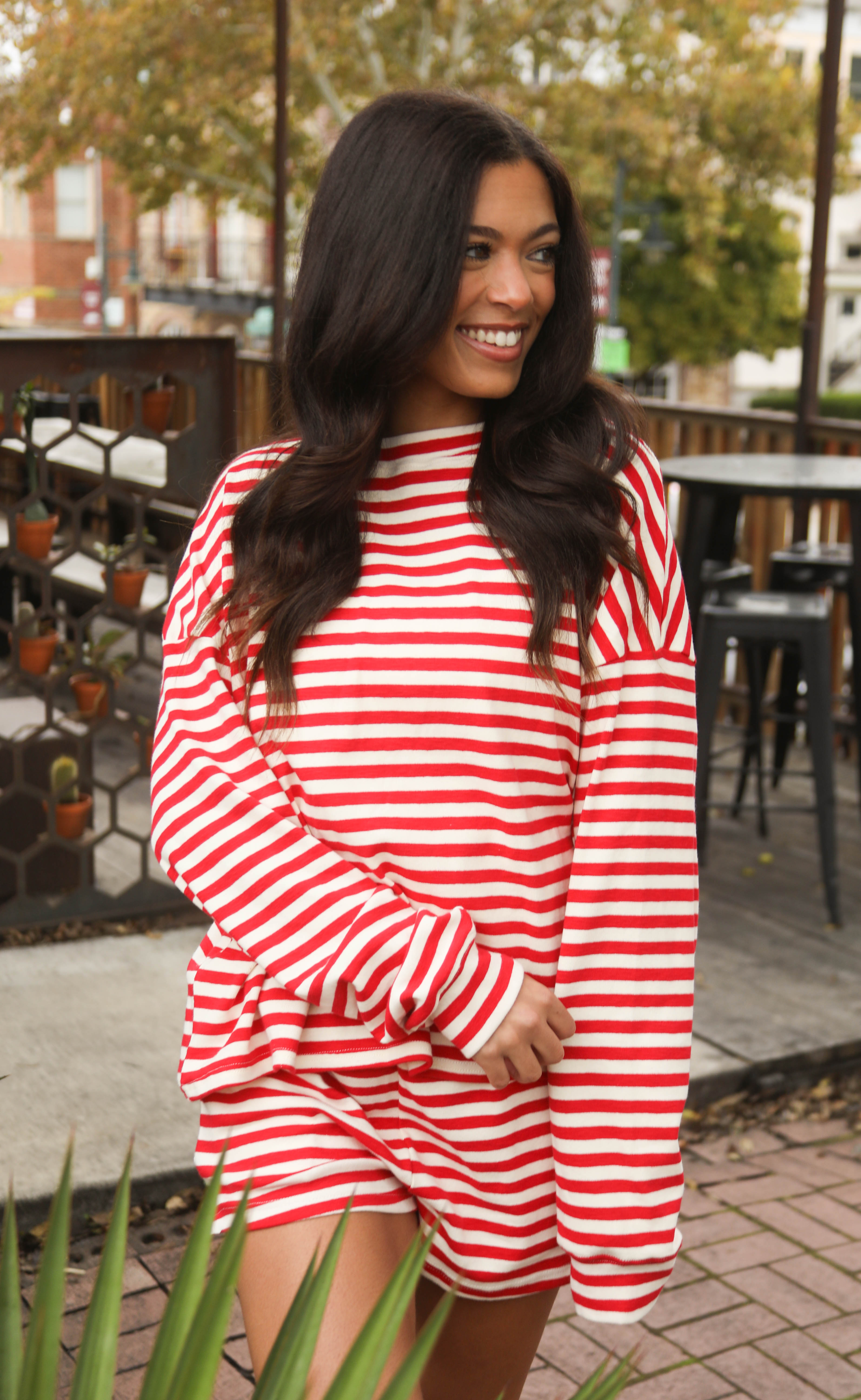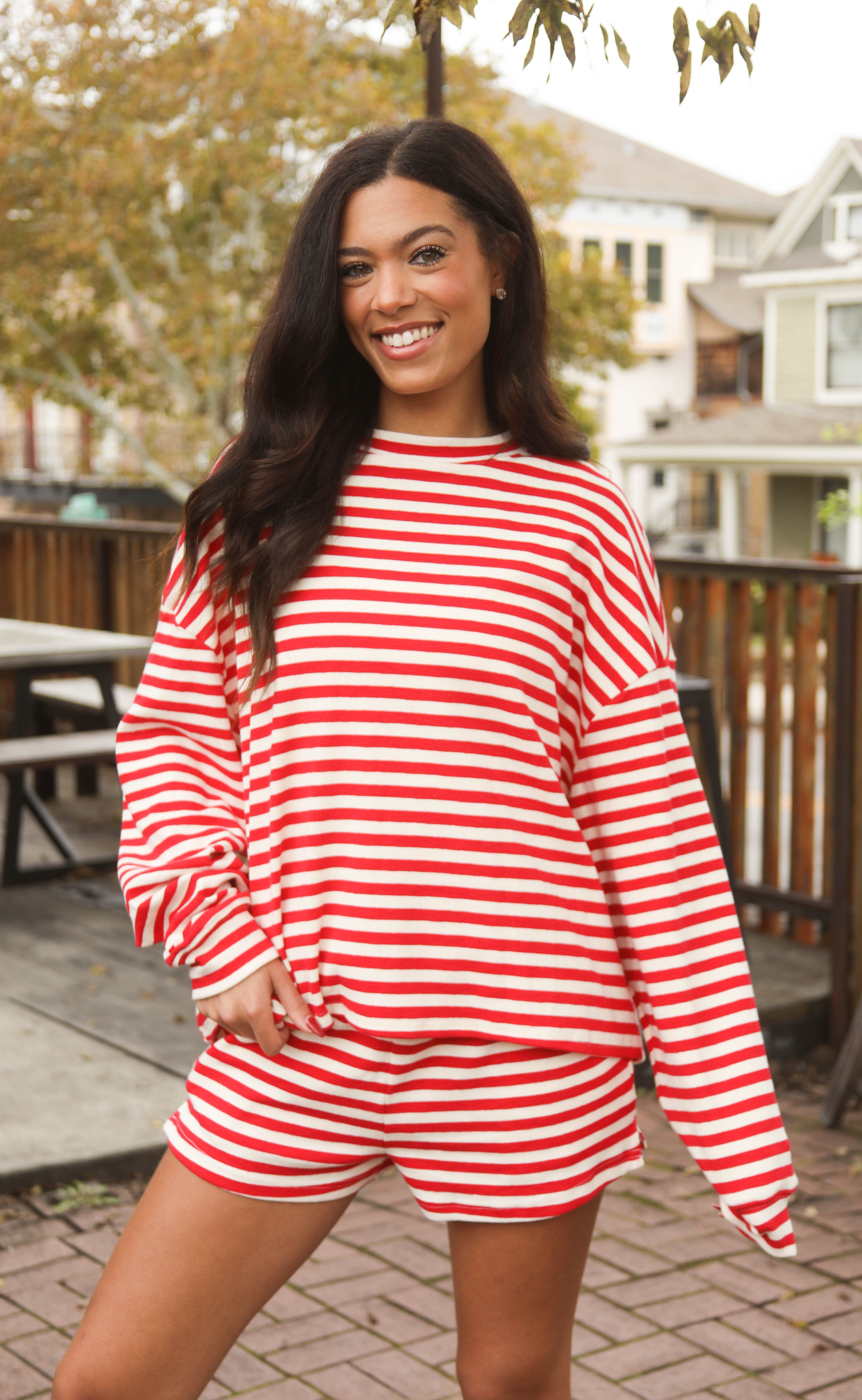 Your new favorite set just landed. This boxy, oversized long sleeve pullover and matching pull-on shorts in bold red and white stripes are as comfy as they are cute. Effortless to throw on, impossible to take off and already an HQ favorite. Consider this your heads-up: they’re predicted to sell out fast.