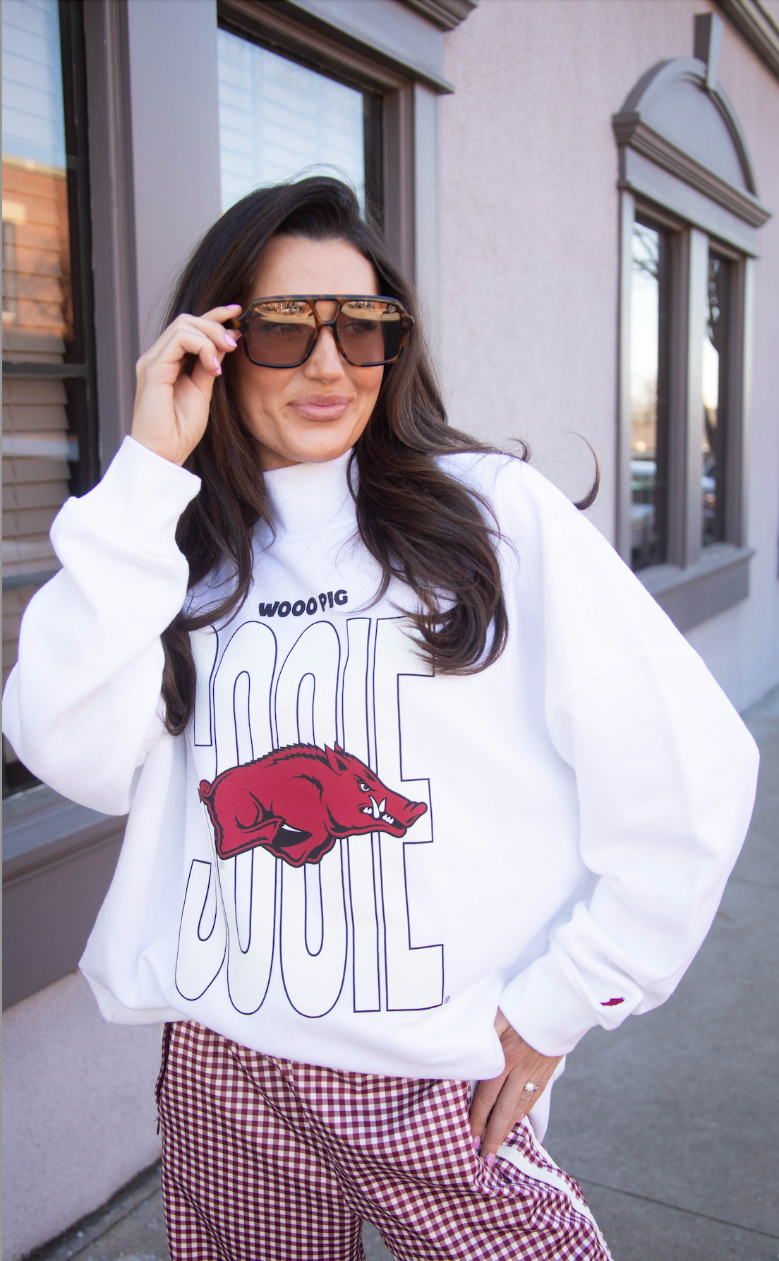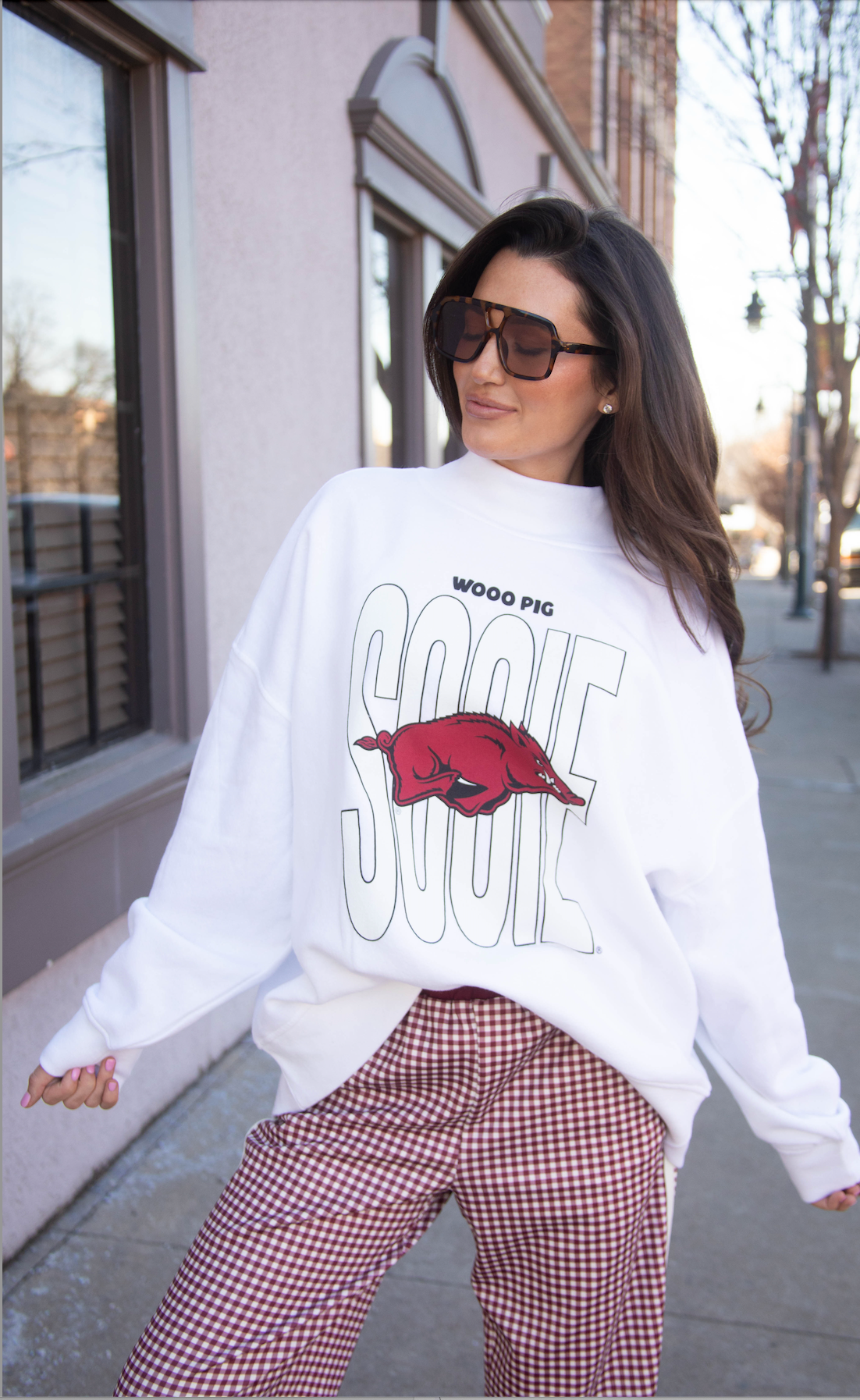 A fan favorite, upgraded. This white mock neck sweatshirt features our bestselling “Wooo Pig Sooie” design paired with the current Razorback logo -cozy, stylish, and perfect for cheering on the Hogs in comfort.