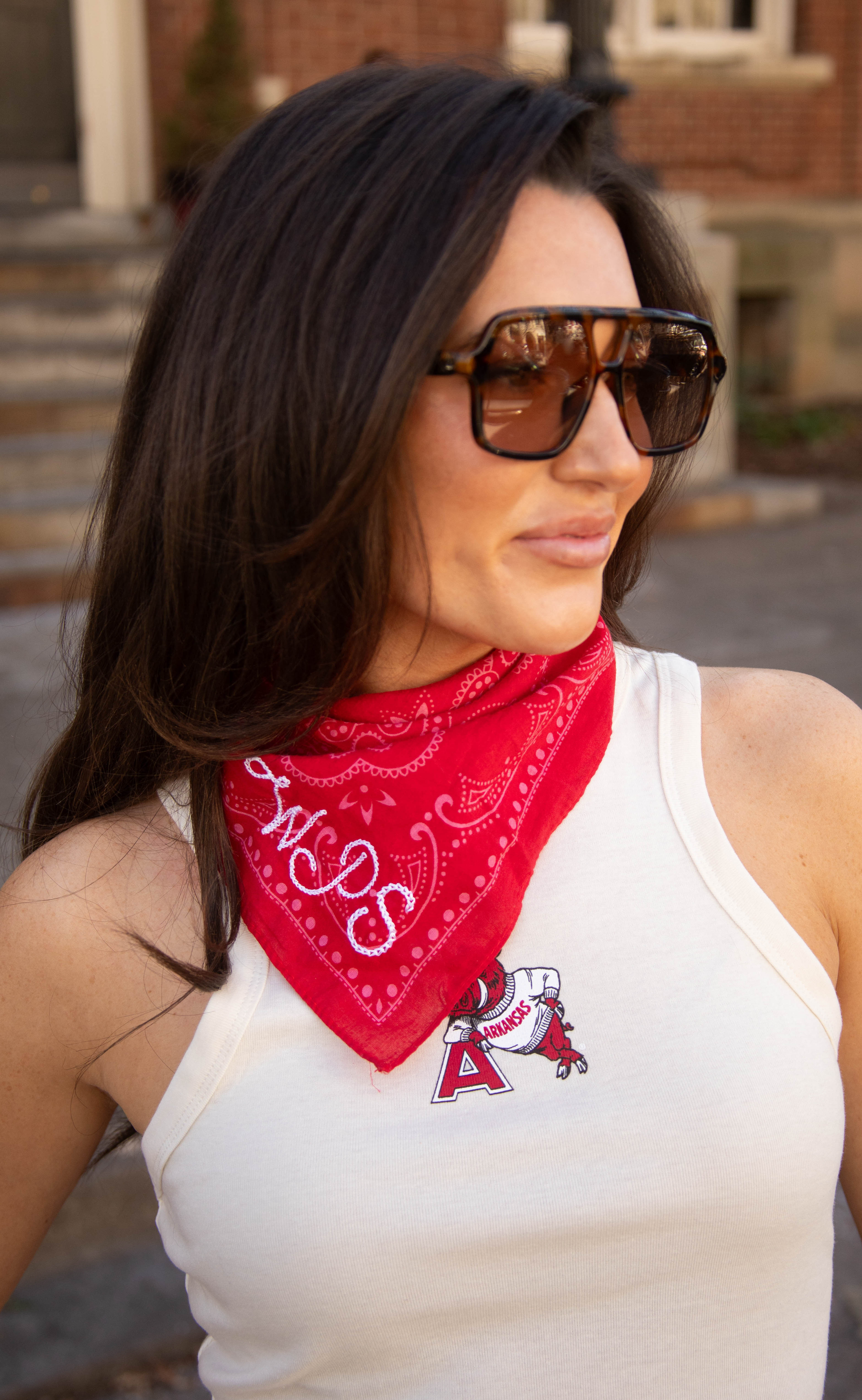 A best selling gameday accessory - the embroidered bandana. Choose from "Arkansas" or "WPS" and wear around your neck or tied around your clear bag.