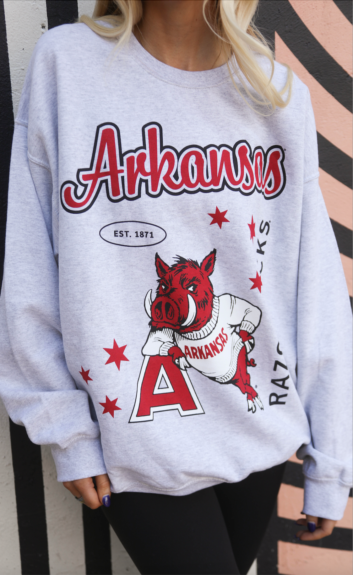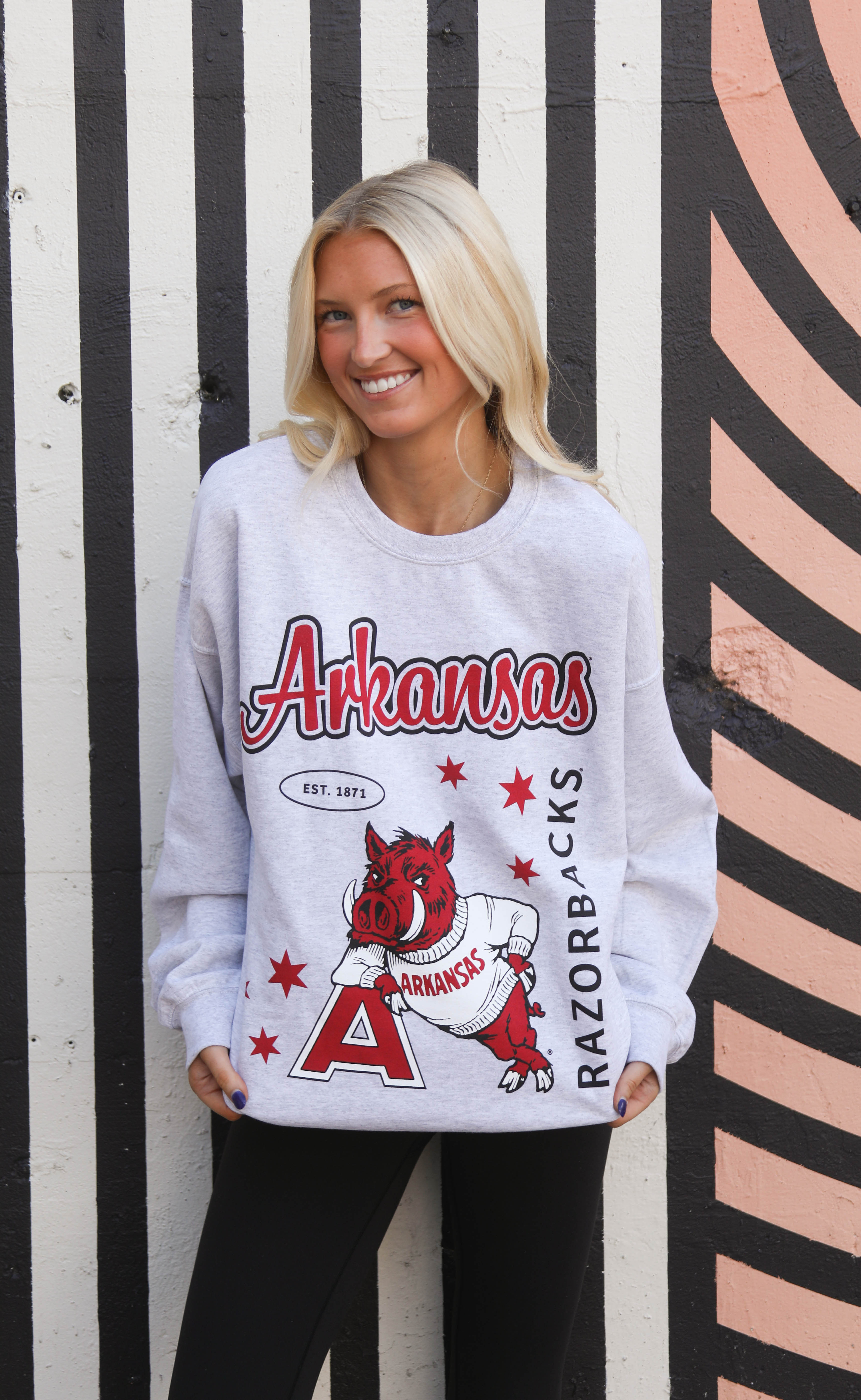 Straight from the Vault, we put the leaning Hog on the front of this ash grey crewneck sweatshirt and it's surrounded by stars, a script "Arkansas," and bold block "Razorbacks."