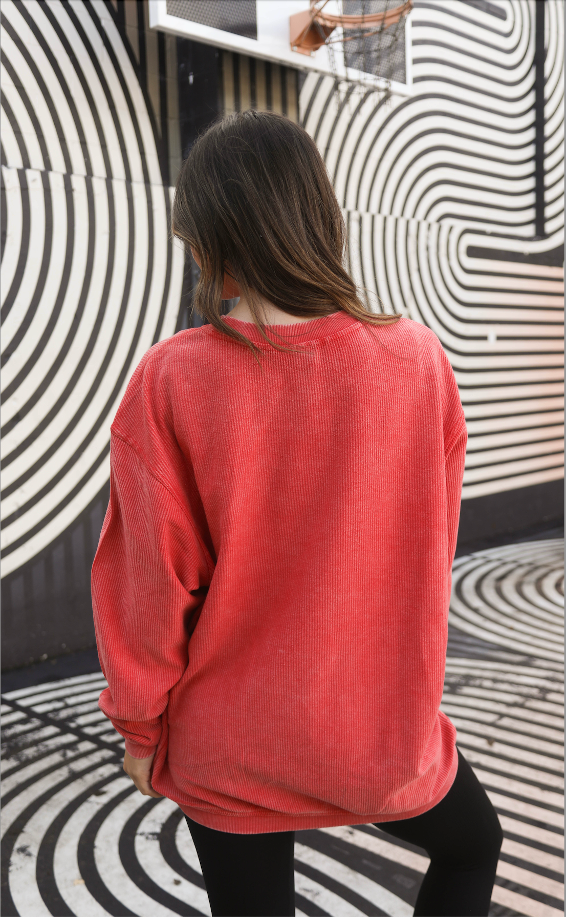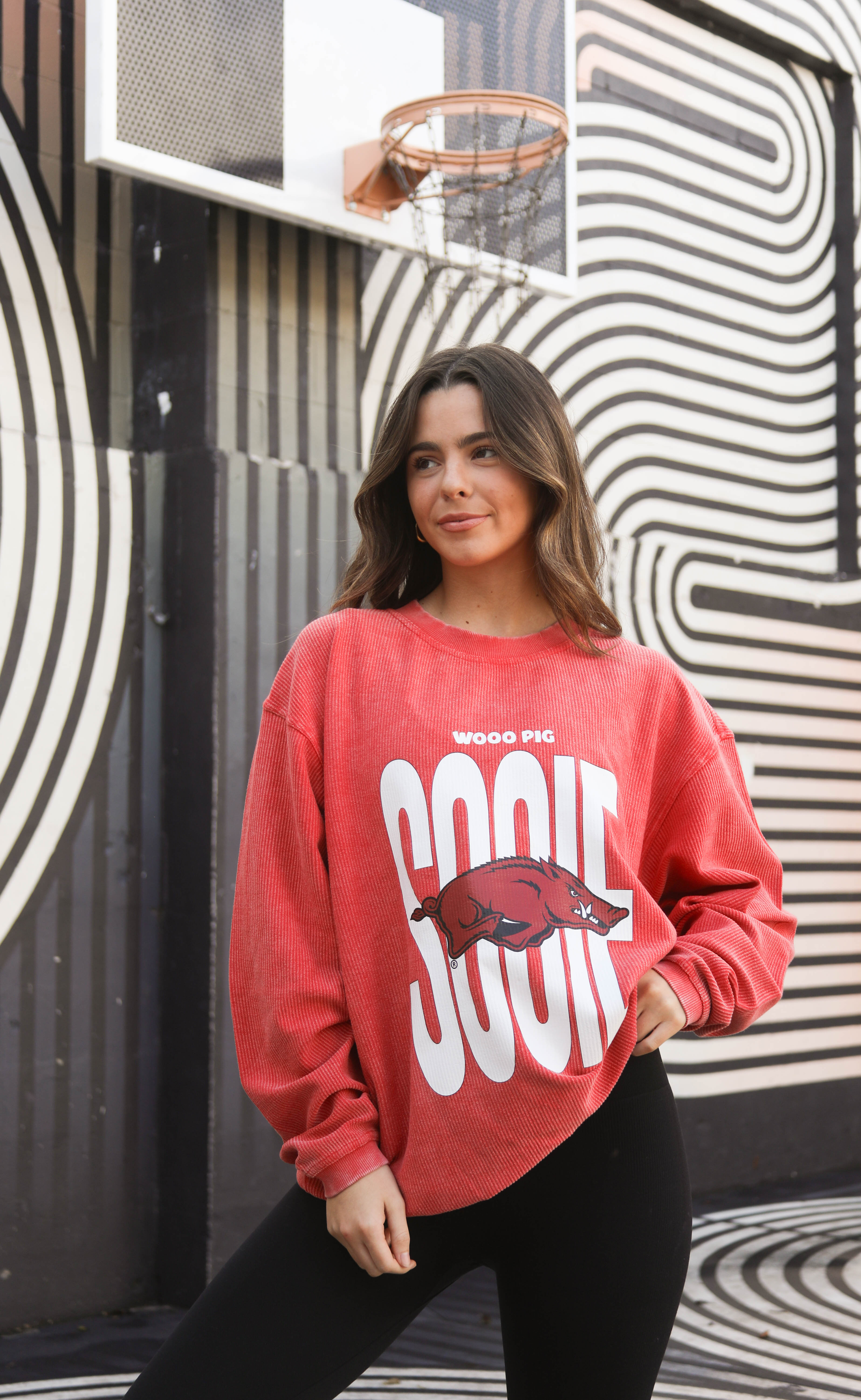 Stand up and CALL! THOSE! HOGS! Yell WOOO Pig Sooie in this fan-favorite red corded crewneck sweatshirt. We love the big bold print and classic Razorback logo.