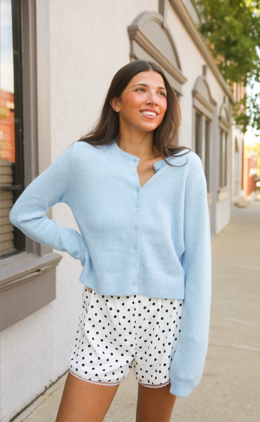 Add a touch of fun to your fall outfits with these lightweight white shorts dotted with bold black polka dots. The delicate lace trim adds a touch of femininity, making them perfect for playful, on-trend looks.