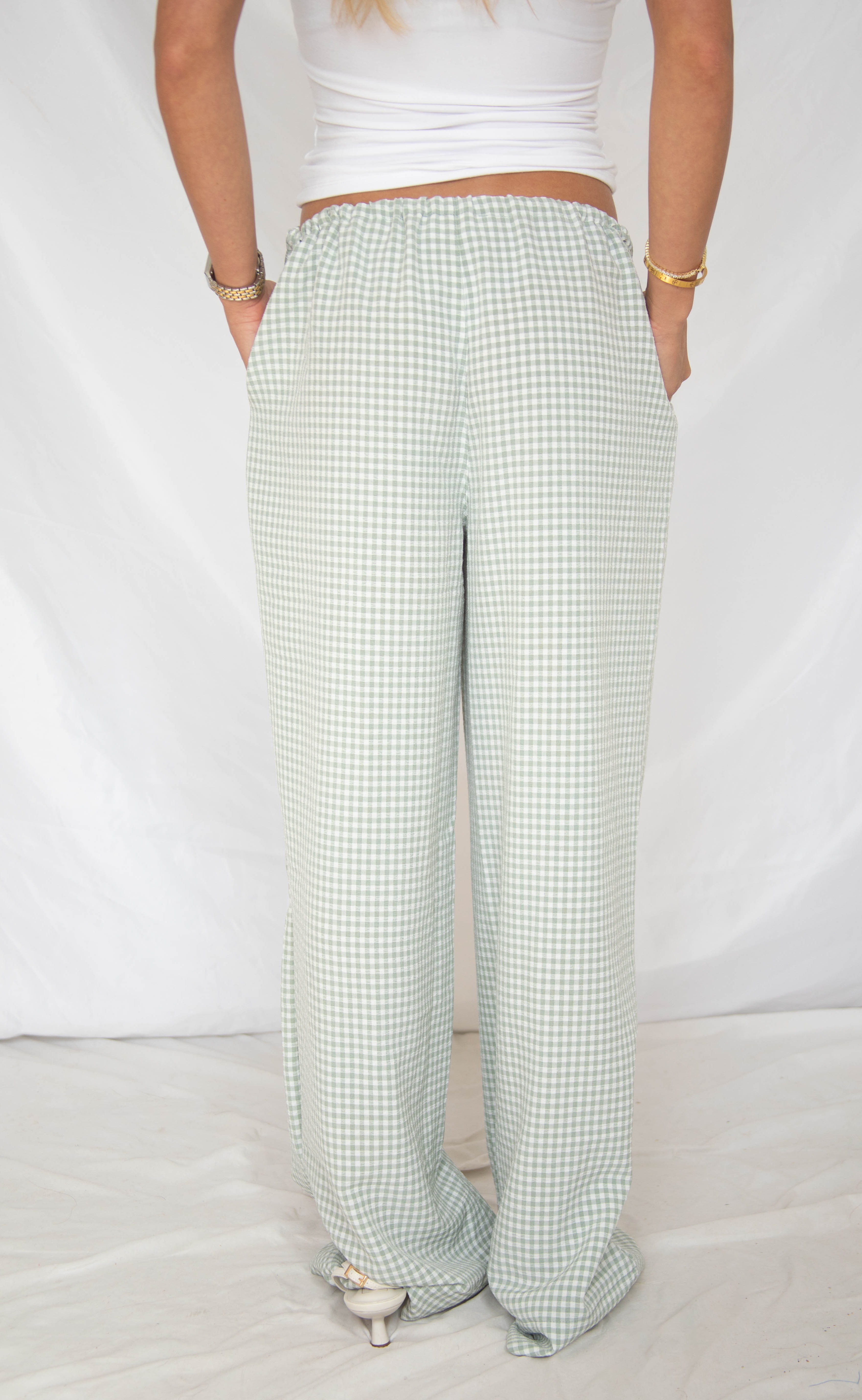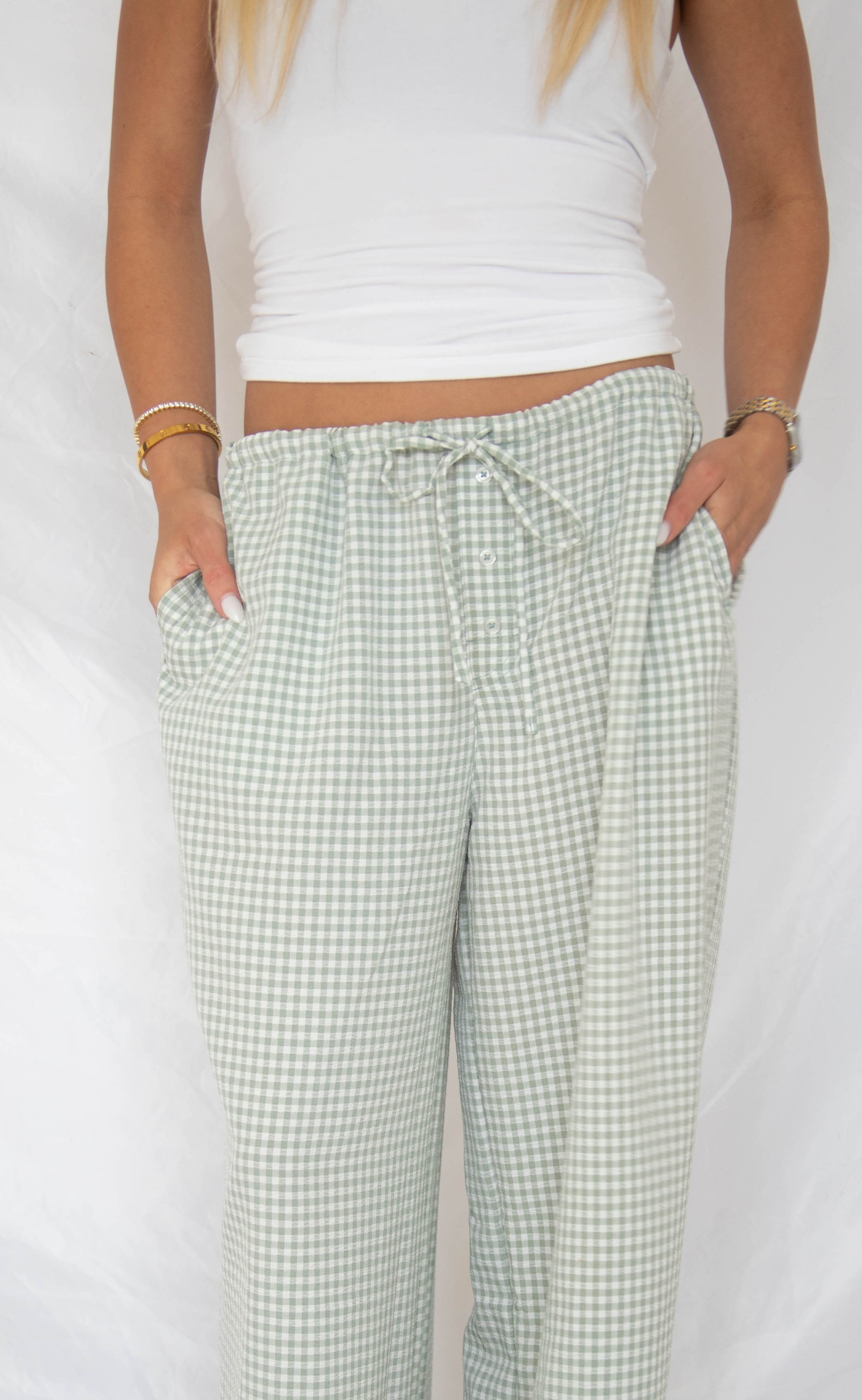 The Take It Slow Gingham Pants feature a sage green and white gingham print with a comfortable drawstring waist and side pockets. Lightweight and relaxed, they’re perfect for everyday wear—just pair with a simple tee or tank for an easy, laid-back look.