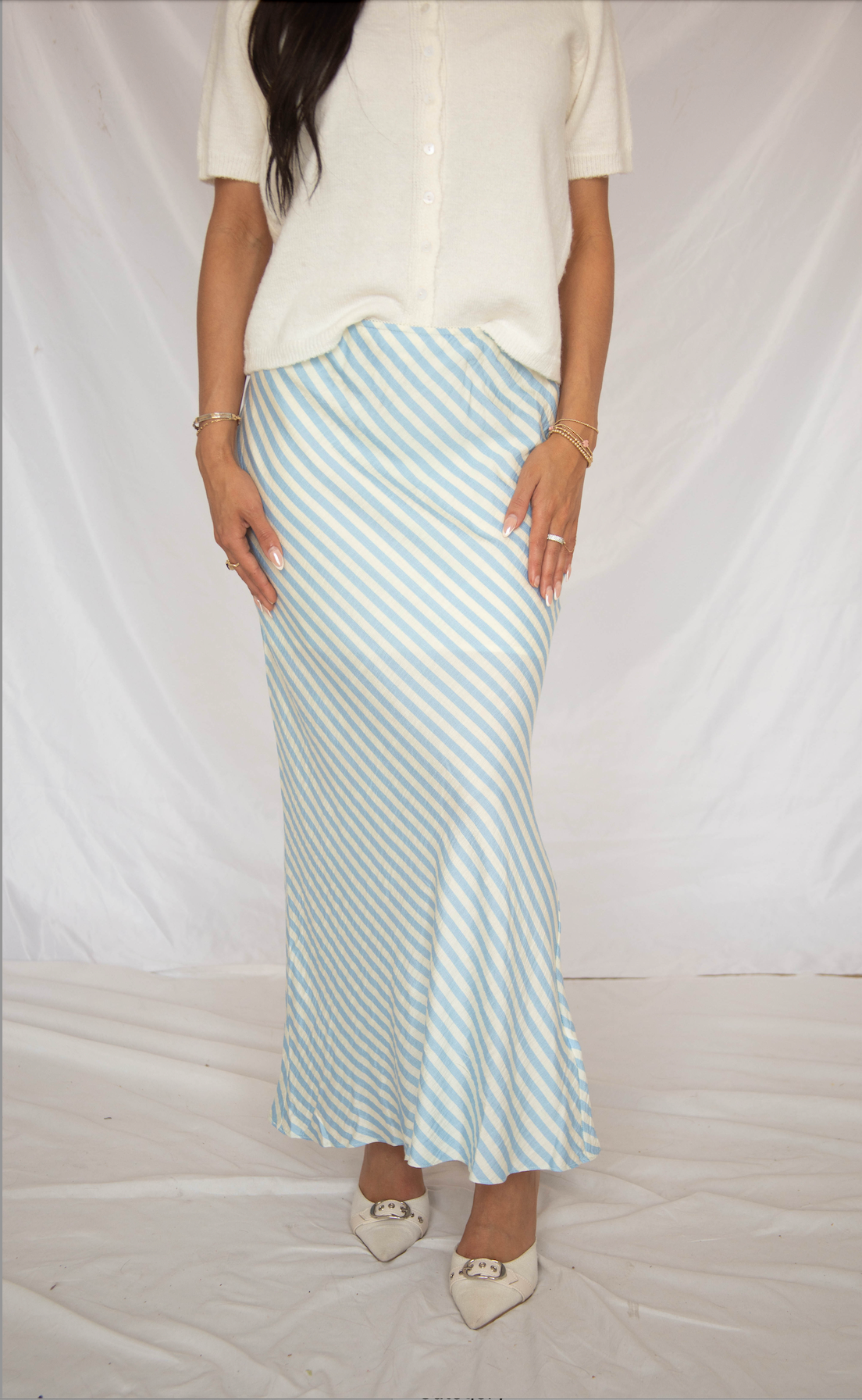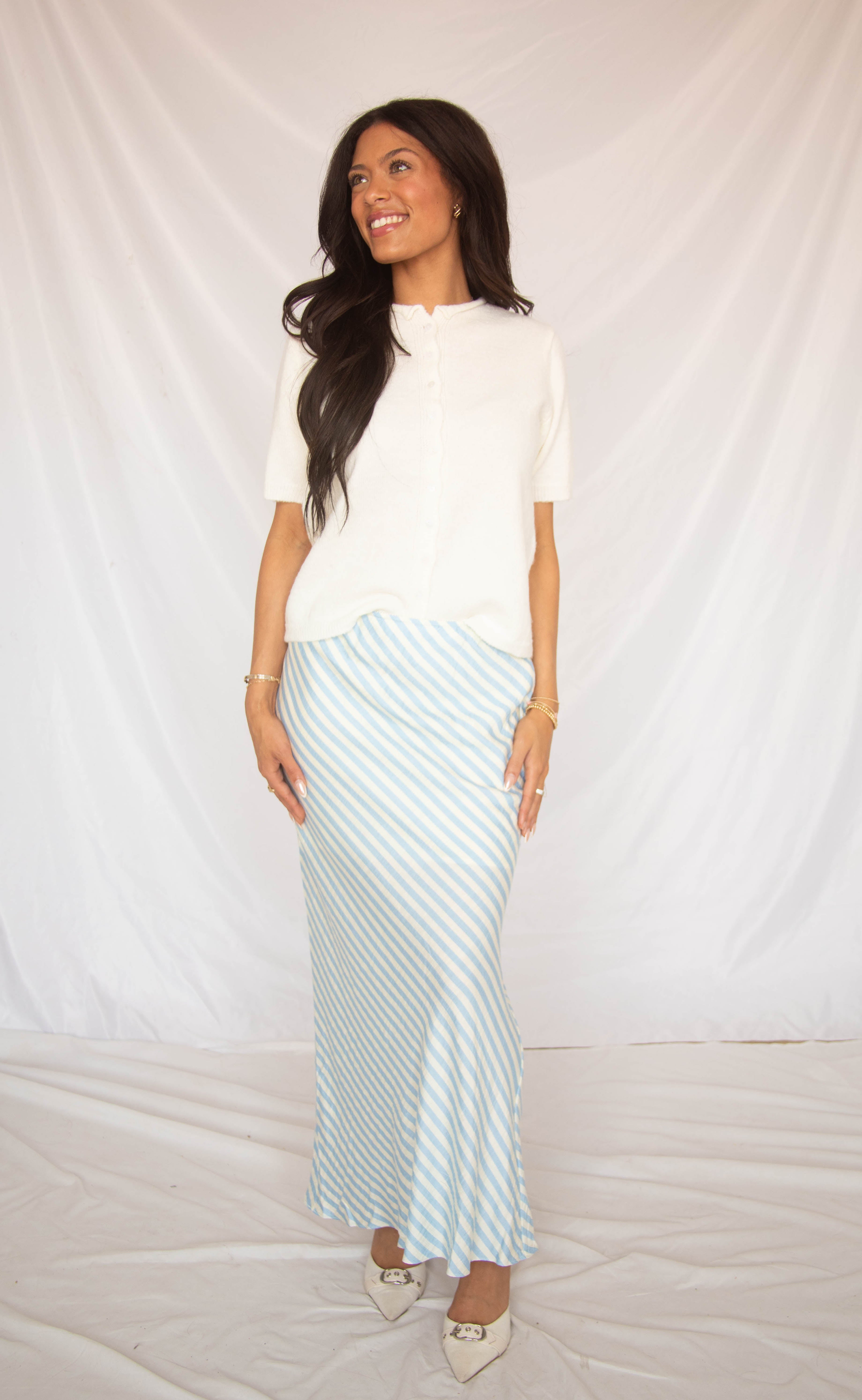 Bring a touch of seaside sophistication to your bridal wardrobe with the skirt that’s as effortless as a destination wedding. This gorgeous midi features a classic light blue and cream diagonal stripe pattern and a silky, figure-skimming fit that flows into a subtle flare. Perfectly paired with a cozy cardigan for a rainy day or a simple cami for your honeymoon, it’s a versatile piece that feels both timeless and totally on-trend.