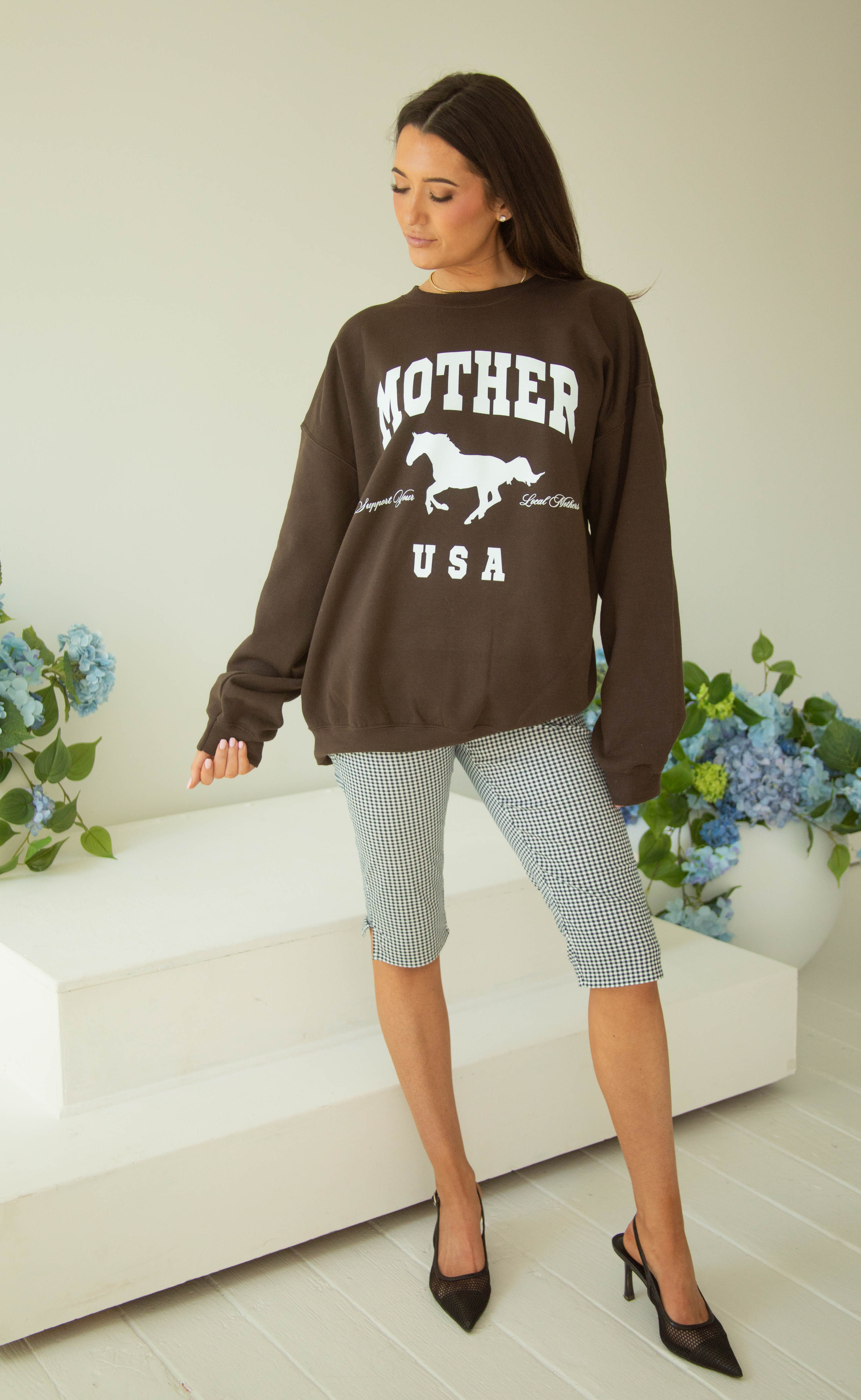 This oversized crewneck is serving major equestrian-cool vibes. Set in a rich, chocolatey espresso brown, it features a bold "MOTHER USA" varsity graphic centered by a majestic white stallion. It’s the perfect blend of western-inspired charm and modern streetwear.