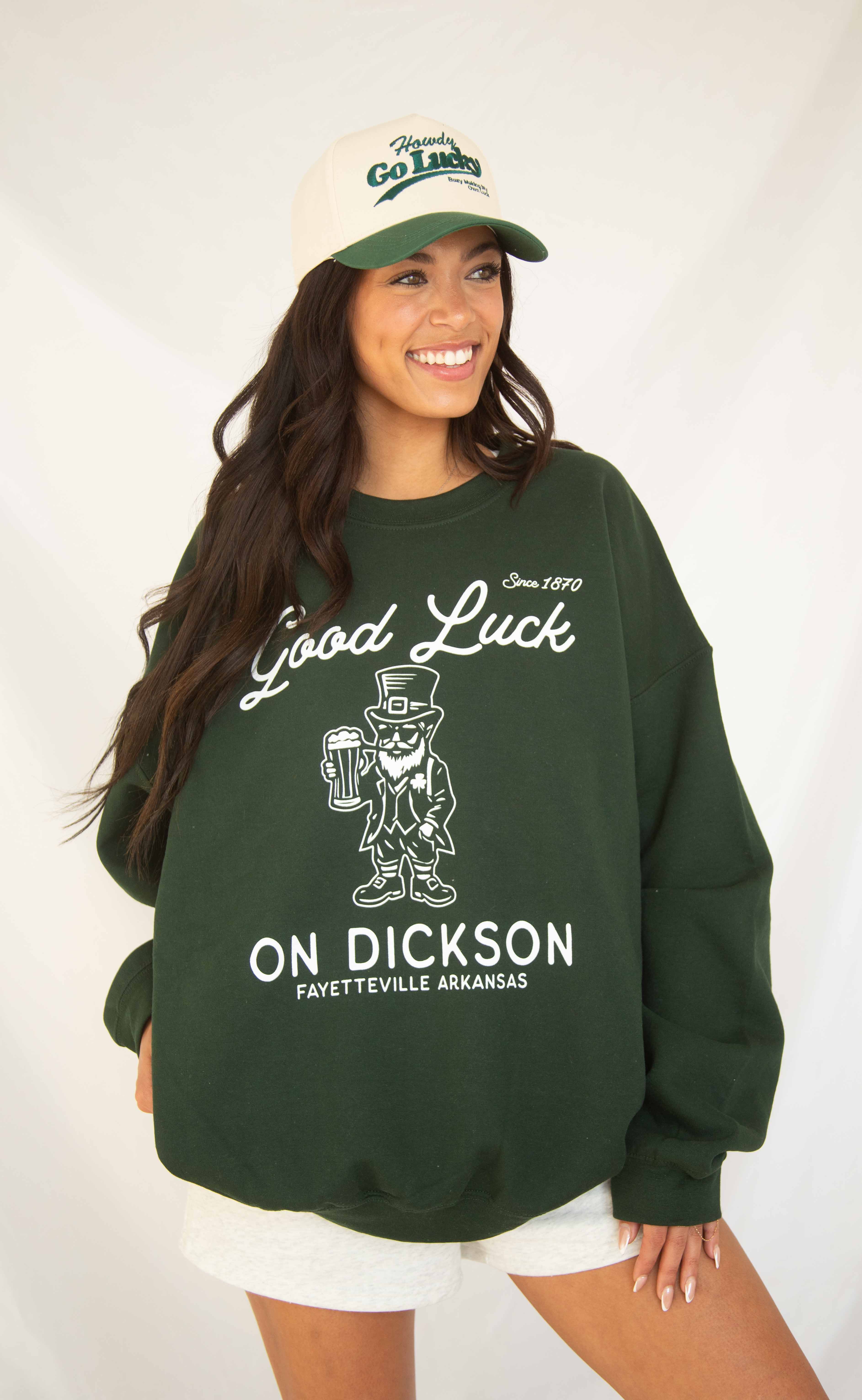 This deep green crewneck sweatshirt features a vintage-inspired “Good Luck on Dickson” graphic with a playful illustrated character and Fayetteville, Arkansas callout. Cozy, classic, and full of local charm, it’s an easy throw-on that feels festive without being over-the-top.