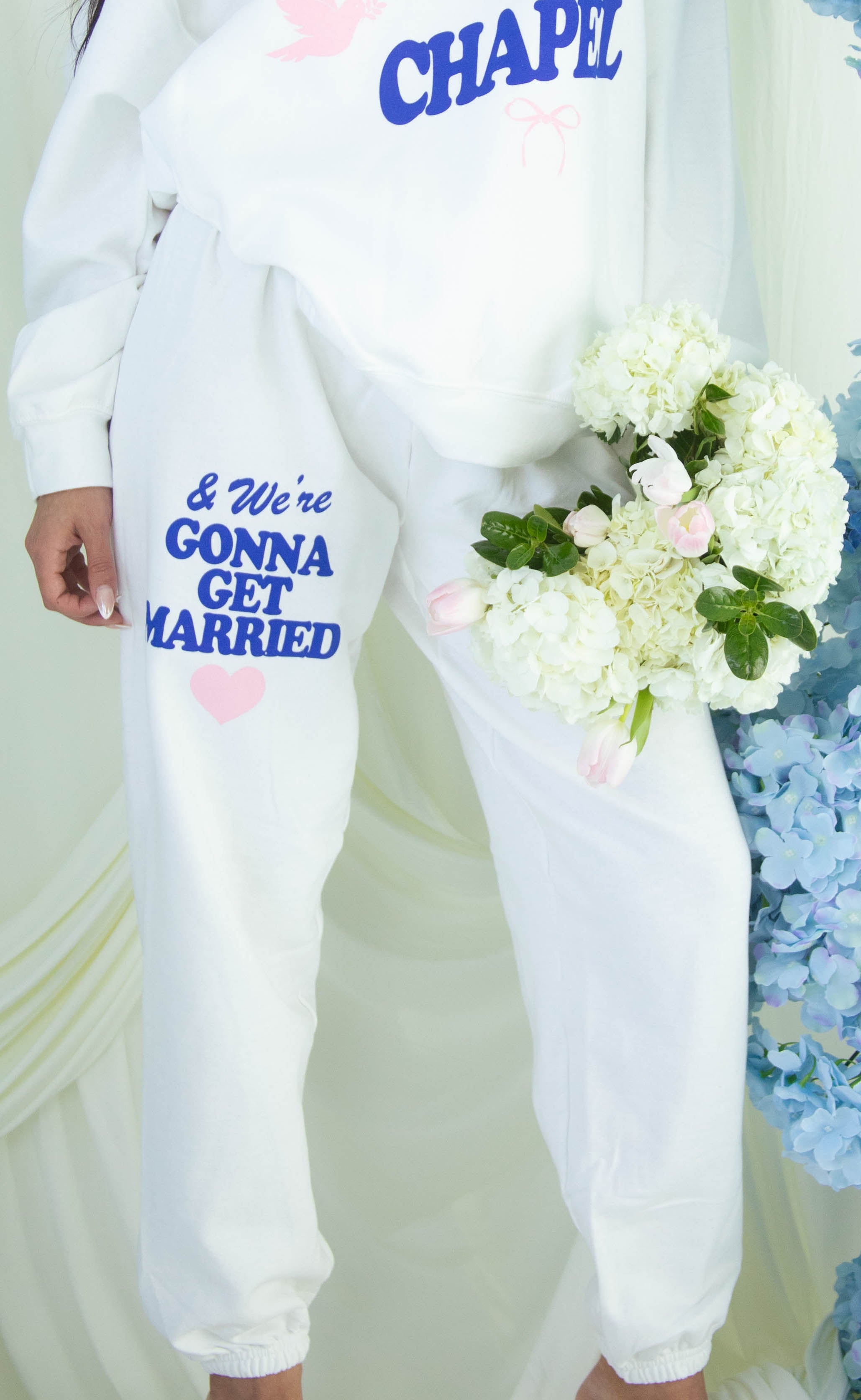 The iconic, original Going to the Chapel set is back to stay! These white sweatpants feature an elastic waist with a drawstring to get the perfect fit. Don't forget to add the matching sweatshirt and/or the all new tank top to your order.