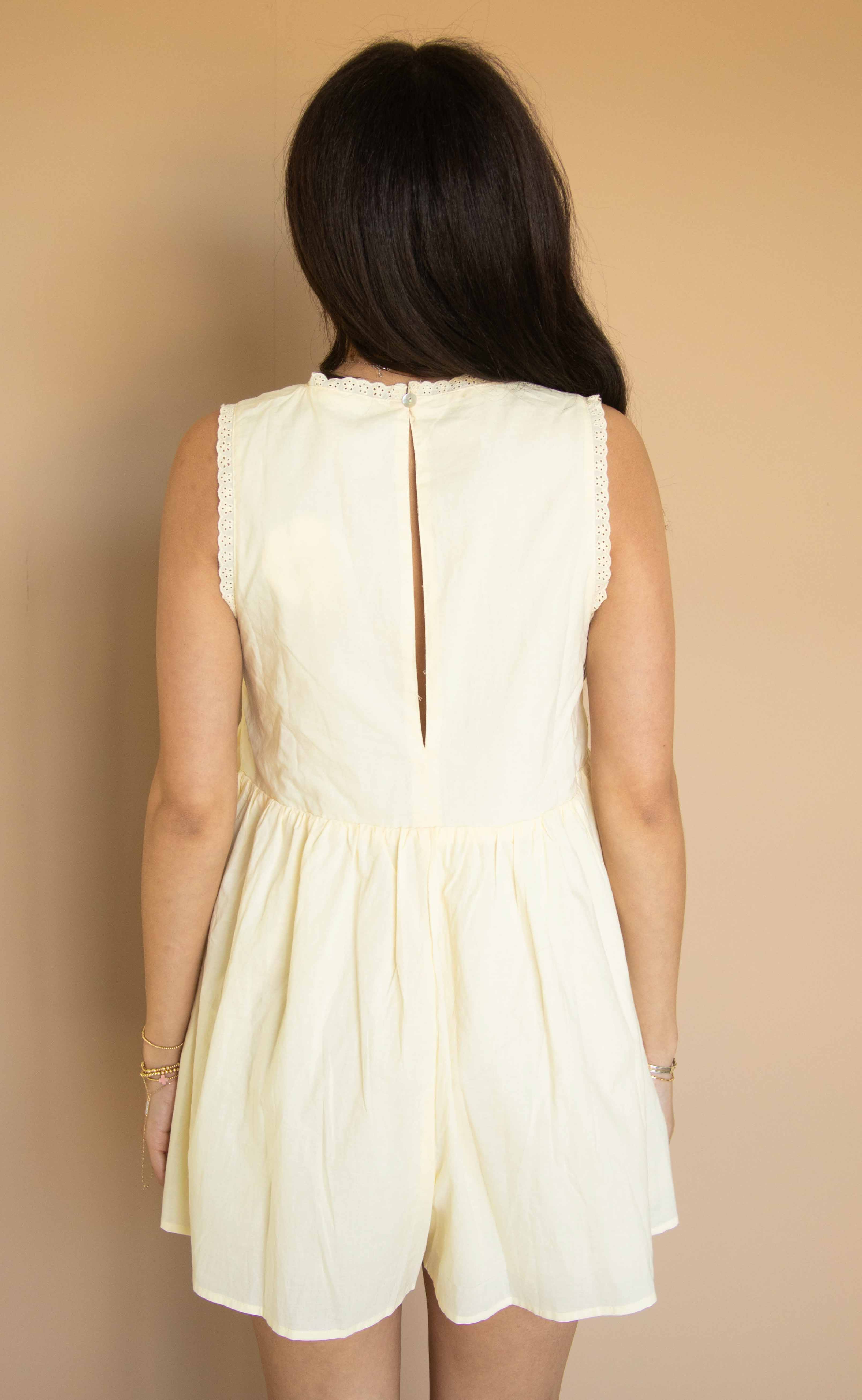 Light, airy, and made for sunshine days. This 100% cotton romper comes in the dreamiest pale yellow and features a flattering babydoll silhouette with scalloped eyelet lace details for an extra feminine touch. The relaxed fit keeps it easy and breathable, making it perfect for spring outings, brunch dates, and warm-weather getaways. It’s the kind of effortless one-and-done outfit you’ll reach for all season long.