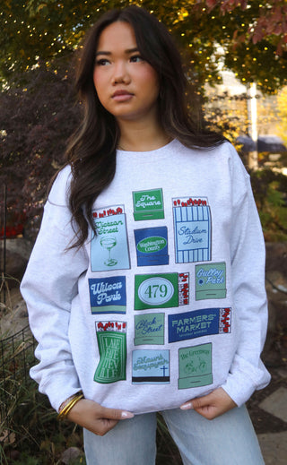 A vintage matchbook inspired crewneck with all our favorite things about Fayetteville from Dickson Street to The Greenway and beyond. You'll love the blue and green hues on this ash grey crewneck.