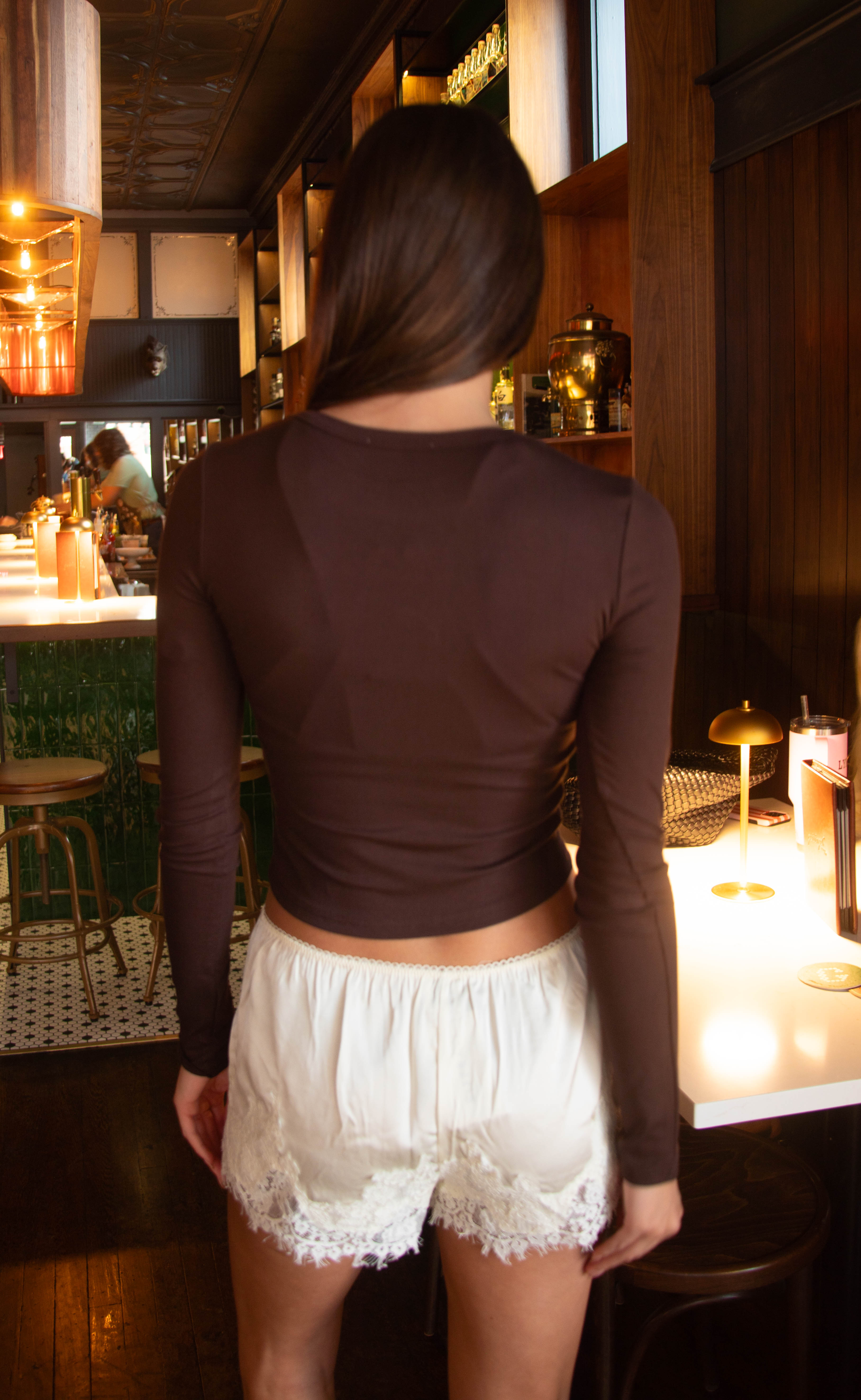 This fitted espresso brown long sleeve baby tee features a sparkling beaded espresso martini at the front center chest for the perfect blend of chic and cheeky. Soft, stretchy, and easy to style, this top is ideal for layering, nights out, or adding a spirited twist to your everyday lineup.
