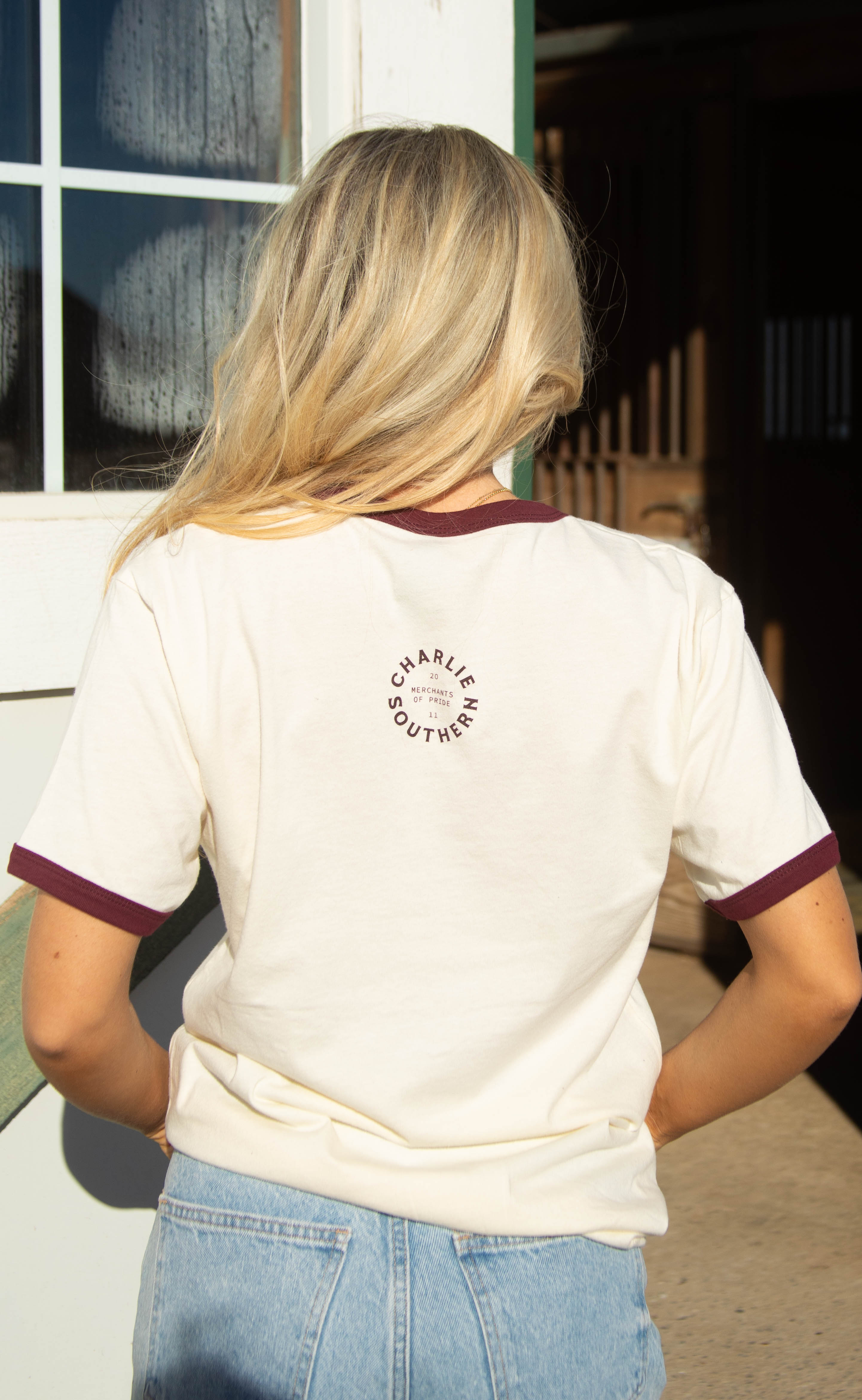This natural short-sleeve ringer tee brings a playful western twist to an everyday classic. Finished with maroon trim at the collar and sleeves, it features a horseshoe wine glass graphic with the phrase “feeling the country spirit” across the front. Easy, relaxed, and full of charm, it’s perfect for casual days, layering, and gifting.