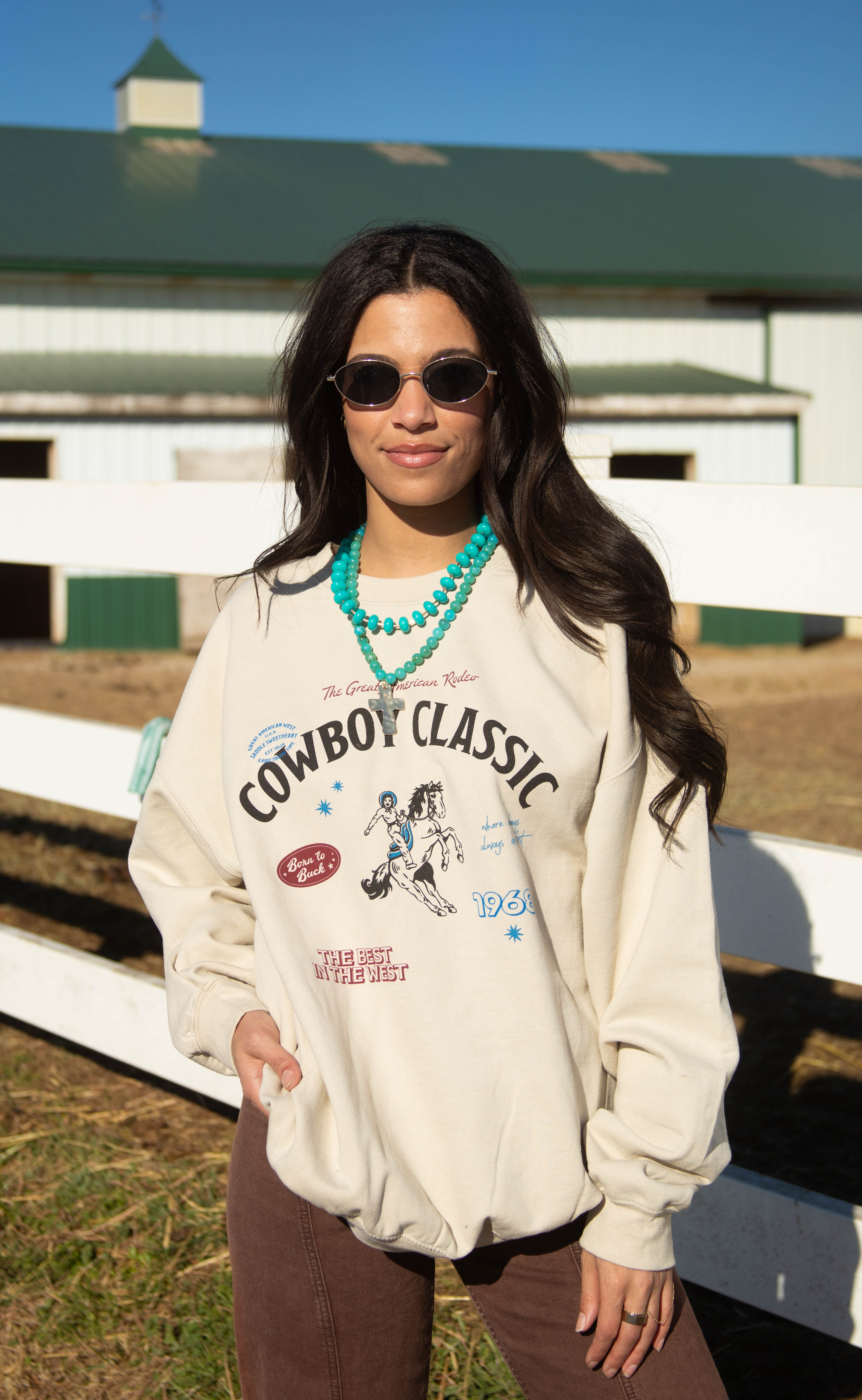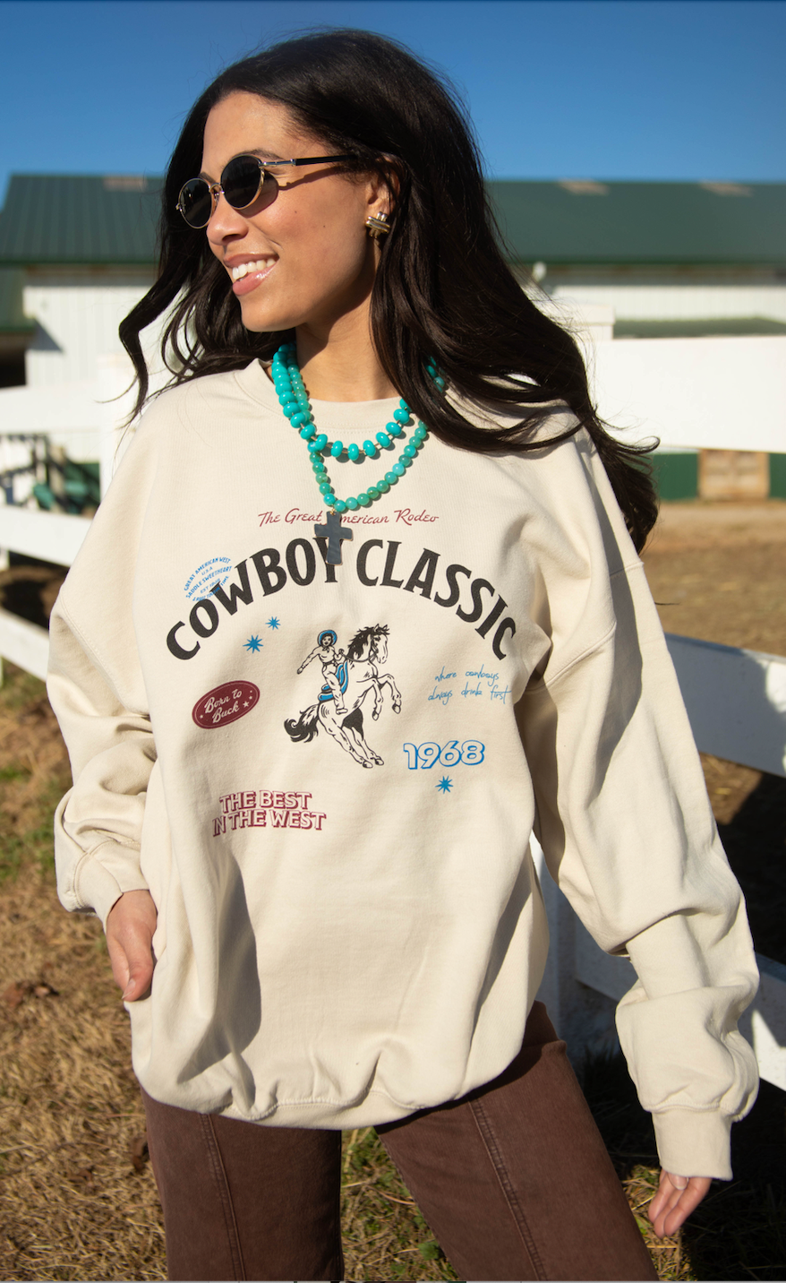 This sand-colored crewneck sweatshirt is the heart of the Cowboy Classic collection. Featuring “great american rodeo cowboy classic” across the front with playful details like “the best in the west,” “born to buck,” and “where cowboys always drink first,” it captures true western spirit with a nostalgic feel. Soft, comfortable, and easy to wear, it’s a standout piece made to define the collection.