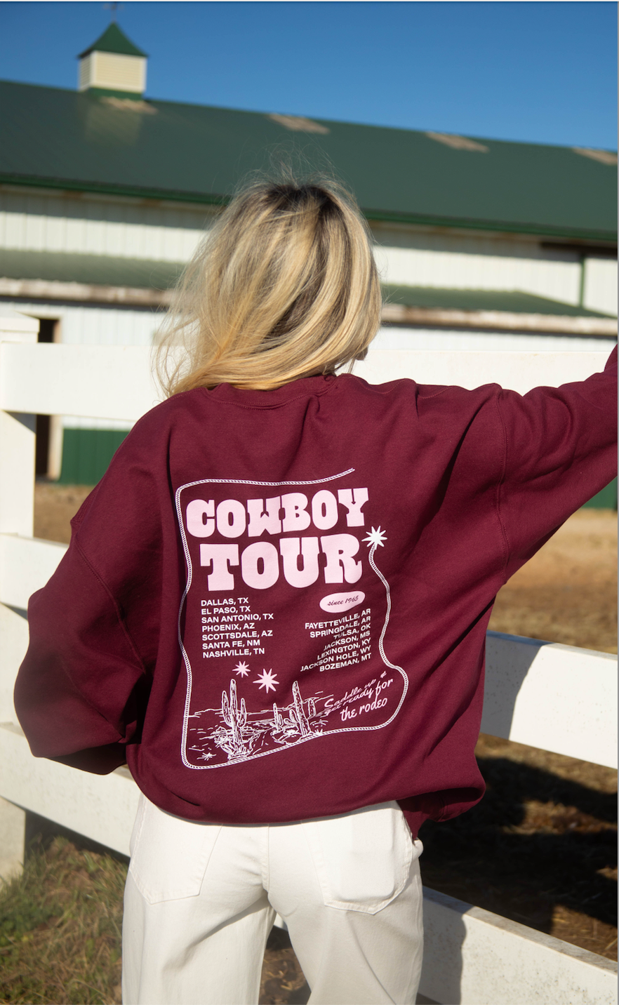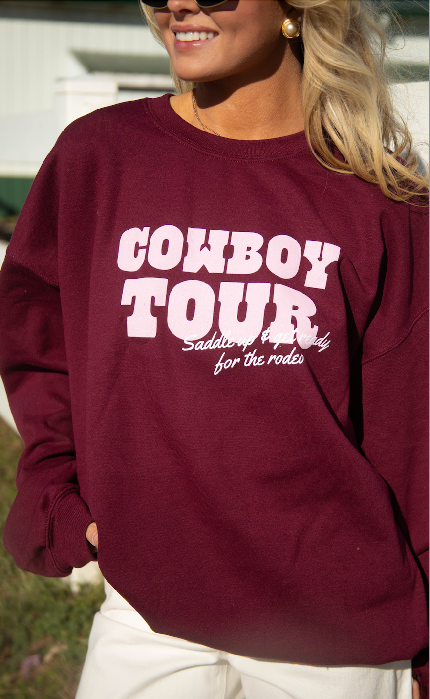 This Cowboy Tour sweatshirt brings concert merch energy with a western twist. Designed as a maroon crewneck, it features “cowboy tour” in pink across the front and a tour-style graphic on the back with city stops, finished with cactus artwork and lasso rope details. Soft, cozy, and full of personality, it’s made for everyday wear, layering, and gifting to any cowboy-at-heart.
