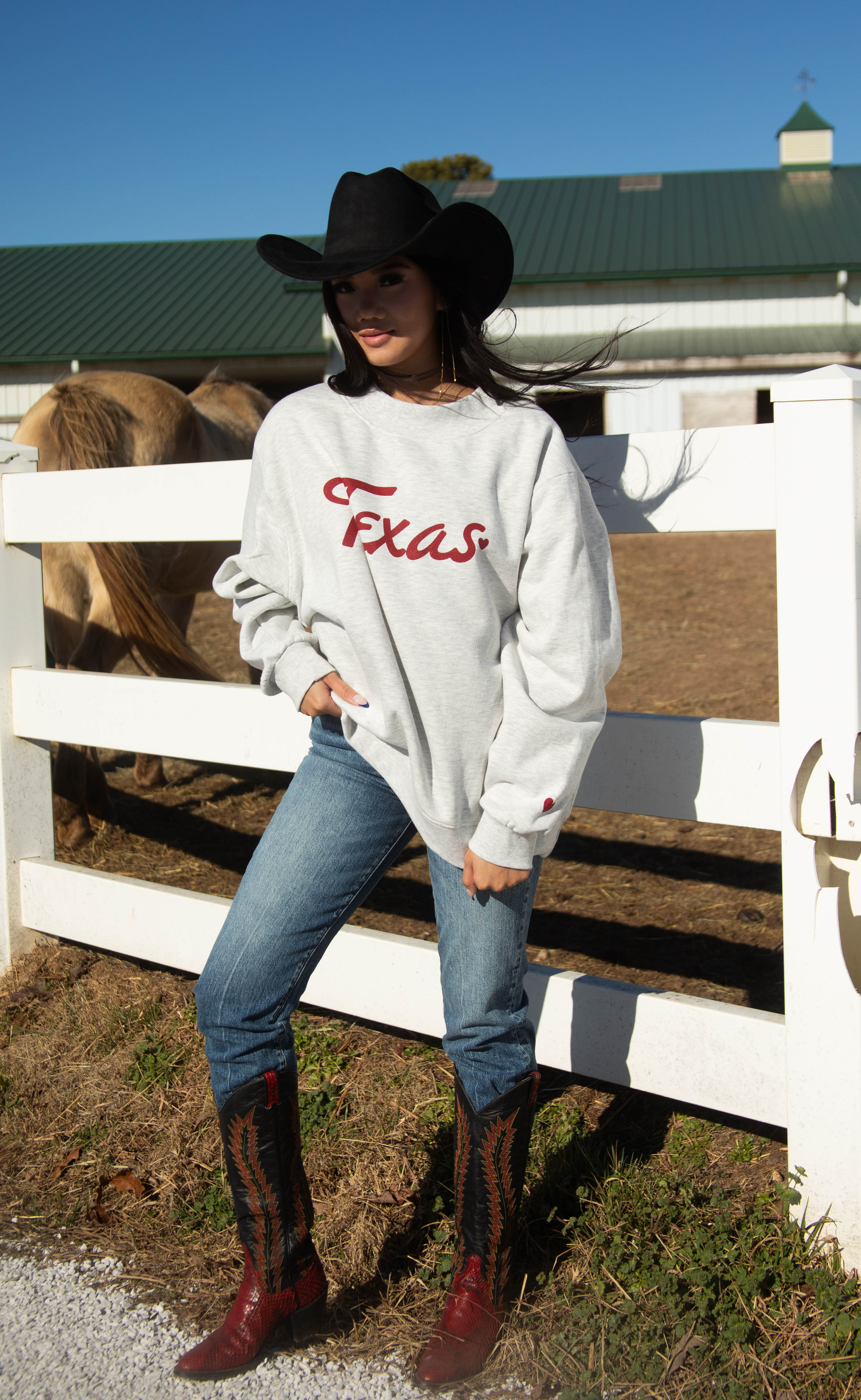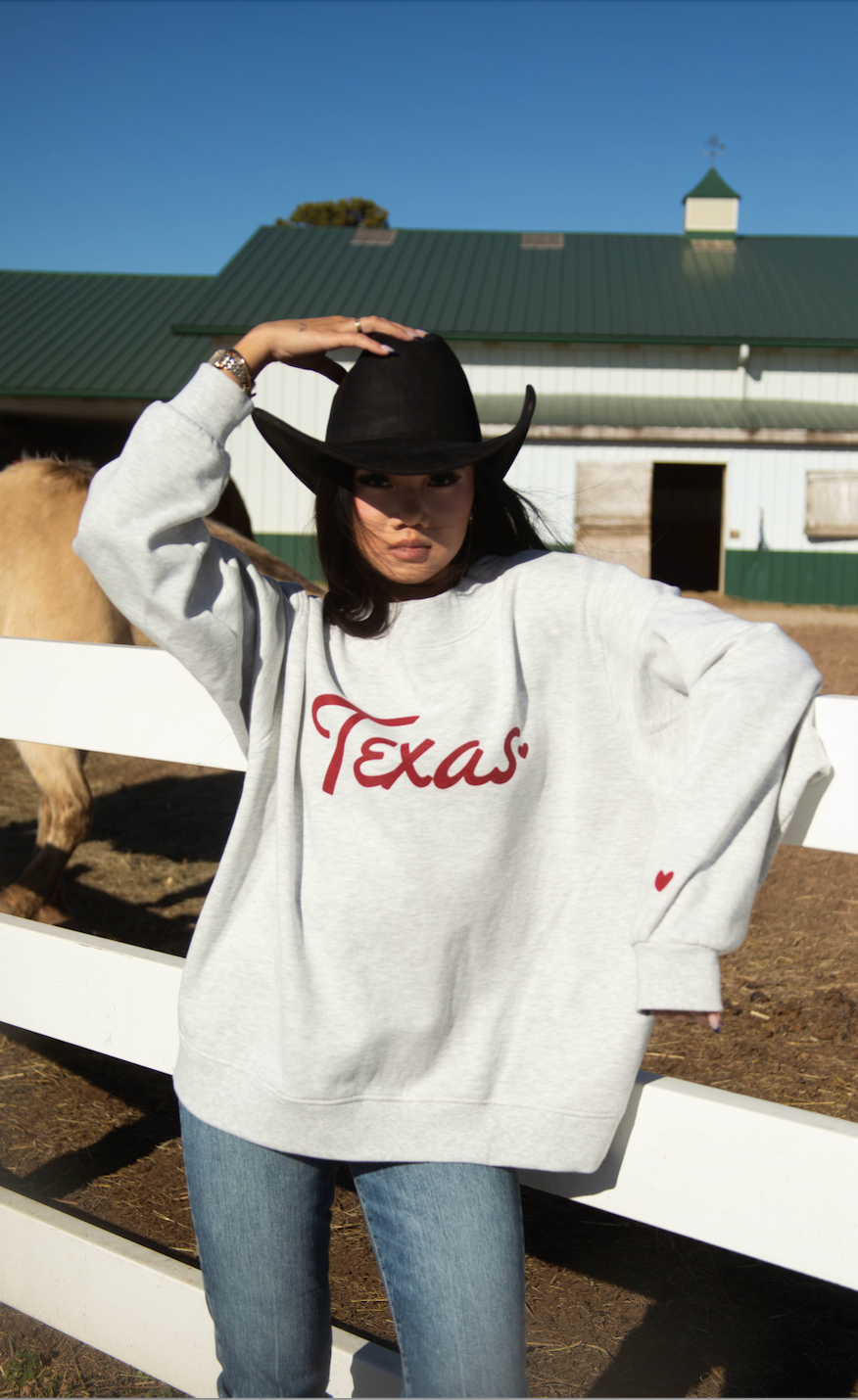 This ash grey mock neck sweatshirt blends classic comfort with a subtle western romance. Featuring “Texas” in soft script across the chest and a tiny heart detail on the sleeve, it’s an easy, elevated take on a go-to favorite. Cozy, timeless, and perfect for everyday wear or gifting.